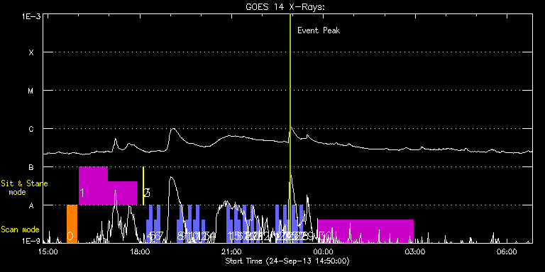 EIS Observation timeline overlay to GOES-Xray curve Code 1" 2" 40" 266" EIS Observations list for this event: STUDY ACRONYM ID DATE OBSERVED DESCRIPTION NOAA# TARGET 0 cam_artb_cds_a_lite | 36462 | 2013/09/24 15:37:10 | Large FOV scan in 20 mins to match IRI | | Active Region TIMELINE ID DATE OBSERVED FITS FILE XCEN (+W/-E) YCEN (+N/-S) DUR ----------------------------------------------------------------------------------------------------------------- 36462 | 2013/09/24 15:37:10.000 | eis_l0_20130924_153710.fits.gz | -236.29 | 43.30 | 19m26s 1 HPW021_VEL_001x512v1 | 36463 | 2013/09/24 16:00:27 | Sit-and-stare on moss/plage region whe | | Active Region TIMELINE ID DATE OBSERVED FITS FILE XCEN (+W/-E) YCEN (+N/-S) DUR ----------------------------------------------------------------------------------------------------------------- 36463 | 2013/09/24 16:00:27.000 | eis_l0_20130924_160027.fits.gz | -262.78 | 54.07 | 56m43s 36463 | 2013/09/24 16:57:17.000 | eis_l0_20130924_165717.fits.gz | -254.44 | 53.84 | 56m43s 2 Alignment_266 | 36422 | 2013/09/24 18:05:48 | Daily pointing monitoring | | Quiet Sun TIMELINE ID DATE OBSERVED FITS FILE XCEN (+W/-E) YCEN (+N/-S) DUR ----------------------------------------------------------------------------------------------------------------- 36422 | 2013/09/24 18:05:48.000 | eis_l0_20130924_180548.fits.gz | -132.49 | -0.50 | 1m22s 3 XRT_synop_AIA | 36423 | 2013/09/24 18:07:56 | Daily pointing monitoring | | Quiet Sun TIMELINE ID DATE OBSERVED FITS FILE XCEN (+W/-E) YCEN (+N/-S) DUR ----------------------------------------------------------------------------------------------------------------- 36423 | 2013/09/24 18:07:56.000 | eis_l0_20130924_180756.fits.gz | -132.57 | -0.35 | 10s 4 full_sun_slot_scan_2 | 36431 | 2013/09/24 18:12:27 | Full sun scan | | Quiet Sun TIMELINE ID DATE OBSERVED FITS FILE XCEN (+W/-E) YCEN (+N/-S) DUR ----------------------------------------------------------------------------------------------------------------- 36431 | 2013/09/24 18:12:27.000 | eis_l0_20130924_181227.fits.gz | 920.80 | 185.58 | 5m27s 5 full_sun_slot_scan_2 | 36432 | 2013/09/24 18:18:26 | Full sun scan | | Quiet Sun TIMELINE ID DATE OBSERVED FITS FILE XCEN (+W/-E) YCEN (+N/-S) DUR ----------------------------------------------------------------------------------------------------------------- 36432 | 2013/09/24 18:18:26.000 | eis_l0_20130924_181826.fits.gz | 920.80 | -286.50 | 5m27s 6 full_sun_slot_scan_2 | 36433 | 2013/09/24 18:28:13 | Full sun scan | 1849 | Quiet Sun TIMELINE ID DATE OBSERVED FITS FILE XCEN (+W/-E) YCEN (+N/-S) DUR ----------------------------------------------------------------------------------------------------------------- 36433 | 2013/09/24 18:28:13.000 | eis_l0_20130924_182813.fits.gz | 452.60 | 185.73 | 5m27s 7 full_sun_slot_scan_2 | 36434 | 2013/09/24 18:33:45 | Full sun scan | 1852 | Quiet Sun TIMELINE ID DATE OBSERVED FITS FILE XCEN (+W/-E) YCEN (+N/-S) DUR ----------------------------------------------------------------------------------------------------------------- 36434 | 2013/09/24 18:33:45.000 | eis_l0_20130924_183345.fits.gz | 452.68 | -286.58 | 5m27s 8 full_sun_slot_scan_2 | 36435 | 2013/09/24 19:13:13 | Full sun scan | | Quiet Sun TIMELINE ID DATE OBSERVED FITS FILE XCEN (+W/-E) YCEN (+N/-S) DUR ----------------------------------------------------------------------------------------------------------------- 36435 | 2013/09/24 19:13:13.000 | eis_l0_20130924_191313.fits.gz | -15.29 | 185.50 | 5m27s 9 full_sun_slot_scan_2 | 36436 | 2013/09/24 19:18:46 | Full sun scan | 1846 | Quiet Sun TIMELINE ID DATE OBSERVED FITS FILE XCEN (+W/-E) YCEN (+N/-S) DUR ----------------------------------------------------------------------------------------------------------------- 36436 | 2013/09/24 19:18:46.000 | eis_l0_20130924_191846.fits.gz | -15.29 | -286.42 | 5m26s 10 full_sun_slot_scan_2 | 36437 | 2013/09/24 19:29:13 | Full sun scan | 1850 | Quiet Sun TIMELINE ID DATE OBSERVED FITS FILE XCEN (+W/-E) YCEN (+N/-S) DUR ----------------------------------------------------------------------------------------------------------------- 36437 | 2013/09/24 19:29:13.000 | eis_l0_20130924_192913.fits.gz | -483.33 | 185.50 | 5m28s 11 full_sun_slot_scan_2 | 36438 | 2013/09/24 19:34:46 | Full sun scan | | Quiet Sun TIMELINE ID DATE OBSERVED FITS FILE XCEN (+W/-E) YCEN (+N/-S) DUR ----------------------------------------------------------------------------------------------------------------- 36438 | 2013/09/24 19:34:46.000 | eis_l0_20130924_193446.fits.gz | -483.26 | -286.42 | 5m27s 12 full_sun_slot_scan_2 | 36439 | 2013/09/24 19:45:13 | Full sun scan | | Quiet Sun TIMELINE ID DATE OBSERVED FITS FILE XCEN (+W/-E) YCEN (+N/-S) DUR ----------------------------------------------------------------------------------------------------------------- 36439 | 2013/09/24 19:45:13.000 | eis_l0_20130924_194513.fits.gz | -9884.69 | -9777.20 | 5m28s 13 full_sun_slot_scan_2 | 36440 | 2013/09/24 19:50:46 | Full sun scan | | Quiet Sun TIMELINE ID DATE OBSERVED FITS FILE XCEN (+W/-E) YCEN (+N/-S) DUR ----------------------------------------------------------------------------------------------------------------- 36440 | 2013/09/24 19:50:46.000 | eis_l0_20130924_195046.fits.gz | -9884.69 | -10249.20 | 5m26s 14 full_sun_slot_scan_2 | 36441 | 2013/09/24 20:01:13 | Full sun scan | | Quiet Sun TIMELINE ID DATE OBSERVED FITS FILE XCEN (+W/-E) YCEN (+N/-S) DUR ----------------------------------------------------------------------------------------------------------------- 36441 | 2013/09/24 20:01:13.000 | eis_l0_20130924_200113.fits.gz | 736.33 | 655.55 | 5m28s 15 full_sun_slot_scan_2 | 36442 | 2013/09/24 20:50:13 | Full sun scan | | Quiet Sun TIMELINE ID DATE OBSERVED FITS FILE XCEN (+W/-E) YCEN (+N/-S) DUR ----------------------------------------------------------------------------------------------------------------- 36442 | 2013/09/24 20:50:13.000 | eis_l0_20130924_205013.fits