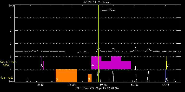 EIS Observation timeline overlay to GOES-Xray curve Code 1" 2" 40" 266" EIS Observations list for this event: STUDY ACRONYM ID DATE OBSERVED DESCRIPTION NOAA# TARGET 0 regcal070 | 36471 | 2013/09/27 06:02:12 | Flat field with overscan pixels (50*8) | | Engineering TIMELINE ID DATE OBSERVED FITS FILE XCEN (+W/-E) YCEN (+N/-S) DUR ----------------------------------------------------------------------------------------------------------------- 36471 | 2013/09/27 06:02:12.000 | eis_l0_20130927_060212.fits.gz | 14.51 | 205.27 | 2s 1 regcal074 | 36472 | 2013/09/27 06:12:12 | Dark exposures including overscan pixe | | Engineering TIMELINE ID DATE OBSERVED FITS FILE XCEN (+W/-E) YCEN (+N/-S) DUR ----------------------------------------------------------------------------------------------------------------- 36472 | 2013/09/27 06:12:12.000 | eis_l0_20130927_061212.fits.gz | 371.39 | 237.48 | 3m21s 2 Atlas_120 | 36483 | 2013/09/27 07:26:27 | Spectral atlas synoptic programme | | Quiet Sun TIMELINE ID DATE OBSERVED FITS FILE XCEN (+W/-E) YCEN (+N/-S) DUR ----------------------------------------------------------------------------------------------------------------- 36483 | 2013/09/27 07:26:27.000 | eis_l0_20130927_072627.fits.gz | 550.04 | -163.06 | 2h1m39s 3 cam_artb_cds_a_lite | 36478 | 2013/09/27 10:32:40 | Large FOV scan in 20 minutes to match | | Active Region TIMELINE ID DATE OBSERVED FITS FILE XCEN (+W/-E) YCEN (+N/-S) DUR ----------------------------------------------------------------------------------------------------------------- 36478 | 2013/09/27 10:32:40.000 | eis_l0_20130927_103240.fits.gz | 406.93 | 53.41 | 19m26s 4 HPW021_VEL_001x512v1 | 36479 | 2013/09/27 10:52:24 | Sit-and-stare on moss/plage region whe | | Active Region TIMELINE ID DATE OBSERVED FITS FILE XCEN (+W/-E) YCEN (+N/-S) DUR ----------------------------------------------------------------------------------------------------------------- 36479 | 2013/09/27 10:52:24.000 | eis_l0_20130927_105224.fits.gz | 409.94 | 53.64 | 56m43s 36479 | 2013/09/27 11:49:14.000 | eis_l0_20130927_114914.fits.gz | 417.82 | 54.11 | 56m42s 36479 | 2013/09/27 12:46:03.000 | eis_l0_20130927_124603.fits.gz | 425.70 | 54.49 | 56m42s 36479 | 2013/09/27 13:42:52.000 | eis_l0_20130927_134252.fits.gz | 433.50 | 55.11 | 56m43s 5 PRY_slot_contextLITE | 36473 | 2013/09/27 18:00:03 | Daily pointing monitoring | | Active Region TIMELINE ID DATE OBSERVED FITS FILE XCEN (+W/-E) YCEN (+N/-S) DUR ----------------------------------------------------------------------------------------------------------------- 36473 | 2013/09/27 18:00:03.000 | eis_l0_20130927_180003.fits.gz | -15.29 | -0.50 | 2m56s 6 Alignment_266 | 36474 | 2013/09/27 18:03:18 | Daily pointing monitoring | | Quiet Sun TIMELINE ID DATE OBSERVED FITS FILE XCEN (+W/-E) YCEN (+N/-S) DUR ----------------------------------------------------------------------------------------------------------------- 36474 | 2013/09/27 18:03:18.000 | eis_l0_20130927_180318.fits.gz | -132.57 | -0.65 | 1m22s 7 XRT_synop_AIA | 36475 | 2013/09/27 18:05:52 | Daily pointing monitoring | | Quiet Sun TIMELINE ID DATE OBSERVED FITS FILE XCEN (+W/-E) YCEN (+N/-S) DUR ----------------------------------------------------------------------------------------------------------------- 36475 | 2013/09/27 18:05:52.000 | eis_l0_20130927_180552.fits.gz | -132.49 | -0.42 | 10s : Check study information : Download file : View thumbnails For this event, also check for: