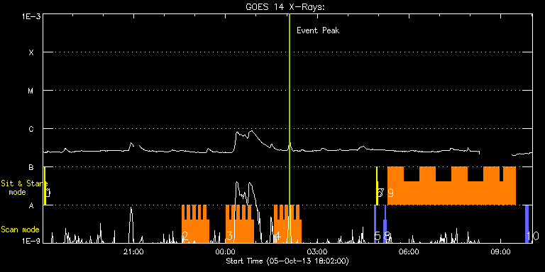 EIS Observation timeline overlay to GOES-Xray curve Code 1" 2" 40" 266" EIS Observations list for this event: STUDY ACRONYM ID DATE OBSERVED DESCRIPTION NOAA# TARGET 0 Alignment_266 | 36658 | 2013/10/05 18:04:27 | daily pointing monitoring | | Quiet Sun TIMELINE ID DATE OBSERVED FITS FILE XCEN (+W/-E) YCEN (+N/-S) DUR ----------------------------------------------------------------------------------------------------------------- 36658 | 2013/10/05 18:04:27.000 | eis_l0_20131005_180427.fits.gz | -132.49 | -0.50 | 1m22s 1 XRT_synop_AIA | 36659 | 2013/10/05 18:07:16 | daily pointing monitoring | | Quiet Sun TIMELINE ID DATE OBSERVED FITS FILE XCEN (+W/-E) YCEN (+N/-S) DUR ----------------------------------------------------------------------------------------------------------------- 36659 | 2013/10/05 18:07:16.000 | eis_l0_20131005_180716.fits.gz | -132.57 | -0.42 | 10s 2 HH_Flare+AR_180x152H | 36626 | 2013/10/05 22:34:08 | AR 11856 obs | 1856 | Flare TIMELINE ID DATE OBSERVED FITS FILE XCEN (+W/-E) YCEN (+N/-S) DUR ----------------------------------------------------------------------------------------------------------------- 36626 | 2013/10/05 22:34:08.000 | eis_l0_20131005_223408.fits.gz | -564.89 | 37.59 | 5m18s 36626 | 2013/10/05 22:39:29.000 | eis_l0_20131005_223929.fits.gz | -564.27 | 37.51 | 5m18s 36626 | 2013/10/05 22:44:50.000 | eis_l0_20131005_224450.fits.gz | -563.58 | 37.51 | 5m17s 36626 | 2013/10/05 22:50:10.000 | eis_l0_20131005_225010.fits.gz | -562.81 | 37.28 | 5m19s 36626 | 2013/10/05 22:55:31.000 | eis_l0_20131005_225531.fits.gz | -562.27 | 37.28 | 5m18s 36626 | 2013/10/05 23:00:52.000 | eis_l0_20131005_230052.fits.gz | -561.65 | 37.28 | 5m17s 36626 | 2013/10/05 23:06:12.000 | eis_l0_20131005_230612.fits.gz | -560.88 | 37.20 | 5m19s 36626 | 2013/10/05 23:11:33.000 | eis_l0_20131005_231133.fits.gz | -560.33 | 37.36 | 5m18s 36626 | 2013/10/05 23:16:54.000 | eis_l0_20131005_231654.fits.gz | -559.64 | 37.20 | 5m18s 36626 | 2013/10/05 23:22:14.000 | eis_l0_20131005_232214.fits.gz | -559.02 | 37.20 | 5m19s 3 HH_Flare+AR_180x152H | 36627 | 2013/10/06 00:01:06 | AR 11856 obs | 1856 | Flare TIMELINE ID DATE OBSERVED FITS FILE XCEN (+W/-E) YCEN (+N/-S) DUR ----------------------------------------------------------------------------------------------------------------- 36627 | 2013/10/06 00:01:06.000 | eis_l0_20131006_000106.fits.gz | -554.08 | 36.82 | 5m18s 36627 | 2013/10/06 00:06:26.000 | eis_l0_20131006_000626.fits.gz | -553.46 | 36.66 | 5m18s 36627 | 2013/10/06 00:11:47.000 | eis_l0_20131006_001147.fits.gz | -552.69 | 36.43 | 5m19s 36627 | 2013/10/06 00:17:09.000 | eis_l0_20131006_001709.fits.gz | -552.07 | 36.51 | 5m17s 36627 | 2013/10/06 00:22:29.000 | eis_l0_20131006_002229.fits.gz | -551.45 | 36.43 | 5m18s 36627 | 2013/10/06 00:27:50.000 | eis_l0_20131006_002750.fits.gz | -550.83 | 36.43 | 5m18s 36627 | 2013/10/06 00:33:11.000 | eis_l0_20131006_003311.fits.gz | -550.06 | 36.20 | 5m19s 36627 | 2013/10/06 00:38:32.000 | eis_l0_20131006_003832.fits.gz | -549.36 | 36.20 | 5m18s 36627 | 2013/10/06 00:43:53.000 | eis_l0_20131006_004353.fits.gz | -548.82 | 36.28 | 5m18s 36627 | 2013/10/06 00:49:14.000 | eis_l0_20131006_004914.fits.gz | -548.13 | 36.20 | 5m18s 4 HH_Flare+AR_180x152H | 36628 | 2013/10/06 01:35:38 | AR 11856 obs | 1856 | Flare TIMELINE ID DATE OBSERVED FITS FILE XCEN (+W/-E) YCEN (+N/-S) DUR ----------------------------------------------------------------------------------------------------------------- 36628 | 2013/10/06 01:35:38.000 | eis_l0_20131006_013538.fits.gz | -542.18 | 35.97 | 5m18s 36628 | 2013/10/06 01:40:59.000 | eis_l0_20131006_014059.fits.gz | -541.49 | 35.97 | 5m18s 36628 | 2013/10/06 01:46:20.000 | eis_l0_20131006_014620.fits.gz | -540.79 | 35.73 | 5m17s 36628 | 2013/10/06 01:51:40.000 | eis_l0_20131006_015140.fits.gz | -540.17 | 35.66 | 5m18s 36628 | 2013/10/06 01:57:01.000 | eis_l0_20131006_015701.fits.gz | -539.55 | 35.66 | 5m18s 36628 | 2013/10/06 02:02:22.000 | eis_l0_20131006_020222.fits.gz | -538.86 | 35.43 | 5m17s 36628 | 2013/10/06 02:07:42.000 | eis_l0_20131006_020742.fits.gz | -538.16 | 35.43 | 5m17s 36628 | 2013/10/06 02:13:02.000 | eis_l0_20131006_021302.fits.gz | -537.47 | 35.50 | 5m18s 36628 | 2013/10/06 02:18:23.000 | eis_l0_20131006_021823.fits.gz | -536.70 | 35.27 | 5m18s 36628 | 2013/10/06 02:23:44.000 | eis_l0_20131006_022344.fits.gz | -536.08 | 35.43 | 5m18s 5 PRY_slot_contextLITE | 36660 | 2013/10/06 04:51:39 | daily pointing monitoring | | Active Region TIMELINE ID DATE OBSERVED FITS FILE XCEN (+W/-E) YCEN (+N/-S) DUR ----------------------------------------------------------------------------------------------------------------- 36660 | 2013/10/06 04:51:39.000 | eis_l0_20131006_045139.fits.gz | -15.14 | -0.65 | 2m56s 6 Alignment_266 | 36661 | 2013/10/06 04:55:44 | daily pointing monitoring | | Quiet Sun TIMELINE ID DATE OBSERVED FITS FILE XCEN (+W/-E) YCEN (+N/-S) DUR ----------------------------------------------------------------------------------------------------------------- 36661 | 2013/10/06 04:55:44.000 | eis_l0_20131006_045544.fits.gz | -132.41 | -0.42 | 1m22s 7 XRT_synop_AIA | 36662 | 2013/10/06 04:58:56 | daily pointing monitoring | | Quiet Sun TIMELINE ID DATE OBSERVED FITS FILE XCEN (+W/-E) YCEN (+N/-S) DUR ----------------------------------------------------------------------------------------------------------------- 36662 | 2013/10/06 04:58:56.000 | eis_l0_20131006_045856.fits.gz | -132.49 | -0.58 | 10s 8 eis_eitwave_context | 36630 | 2013/10/06 05:10:26 | HOP 180 EIT wave study | 1855 | Quiet Sun TIMELINE ID DATE OBSERVED FITS FILE XCEN (+W/-E) YCEN (+N/-S) DUR ----------------------------------------------------------------------------------------------------------------- 36630 | 2013/10/06 05:10:26.000 | eis_l0_20131006_051026.fits.gz | 766.04 | -116.12 | 1m32s 36630 | 2013/10/06 05:12:02.000 | eis_l0_20131006_051202.fits.gz | 766.11 | -116.04 | 1m32s 36630 | 2013/10/06 05:13:38.000 | eis_l0_20131006_0513