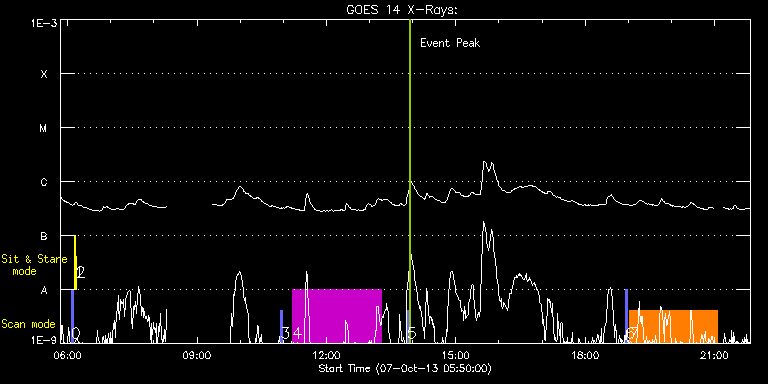 EIS Observation timeline overlay to GOES-Xray curve Code 1" 2" 40" 266" EIS Observations list for this event: STUDY ACRONYM ID DATE OBSERVED DESCRIPTION NOAA# TARGET 0 PRY_slot_contextLITE | 36663 | 2013/10/07 06:04:56 | daily pointing monitoring | 1857 | Active Region TIMELINE ID DATE OBSERVED FITS FILE XCEN (+W/-E) YCEN (+N/-S) DUR ----------------------------------------------------------------------------------------------------------------- 36663 | 2013/10/07 06:04:56.000 | eis_l0_20131007_060456.fits.gz | -15.29 | -0.27 | 2m56s 1 Alignment_266 | 36664 | 2013/10/07 06:09:02 | daily pointing monitoring | 1857 | Quiet Sun TIMELINE ID DATE OBSERVED FITS FILE XCEN (+W/-E) YCEN (+N/-S) DUR ----------------------------------------------------------------------------------------------------------------- 36664 | 2013/10/07 06:09:02.000 | eis_l0_20131007_060902.fits.gz | -132.49 | -0.35 | 1m22s 2 XRT_synop_AIA | 36665 | 2013/10/07 06:11:52 | daily pointing monitoring | 1857 | Quiet Sun TIMELINE ID DATE OBSERVED FITS FILE XCEN (+W/-E) YCEN (+N/-S) DUR ----------------------------------------------------------------------------------------------------------------- 36665 | 2013/10/07 06:11:52.000 | eis_l0_20131007_061152.fits.gz | -132.57 | -0.42 | 11s 3 PRY_slot_context_v3 | 36673 | 2013/10/07 10:56:32 | AR 11856 obs | 1856 | Active Region TIMELINE ID DATE OBSERVED FITS FILE XCEN (+W/-E) YCEN (+N/-S) DUR ----------------------------------------------------------------------------------------------------------------- 36673 | 2013/10/07 10:56:32.000 | eis_l0_20131007_105632.fits.gz | -284.34 | -49.02 | 2m56s 4 HPW021_VEL_240x512v1 | 36635 | 2013/10/07 11:13:00 | AR 11856 obs | 1856 | Active Region TIMELINE ID DATE OBSERVED FITS FILE XCEN (+W/-E) YCEN (+N/-S) DUR ----------------------------------------------------------------------------------------------------------------- 36635 | 2013/10/07 11:13:00.000 | eis_l0_20131007_111300.fits.gz | -226.88 | 94.83 | 2h3m49s 5 PRY_slot_context_v3 | 36674 | 2013/10/07 13:52:28 | AR 11856 obs | 1856 | Active Region TIMELINE ID DATE OBSERVED FITS FILE XCEN (+W/-E) YCEN (+N/-S) DUR ----------------------------------------------------------------------------------------------------------------- 36674 | 2013/10/07 13:52:28.000 | eis_l0_20131007_135228.fits.gz | -258.08 | -49.63 | 2m56s 6 PRY_slot_context_v3 | 36645 | 2013/10/07 18:56:05 | | | Active Region TIMELINE ID DATE OBSERVED FITS FILE XCEN (+W/-E) YCEN (+N/-S) DUR ----------------------------------------------------------------------------------------------------------------- 36645 | 2013/10/07 18:56:05.000 | eis_l0_20131007_185605.fits.gz | -9884.69 | -9963.20 | 2m56s 7 Atlas_120 | 36646 | 2013/10/07 19:02:03 | EIS spectral atlas synoptic program | | Quiet Sun TIMELINE ID DATE OBSERVED FITS FILE XCEN (+W/-E) YCEN (+N/-S) DUR ----------------------------------------------------------------------------------------------------------------- 36646 | 2013/10/07 19:02:03.000 | eis_l0_20131007_190203.fits.gz | -9899.90 | -9963.20 | 2h1m39s : Check study information : Download file : View thumbnails For this event, also check for: