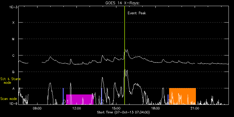 EIS Observation timeline overlay to GOES-Xray curve Code 1" 2" 40" 266" EIS Observations list for this event: STUDY ACRONYM ID DATE OBSERVED DESCRIPTION NOAA# TARGET 0 PRY_slot_context_v3 | 36673 | 2013/10/07 10:56:32 | AR 11856 obs | 1856 | Active Region TIMELINE ID DATE OBSERVED FITS FILE XCEN (+W/-E) YCEN (+N/-S) DUR ----------------------------------------------------------------------------------------------------------------- 36673 | 2013/10/07 10:56:32.000 | eis_l0_20131007_105632.fits.gz | -284.34 | -49.02 | 2m56s 1 HPW021_VEL_240x512v1 | 36635 | 2013/10/07 11:13:00 | AR 11856 obs | 1856 | Active Region TIMELINE ID DATE OBSERVED FITS FILE XCEN (+W/-E) YCEN (+N/-S) DUR ----------------------------------------------------------------------------------------------------------------- 36635 | 2013/10/07 11:13:00.000 | eis_l0_20131007_111300.fits.gz | -226.88 | 94.83 | 2h3m49s 2 PRY_slot_context_v3 | 36674 | 2013/10/07 13:52:28 | AR 11856 obs | 1856 | Active Region TIMELINE ID DATE OBSERVED FITS FILE XCEN (+W/-E) YCEN (+N/-S) DUR ----------------------------------------------------------------------------------------------------------------- 36674 | 2013/10/07 13:52:28.000 | eis_l0_20131007_135228.fits.gz | -258.08 | -49.63 | 2m56s 3 PRY_slot_context_v3 | 36645 | 2013/10/07 18:56:05 | | | Active Region TIMELINE ID DATE OBSERVED FITS FILE XCEN (+W/-E) YCEN (+N/-S) DUR ----------------------------------------------------------------------------------------------------------------- 36645 | 2013/10/07 18:56:05.000 | eis_l0_20131007_185605.fits.gz | -9884.69 | -9963.20 | 2m56s 4 Atlas_120 | 36646 | 2013/10/07 19:02:03 | EIS spectral atlas synoptic program | | Quiet Sun TIMELINE ID DATE OBSERVED FITS FILE XCEN (+W/-E) YCEN (+N/-S) DUR ----------------------------------------------------------------------------------------------------------------- 36646 | 2013/10/07 19:02:03.000 | eis_l0_20131007_190203.fits.gz | -9899.90 | -9963.20 | 2h1m39s : Check study information : Download file : View thumbnails For this event, also check for: