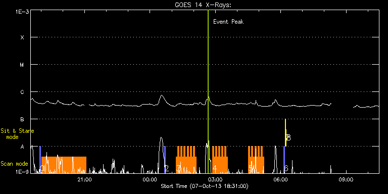 EIS Observation timeline overlay to GOES-Xray curve Code 1" 2" 40" 266" EIS Observations list for this event: STUDY ACRONYM ID DATE OBSERVED DESCRIPTION NOAA# TARGET 0 PRY_slot_context_v3 | 36645 | 2013/10/07 18:56:05 | | | Active Region TIMELINE ID DATE OBSERVED FITS FILE XCEN (+W/-E) YCEN (+N/-S) DUR ----------------------------------------------------------------------------------------------------------------- 36645 | 2013/10/07 18:56:05.000 | eis_l0_20131007_185605.fits.gz | -9884.69 | -9963.20 | 2m56s 1 Atlas_120 | 36646 | 2013/10/07 19:02:03 | EIS spectral atlas synoptic program | | Quiet Sun TIMELINE ID DATE OBSERVED FITS FILE XCEN (+W/-E) YCEN (+N/-S) DUR ----------------------------------------------------------------------------------------------------------------- 36646 | 2013/10/07 19:02:03.000 | eis_l0_20131007_190203.fits.gz | -9899.90 | -9963.20 | 2h1m39s 2 PRY_slot_context_v3 | 36675 | 2013/10/08 00:39:05 | AR 11856 obs | 1856 | Active Region TIMELINE ID DATE OBSERVED FITS FILE XCEN (+W/-E) YCEN (+N/-S) DUR ----------------------------------------------------------------------------------------------------------------- 36675 | 2013/10/08 00:39:05.000 | eis_l0_20131008_003905.fits.gz | -130.25 | -81.56 | 2m56s 3 HH_Flare_162x152 | 36649 | 2013/10/08 01:12:05 | AR 11856 obs | | Flare TIMELINE ID DATE OBSERVED FITS FILE XCEN (+W/-E) YCEN (+N/-S) DUR ----------------------------------------------------------------------------------------------------------------- 36649 | 2013/10/08 01:12:05.000 | eis_l0_20131008_011205.fits.gz | -122.22 | 29.51 | 4m10s 36649 | 2013/10/08 01:16:18.000 | eis_l0_20131008_011618.fits.gz | -121.61 | 29.44 | 4m11s 36649 | 2013/10/08 01:20:32.000 | eis_l0_20131008_012032.fits.gz | -120.91 | 29.51 | 4m10s 36649 | 2013/10/08 01:24:45.000 | eis_l0_20131008_012445.fits.gz | -120.29 | 29.59 | 4m11s 36649 | 2013/10/08 01:28:59.000 | eis_l0_20131008_012859.fits.gz | -119.68 | 29.36 | 4m11s 36649 | 2013/10/08 01:33:13.000 | eis_l0_20131008_013313.fits.gz | -118.98 | 29.36 | 4m10s 36649 | 2013/10/08 01:37:26.000 | eis_l0_20131008_013726.fits.gz | -118.36 | 29.36 | 4m11s 36649 | 2013/10/08 01:41:39.000 | eis_l0_20131008_014139.fits.gz | -117.67 | 29.36 | 4m11s 36649 | 2013/10/08 01:45:53.000 | eis_l0_20131008_014553.fits.gz | -117.05 | 29.36 | 4m10s 36649 | 2013/10/08 01:50:06.000 | eis_l0_20131008_015006.fits.gz | -116.43 | 29.51 | 4m11s 36649 | 2013/10/08 01:54:20.000 | eis_l0_20131008_015420.fits.gz | -115.74 | 29.44 | 4m10s 36649 | 2013/10/08 01:58:33.000 | eis_l0_20131008_015833.fits.gz | -115.20 | 29.44 | 4m11s 36649 | 2013/10/08 02:02:46.000 | eis_l0_20131008_020246.fits.gz | -114.42 | 29.36 | 4m11s 4 HH_Flare_162x152 | 36650 | 2013/10/08 02:51:42 | AR 11856 obs | 1856 | Flare TIMELINE ID DATE OBSERVED FITS FILE XCEN (+W/-E) YCEN (+N/-S) DUR ----------------------------------------------------------------------------------------------------------------- 36650 | 2013/10/08 02:51:42.000 | eis_l0_20131008_025142.fits.gz | -107.01 | 29.36 | 4m11s 36650 | 2013/10/08 02:55:55.000 | eis_l0_20131008_025555.fits.gz | -106.31 | 29.36 | 4m11s 36650 | 2013/10/08 03:00:09.000 | eis_l0_20131008_030009.fits.gz | -105.69 | 29.28 | 4m11s 36650 | 2013/10/08 03:04:23.000 | eis_l0_20131008_030423.fits.gz | -105.00 | 29.13 | 4m10s 36650 | 2013/10/08 03:08:36.000 | eis_l0_20131008_030836.fits.gz | -104.46 | 29.36 | 4m11s 36650 | 2013/10/08 03:12:49.000 | eis_l0_20131008_031249.fits.gz | -103.76 | 29.20 | 4m11s 36650 | 2013/10/08 03:17:02.000 | eis_l0_20131008_031702.fits.gz | -103.14 | 29.20 | 4m11s 36650 | 2013/10/08 03:21:16.000 | eis_l0_20131008_032116.fits.gz | -102.45 | 29.28 | 4m10s 36650 | 2013/10/08 03:25:29.000 | eis_l0_20131008_032529.fits.gz | -101.83 | 29.20 | 4m11s 36650 | 2013/10/08 03:29:43.000 | eis_l0_20131008_032943.fits.gz | -101.14 | 29.28 | 4m10s 5 HH_Flare_162x152 | 36656 | 2013/10/08 04:31:13 | AR 11856 obs | 1856 | Flare TIMELINE ID DATE OBSERVED FITS FILE XCEN (+W/-E) YCEN (+N/-S) DUR ----------------------------------------------------------------------------------------------------------------- 36656 | 2013/10/08 04:31:13.000 | eis_l0_20131008_043113.fits.gz | -91.71 | 29.20 | 4m11s 36656 | 2013/10/08 04:35:27.000 | eis_l0_20131008_043527.fits.gz | -91.02 | 29.28 | 4m10s 36656 | 2013/10/08 04:39:40.000 | eis_l0_20131008_043940.fits.gz | -90.32 | 29.28 | 4m11s 36656 | 2013/10/08 04:43:53.000 | eis_l0_20131008_044353.fits.gz | -89.70 | 29.05 | 4m11s 36656 | 2013/10/08 04:48:07.000 | eis_l0_20131008_044807.fits.gz | -89.09 | 29.05 | 4m11s 36656 | 2013/10/08 04:52:21.000 | eis_l0_20131008_045221.fits.gz | -88.47 | 29.20 | 4m10s 36656 | 2013/10/08 04:56:34.000 | eis_l0_20131008_045634.fits.gz | -87.77 | 28.97 | 4m11s 36656 | 2013/10/08 05:00:47.000 | eis_l0_20131008_050047.fits.gz | -87.15 | 28.97 | 4m11s 36656 | 2013/10/08 05:05:01.000 | eis_l0_20131008_050501.fits.gz | -86.46 | 29.05 | 4m10s 36656 | 2013/10/08 05:09:14.000 | eis_l0_20131008_050914.fits.gz | -85.84 | 29.13 | 4m11s 6 PRY_slot_contextLITE | 36666 | 2013/10/08 06:08:19 | daily pointing monitoring | 1856 | Active Region TIMELINE ID DATE OBSERVED FITS FILE XCEN (+W/-E) YCEN (+N/-S) DUR ----------------------------------------------------------------------------------------------------------------- 36666 | 2013/10/08 06:08:19.000 | eis_l0_20131008_060819.fits.gz | -15.14 | -0.50 | 2m56s 7 Alignment_266 | 36667 | 2013/10/08 06:12:26 | daily pointing monitoring | 1856 | Quiet Sun TIMELINE ID DATE OBSERVED FITS FILE XCEN (+W/-E) YCEN (+N/-S) DUR ----------------------------------------------------------------------------------------------------------------- 36667 | 2013/10/08 06:12:26.000 | eis_l0_20131008_061226.fits.gz | -132.57 | -0.42 | 1m21s 8 XRT_synop_AIA | 36668 | 2013/10/08 06:15:16 | daily pointing monitoring | 1856 | Quiet Sun TIMELINE ID DATE OBSERVED FITS FILE XCEN (+W/-E) YCEN (+N/-S) DUR --------------------------------------------------------------------------------------------