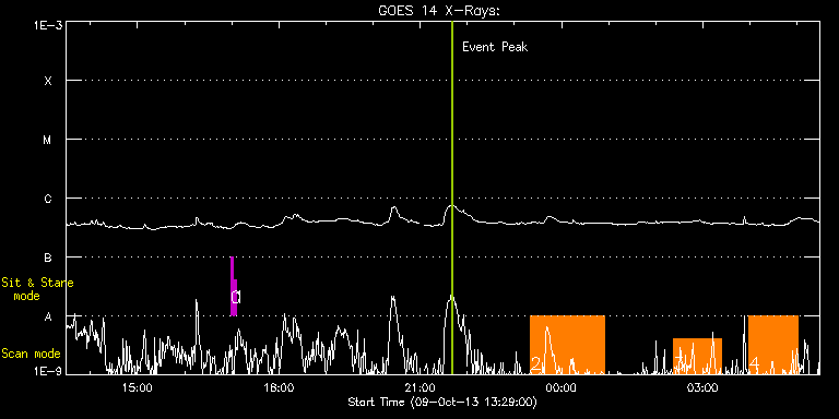 EIS Observation timeline overlay to GOES-Xray curve Code 1" 2" 40" 266" EIS Observations list for this event: STUDY ACRONYM ID DATE OBSERVED DESCRIPTION NOAA# TARGET 0 regcal071 | 36718 | 2013/10/09 16:58:41 | Dark exposures, CCD bottom rows (100s | | Engineering TIMELINE ID DATE OBSERVED FITS FILE XCEN (+W/-E) YCEN (+N/-S) DUR ----------------------------------------------------------------------------------------------------------------- 36718 | 2013/10/09 16:58:41.000 | eis_l0_20131009_165841.fits.gz | -0.55 | 574.51 | 3m22s 1 regcal071 | 36719 | 2013/10/09 17:03:11 | Dark exposures, CCD bottom rows (100s | | Engineering TIMELINE ID DATE OBSERVED FITS FILE XCEN (+W/-E) YCEN (+N/-S) DUR ----------------------------------------------------------------------------------------------------------------- 36719 | 2013/10/09 17:03:11.000 | eis_l0_20131009_170311.fits.gz | -0.55 | 574.43 | 3m22s 2 FullSunSlit_SI | 36725 | 2013/10/09 23:20:56 | AR 11856 & 11857 obs. | 1856 | Quiet Sun TIMELINE ID DATE OBSERVED FITS FILE XCEN (+W/-E) YCEN (+N/-S) DUR ----------------------------------------------------------------------------------------------------------------- 36725 | 2013/10/09 23:20:56.000 | eis_l0_20131009_232056.fits.gz | 325.74 | -81.91 | 1h33m25s 3 sta_plume_context | 36726 | 2013/10/10 02:22:30 | AR 11856 & 11857 obs. | 1856 | Coronal Hole TIMELINE ID DATE OBSERVED FITS FILE XCEN (+W/-E) YCEN (+N/-S) DUR ----------------------------------------------------------------------------------------------------------------- 36726 | 2013/10/10 02:22:30.000 | eis_l0_20131010_022230.fits.gz | 371.01 | -80.75 | 1h1m52s 4 sta_plume_context | 36727 | 2013/10/10 03:59:13 | AR 11856 & 11857 obs. | 1856 | Coronal Hole TIMELINE ID DATE OBSERVED FITS FILE XCEN (+W/-E) YCEN (+N/-S) DUR ----------------------------------------------------------------------------------------------------------------- 36727 | 2013/10/10 03:59:13.000 | eis_l0_20131010_035913.fits.gz | 384.45 | -79.74 | 1h1m52s : Check study information : Download file : View thumbnails For this event, also check for:
