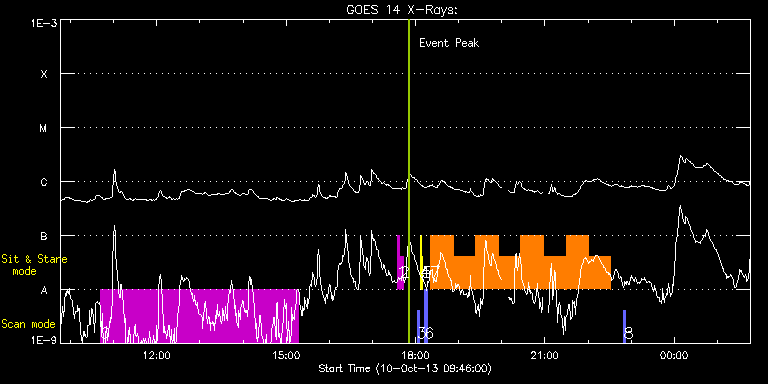 EIS Observation timeline overlay to GOES-Xray curve Code 1" 2" 40" 266" EIS Observations list for this event: STUDY ACRONYM ID DATE OBSERVED DESCRIPTION NOAA# TARGET 0 SK_CH_DIAG_320x384 | 36728 | 2013/10/10 10:41:34 | HOP 81 (Polar monitoring) | | Coronal Hole TIMELINE ID DATE OBSERVED FITS FILE XCEN (+W/-E) YCEN (+N/-S) DUR ----------------------------------------------------------------------------------------------------------------- 36728 | 2013/10/10 10:41:34.000 | eis_l0_20131010_104134.fits.gz | -4.97 | -922.60 | 4h35m37s 1 regcal071 | 36729 | 2013/10/10 17:34:42 | Dark exposures, CCD bottom rows (100s | | Engineering TIMELINE ID DATE OBSERVED FITS FILE XCEN (+W/-E) YCEN (+N/-S) DUR ----------------------------------------------------------------------------------------------------------------- 36729 | 2013/10/10 17:34:42.000 | eis_l0_20131010_173442.fits.gz | -0.63 | -1245.53 | 3m22s 2 regcal072 | 36730 | 2013/10/10 17:39:13 | Dark exposures, top CCD rows (100s exp | | Engineering TIMELINE ID DATE OBSERVED FITS FILE XCEN (+W/-E) YCEN (+N/-S) DUR ----------------------------------------------------------------------------------------------------------------- 36730 | 2013/10/10 17:39:13.000 | eis_l0_20131010_173913.fits.gz | -0.55 | -734.37 | 3m21s 3 PRY_slot_contextLITE | 36731 | 2013/10/10 18:02:34 | Daily pointing monitoring | | Active Region TIMELINE ID DATE OBSERVED FITS FILE XCEN (+W/-E) YCEN (+N/-S) DUR ----------------------------------------------------------------------------------------------------------------- 36731 | 2013/10/10 18:02:34.000 | eis_l0_20131010_180234.fits.gz | -15.14 | -0.27 | 2m56s 4 Alignment_266 | 36732 | 2013/10/10 18:06:18 | Daily pointing monitoring | | Quiet Sun TIMELINE ID DATE OBSERVED FITS FILE XCEN (+W/-E) YCEN (+N/-S) DUR ----------------------------------------------------------------------------------------------------------------- 36732 | 2013/10/10 18:06:18.000 | eis_l0_20131010_180618.fits.gz | -132.57 | -0.50 | 1m21s 5 XRT_synop_AIA | 36733 | 2013/10/10 18:08:57 | Daily pointing monitoring | | Quiet Sun TIMELINE ID DATE OBSERVED FITS FILE XCEN (+W/-E) YCEN (+N/-S) DUR ----------------------------------------------------------------------------------------------------------------- 36733 | 2013/10/10 18:08:57.000 | eis_l0_20131010_180857.fits.gz | -132.57 | -0.42 | 10s 6 eis_eitwave_context | 36734 | 2013/10/10 18:12:26 | HOP 180 (EIT wave) on AR11861 | | Quiet Sun TIMELINE ID DATE OBSERVED FITS FILE XCEN (+W/-E) YCEN (+N/-S) DUR ----------------------------------------------------------------------------------------------------------------- 36734 | 2013/10/10 18:12:26.000 | eis_l0_20131010_181226.fits.gz | -420.89 | -145.90 | 1m32s 36734 | 2013/10/10 18:14:02.000 | eis_l0_20131010_181402.fits.gz | -420.58 | -145.75 | 1m32s 36734 | 2013/10/10 18:15:38.000 | eis_l0_20131010_181538.fits.gz | -420.43 | -145.67 | 1m32s 7 eis_eitwave_obssns | 36735 | 2013/10/10 18:21:25 | HOP 180 (EIT wave) on AR11861 | | Quiet Sun TIMELINE ID DATE OBSERVED FITS FILE XCEN (+W/-E) YCEN (+N/-S) DUR ----------------------------------------------------------------------------------------------------------------- 36735 | 2013/10/10 18:21:25.000 | eis_l0_20131010_182125.fits.gz | -402.67 | -121.75 | 31m15s 36735 | 2013/10/10 18:52:43.000 | eis_l0_20131010_185243.fits.gz | -398.58 | -121.90 | 31m16s 36735 | 2013/10/10 19:24:03.000 | eis_l0_20131010_192403.fits.gz | -394.25 | -122.13 | 31m15s 36735 | 2013/10/10 19:55:22.000 | eis_l0_20131010_195522.fits.gz | -390.08 | -122.29 | 31m15s 36735 | 2013/10/10 20:26:40.000 | eis_l0_20131010_202640.fits.gz | -385.83 | -122.52 | 31m17s 36735 | 2013/10/10 20:58:00.000 | eis_l0_20131010_205800.fits.gz | -381.66 | -122.75 | 31m15s 36735 | 2013/10/10 21:29:19.000 | eis_l0_20131010_212919.fits.gz | -377.26 | -122.83 | 31m15s 36735 | 2013/10/10 22:00:38.000 | eis_l0_20131010_220038.fits.gz | -373.08 | -123.14 | 31m15s 8 eis_eitwave_context | 36768 | 2013/10/10 22:49:54 | HOP 180 (EIT wave) on AR11861 | | Quiet Sun TIMELINE ID DATE OBSERVED FITS FILE XCEN (+W/-E) YCEN (+N/-S) DUR ----------------------------------------------------------------------------------------------------------------- 36768 | 2013/10/10 22:49:54.000 | eis_l0_20131010_224954.fits.gz | -383.27 | -147.45 | 1m32s : Check study information : Download file : View thumbnails For this event, also check for: