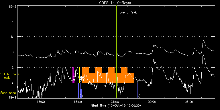 EIS Observation timeline overlay to GOES-Xray curve Code 1" 2" 40" 266" EIS Observations list for this event: STUDY ACRONYM ID DATE OBSERVED DESCRIPTION NOAA# TARGET 0 regcal071 | 36729 | 2013/10/10 17:34:42 | Dark exposures, CCD bottom rows (100s | | Engineering TIMELINE ID DATE OBSERVED FITS FILE XCEN (+W/-E) YCEN (+N/-S) DUR ----------------------------------------------------------------------------------------------------------------- 36729 | 2013/10/10 17:34:42.000 | eis_l0_20131010_173442.fits.gz | -0.63 | -1245.53 | 3m22s 1 regcal072 | 36730 | 2013/10/10 17:39:13 | Dark exposures, top CCD rows (100s exp | | Engineering TIMELINE ID DATE OBSERVED FITS FILE XCEN (+W/-E) YCEN (+N/-S) DUR ----------------------------------------------------------------------------------------------------------------- 36730 | 2013/10/10 17:39:13.000 | eis_l0_20131010_173913.fits.gz | -0.55 | -734.37 | 3m21s 2 PRY_slot_contextLITE | 36731 | 2013/10/10 18:02:34 | Daily pointing monitoring | | Active Region TIMELINE ID DATE OBSERVED FITS FILE XCEN (+W/-E) YCEN (+N/-S) DUR ----------------------------------------------------------------------------------------------------------------- 36731 | 2013/10/10 18:02:34.000 | eis_l0_20131010_180234.fits.gz | -15.14 | -0.27 | 2m56s 3 Alignment_266 | 36732 | 2013/10/10 18:06:18 | Daily pointing monitoring | | Quiet Sun TIMELINE ID DATE OBSERVED FITS FILE XCEN (+W/-E) YCEN (+N/-S) DUR ----------------------------------------------------------------------------------------------------------------- 36732 | 2013/10/10 18:06:18.000 | eis_l0_20131010_180618.fits.gz | -132.57 | -0.50 | 1m21s 4 XRT_synop_AIA | 36733 | 2013/10/10 18:08:57 | Daily pointing monitoring | | Quiet Sun TIMELINE ID DATE OBSERVED FITS FILE XCEN (+W/-E) YCEN (+N/-S) DUR ----------------------------------------------------------------------------------------------------------------- 36733 | 2013/10/10 18:08:57.000 | eis_l0_20131010_180857.fits.gz | -132.57 | -0.42 | 10s 5 eis_eitwave_context | 36734 | 2013/10/10 18:12:26 | HOP 180 (EIT wave) on AR11861 | | Quiet Sun TIMELINE ID DATE OBSERVED FITS FILE XCEN (+W/-E) YCEN (+N/-S) DUR ----------------------------------------------------------------------------------------------------------------- 36734 | 2013/10/10 18:12:26.000 | eis_l0_20131010_181226.fits.gz | -420.89 | -145.90 | 1m32s 36734 | 2013/10/10 18:14:02.000 | eis_l0_20131010_181402.fits.gz | -420.58 | -145.75 | 1m32s 36734 | 2013/10/10 18:15:38.000 | eis_l0_20131010_181538.fits.gz | -420.43 | -145.67 | 1m32s 6 eis_eitwave_obssns | 36735 | 2013/10/10 18:21:25 | HOP 180 (EIT wave) on AR11861 | | Quiet Sun TIMELINE ID DATE OBSERVED FITS FILE XCEN (+W/-E) YCEN (+N/-S) DUR ----------------------------------------------------------------------------------------------------------------- 36735 | 2013/10/10 18:21:25.000 | eis_l0_20131010_182125.fits.gz | -402.67 | -121.75 | 31m15s 36735 | 2013/10/10 18:52:43.000 | eis_l0_20131010_185243.fits.gz | -398.58 | -121.90 | 31m16s 36735 | 2013/10/10 19:24:03.000 | eis_l0_20131010_192403.fits.gz | -394.25 | -122.13 | 31m15s 36735 | 2013/10/10 19:55:22.000 | eis_l0_20131010_195522.fits.gz | -390.08 | -122.29 | 31m15s 36735 | 2013/10/10 20:26:40.000 | eis_l0_20131010_202640.fits.gz | -385.83 | -122.52 | 31m17s 36735 | 2013/10/10 20:58:00.000 | eis_l0_20131010_205800.fits.gz | -381.66 | -122.75 | 31m15s 36735 | 2013/10/10 21:29:19.000 | eis_l0_20131010_212919.fits.gz | -377.26 | -122.83 | 31m15s 36735 | 2013/10/10 22:00:38.000 | eis_l0_20131010_220038.fits.gz | -373.08 | -123.14 | 31m15s 7 eis_eitwave_context | 36768 | 2013/10/10 22:49:54 | HOP 180 (EIT wave) on AR11861 | | Quiet Sun TIMELINE ID DATE OBSERVED FITS FILE XCEN (+W/-E) YCEN (+N/-S) DUR ----------------------------------------------------------------------------------------------------------------- 36768 | 2013/10/10 22:49:54.000 | eis_l0_20131010_224954.fits.gz | -383.27 | -147.45 | 1m32s : Check study information : Download file : View thumbnails For this event, also check for: