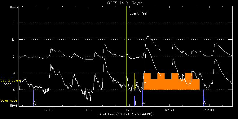 EIS Observation timeline overlay to GOES-Xray curve Code 1" 2" 40" 266" EIS Observations list for this event: STUDY ACRONYM ID DATE OBSERVED DESCRIPTION NOAA# TARGET 0 eis_eitwave_context | 36768 | 2013/10/10 22:49:54 | HOP 180 (EIT wave) on AR11861 | | Quiet Sun TIMELINE ID DATE OBSERVED FITS FILE XCEN (+W/-E) YCEN (+N/-S) DUR ----------------------------------------------------------------------------------------------------------------- 36768 | 2013/10/10 22:49:54.000 | eis_l0_20131010_224954.fits.gz | -383.27 | -147.45 | 1m32s 1 PRY_slot_contextLITE | 36737 | 2013/10/11 06:21:09 | Daily pointing monitoring | | Active Region TIMELINE ID DATE OBSERVED FITS FILE XCEN (+W/-E) YCEN (+N/-S) DUR ----------------------------------------------------------------------------------------------------------------- 36737 | 2013/10/11 06:21:09.000 | eis_l0_20131011_062109.fits.gz | -15.29 | -0.58 | 2m56s 2 Alignment_266 | 36738 | 2013/10/11 06:24:45 | Daily pointing monitoring | | Quiet Sun TIMELINE ID DATE OBSERVED FITS FILE XCEN (+W/-E) YCEN (+N/-S) DUR ----------------------------------------------------------------------------------------------------------------- 36738 | 2013/10/11 06:24:45.000 | eis_l0_20131011_062445.fits.gz | -132.49 | -0.50 | 1m22s 3 XRT_synop_AIA | 36739 | 2013/10/11 06:27:26 | Daily pointing monitoring | | Quiet Sun TIMELINE ID DATE OBSERVED FITS FILE XCEN (+W/-E) YCEN (+N/-S) DUR ----------------------------------------------------------------------------------------------------------------- 36739 | 2013/10/11 06:27:26.000 | eis_l0_20131011_062726.fits.gz | -132.41 | -0.50 | 10s 4 eis_eitwave_context | 36769 | 2013/10/11 06:57:38 | HOP 180 (EIT wave) on AR11861 | | Quiet Sun TIMELINE ID DATE OBSERVED FITS FILE XCEN (+W/-E) YCEN (+N/-S) DUR ----------------------------------------------------------------------------------------------------------------- 36769 | 2013/10/11 06:57:38.000 | eis_l0_20131011_065738.fits.gz | -315.45 | -150.23 | 1m32s 36769 | 2013/10/11 06:59:14.000 | eis_l0_20131011_065914.fits.gz | -315.29 | -150.15 | 1m32s 36769 | 2013/10/11 07:00:49.000 | eis_l0_20131011_070049.fits.gz | -315.06 | -150.38 | 1m32s 5 eis_eitwave_obssns | 36773 | 2013/10/11 07:04:22 | HOP 180 (EIT wave) on AR11861 | | Quiet Sun TIMELINE ID DATE OBSERVED FITS FILE XCEN (+W/-E) YCEN (+N/-S) DUR ----------------------------------------------------------------------------------------------------------------- 36773 | 2013/10/11 07:04:22.000 | eis_l0_20131011_070422.fits.gz | -285.56 | -126.23 | 31m15s 36773 | 2013/10/11 07:35:41.000 | eis_l0_20131011_073541.fits.gz | -281.15 | -126.23 | 31m15s 36773 | 2013/10/11 08:06:59.000 | eis_l0_20131011_080659.fits.gz | -276.75 | -126.38 | 31m15s 36773 | 2013/10/11 08:38:18.000 | eis_l0_20131011_083818.fits.gz | -272.35 | -126.61 | 31m15s 36773 | 2013/10/11 09:09:36.000 | eis_l0_20131011_090936.fits.gz | -267.87 | -126.46 | 31m15s 36773 | 2013/10/11 09:40:54.000 | eis_l0_20131011_094054.fits.gz | -263.39 | -126.61 | 31m15s 36773 | 2013/10/11 10:12:13.000 | eis_l0_20131011_101213.fits.gz | -258.91 | -127.15 | 31m14s 36773 | 2013/10/11 10:43:31.000 | eis_l0_20131011_104331.fits.gz | -254.43 | -127.23 | 31m16s 6 eis_eitwave_context | 36771 | 2013/10/11 11:31:11 | HOP 180 (EIT wave) on AR11861 | | Quiet Sun TIMELINE ID DATE OBSERVED FITS FILE XCEN (+W/-E) YCEN (+N/-S) DUR ----------------------------------------------------------------------------------------------------------------- 36771 | 2013/10/11 11:31:11.000 | eis_l0_20131011_113111.fits.gz | -276.59 | -151.46 | 1m32s 36771 | 2013/10/11 11:32:47.000 | eis_l0_20131011_113247.fits.gz | -276.28 | -151.46 | 1m32s 36771 | 2013/10/11 11:34:23.000 | eis_l0_20131011_113423.fits.gz | -276.05 | -151.39 | 1m32s : Check study information : Download file : View thumbnails For this event, also check for: