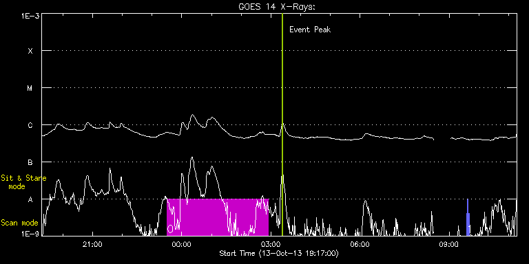 EIS Observation timeline overlay to GOES-Xray curve Code 1" 2" 40" 266" EIS Observations list for this event: STUDY ACRONYM ID DATE OBSERVED DESCRIPTION NOAA# TARGET 0 HPW021_VEL_240x512v2 | 36779 | 2013/10/13 23:30:27 | Quiet Sun Observation with IRIS | | Quiet Sun TIMELINE ID DATE OBSERVED FITS FILE XCEN (+W/-E) YCEN (+N/-S) DUR ----------------------------------------------------------------------------------------------------------------- 36779 | 2013/10/13 23:30:27.000 | eis_l0_20131013_233027.fits.gz | -121.13 | -23.44 | 3h23m47s 1 eis_eitwave_context | 36790 | 2013/10/14 09:35:34 | Context for HOP 180 on AR11861 | | Quiet Sun TIMELINE ID DATE OBSERVED FITS FILE XCEN (+W/-E) YCEN (+N/-S) DUR ----------------------------------------------------------------------------------------------------------------- 36790 | 2013/10/14 09:35:34.000 | eis_l0_20131014_093534.fits.gz | 351.52 | -47.16 | 1m32s 36790 | 2013/10/14 09:37:10.000 | eis_l0_20131014_093710.fits.gz | 351.75 | -47.16 | 1m32s 36790 | 2013/10/14 09:38:46.000 | eis_l0_20131014_093846.fits.gz | 351.98 | -47.01 | 1m32s : Check study information : Download file : View thumbnails For this event, also check for: