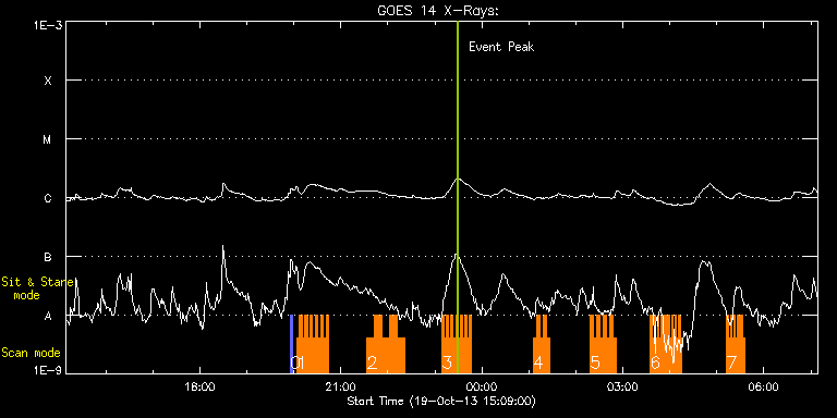 EIS Observation timeline overlay to GOES-Xray curve Code 1" 2" 40" 266" EIS Observations list for this event: STUDY ACRONYM ID DATE OBSERVED DESCRIPTION NOAA# TARGET 0 PRY_slot_context_v3 | 36868 | 2013/10/19 19:55:34 | AR11871 obs, with IRIS | 1869 | Active Region TIMELINE ID DATE OBSERVED FITS FILE XCEN (+W/-E) YCEN (+N/-S) DUR ----------------------------------------------------------------------------------------------------------------- 36868 | 2013/10/19 19:55:34.000 | eis_l0_20131019_195534.fits.gz | -74.94 | 242.59 | 2m56s 1 madj_ar_small | 36853 | 2013/10/19 20:03:59 | AR11871 obs, with IRIS, high cadence | | Active Region TIMELINE ID DATE OBSERVED FITS FILE XCEN (+W/-E) YCEN (+N/-S) DUR ----------------------------------------------------------------------------------------------------------------- 36853 | 2013/10/19 20:03:59.000 | eis_l0_20131019_200359.fits.gz | -58.12 | 242.67 | 3m18s 36853 | 2013/10/19 20:07:20.000 | eis_l0_20131019_200720.fits.gz | -57.58 | 242.67 | 3m19s 36853 | 2013/10/19 20:10:42.000 | eis_l0_20131019_201042.fits.gz | -57.11 | 242.75 | 3m18s 36853 | 2013/10/19 20:14:03.000 | eis_l0_20131019_201403.fits.gz | -56.57 | 242.75 | 3m18s 36853 | 2013/10/19 20:17:24.000 | eis_l0_20131019_201724.fits.gz | -56.11 | 242.75 | 3m19s 36853 | 2013/10/19 20:20:46.000 | eis_l0_20131019_202046.fits.gz | -55.57 | 242.67 | 3m18s 36853 | 2013/10/19 20:24:07.000 | eis_l0_20131019_202407.fits.gz | -55.10 | 242.82 | 3m19s 36853 | 2013/10/19 20:27:29.000 | eis_l0_20131019_202729.fits.gz | -54.49 | 242.59 | 3m19s 36853 | 2013/10/19 20:30:51.000 | eis_l0_20131019_203051.fits.gz | -54.10 | 242.59 | 3m18s 36853 | 2013/10/19 20:34:12.000 | eis_l0_20131019_203412.fits.gz | -53.71 | 242.82 | 3m18s 36853 | 2013/10/19 20:37:34.000 | eis_l0_20131019_203734.fits.gz | -53.10 | 242.82 | 3m18s 36853 | 2013/10/19 20:40:55.000 | eis_l0_20131019_204055.fits.gz | -52.63 | 242.75 | 3m18s 2 madj_ar | 36852 | 2013/10/19 21:33:39 | AR11871 obs, with IRIS | | Active Region TIMELINE ID DATE OBSERVED FITS FILE XCEN (+W/-E) YCEN (+N/-S) DUR ----------------------------------------------------------------------------------------------------------------- 36852 | 2013/10/19 21:33:39.000 | eis_l0_20131019_213339.fits.gz | -44.91 | 242.67 | 9m42s 36852 | 2013/10/19 21:43:24.000 | eis_l0_20131019_214324.fits.gz | -43.44 | 242.82 | 9m42s 36852 | 2013/10/19 21:53:09.000 | eis_l0_20131019_215309.fits.gz | -41.97 | 242.59 | 9m42s 36852 | 2013/10/19 22:02:54.000 | eis_l0_20131019_220254.fits.gz | -40.50 | 242.67 | 9m42s 36852 | 2013/10/19 22:12:39.000 | eis_l0_20131019_221239.fits.gz | -39.11 | 242.67 | 9m42s 3 HH_Flare_180x152f | 36864 | 2013/10/19 23:09:24 | AR11871 obs, with IRIS | 1869 | Flare TIMELINE ID DATE OBSERVED FITS FILE XCEN (+W/-E) YCEN (+N/-S) DUR ----------------------------------------------------------------------------------------------------------------- 36864 | 2013/10/19 23:09:24.000 | eis_l0_20131019_230924.fits.gz | -41.93 | 226.75 | 2m48s 36864 | 2013/10/19 23:12:15.000 | eis_l0_20131019_231215.fits.gz | -41.62 | 226.82 | 2m47s 36864 | 2013/10/19 23:15:05.000 | eis_l0_20131019_231505.fits.gz | -41.00 | 226.75 | 2m48s 36864 | 2013/10/19 23:17:56.000 | eis_l0_20131019_231756.fits.gz | -40.61 | 226.75 | 2m48s 36864 | 2013/10/19 23:20:46.000 | eis_l0_20131019_232046.fits.gz | -40.23 | 226.59 | 2m48s 36864 | 2013/10/19 23:23:37.000 | eis_l0_20131019_232337.fits.gz | -39.76 | 226.75 | 2m48s 36864 | 2013/10/19 23:26:28.000 | eis_l0_20131019_232628.fits.gz | -39.38 | 226.75 | 2m48s 36864 | 2013/10/19 23:29:18.000 | eis_l0_20131019_232918.fits.gz | -38.99 | 226.82 | 2m48s 36864 | 2013/10/19 23:32:09.000 | eis_l0_20131019_233209.fits.gz | -38.53 | 226.67 | 2m48s 36864 | 2013/10/19 23:35:00.000 | eis_l0_20131019_233500.fits.gz | -38.14 | 226.67 | 2m49s 36864 | 2013/10/19 23:37:51.000 | eis_l0_20131019_233751.fits.gz | -37.83 | 226.82 | 2m48s 36864 | 2013/10/19 23:40:42.000 | eis_l0_20131019_234042.fits.gz | -37.29 | 226.90 | 2m48s 36864 | 2013/10/19 23:43:33.000 | eis_l0_20131019_234333.fits.gz | -36.90 | 226.75 | 2m47s 4 HH_Flare_162x152 | 36847 | 2013/10/20 01:05:13 | AR11865 at SW-limb | | Flare TIMELINE ID DATE OBSERVED FITS FILE XCEN (+W/-E) YCEN (+N/-S) DUR ----------------------------------------------------------------------------------------------------------------- 36847 | 2013/10/20 01:05:13.000 | eis_l0_20131020_010513.fits.gz | 863.79 | -500.45 | 4m10s 36847 | 2013/10/20 01:09:26.000 | eis_l0_20131020_010926.fits.gz | 863.79 | -500.37 | 4m11s 36847 | 2013/10/20 01:13:40.000 | eis_l0_20131020_011340.fits.gz | 863.79 | -500.52 | 4m10s 36847 | 2013/10/20 01:17:53.000 | eis_l0_20131020_011753.fits.gz | 863.72 | -500.52 | 4m11s 36847 | 2013/10/20 01:22:07.000 | eis_l0_20131020_012207.fits.gz | 863.72 | -500.45 | 4m10s 5 HH_Flare_162x152 | 36854 | 2013/10/20 02:18:29 | AR11865 at SW-limb | | Flare TIMELINE ID DATE OBSERVED FITS FILE XCEN (+W/-E) YCEN (+N/-S) DUR ----------------------------------------------------------------------------------------------------------------- 36854 | 2013/10/20 02:18:29.000 | eis_l0_20131020_021829.fits.gz | 863.79 | -500.60 | 4m11s 36854 | 2013/10/20 02:22:42.000 | eis_l0_20131020_022242.fits.gz | 863.72 | -500.60 | 4m11s 36854 | 2013/10/20 02:26:56.000 | eis_l0_20131020_022656.fits.gz | 863.72 | -500.60 | 4m10s 36854 | 2013/10/20 02:31:09.000 | eis_l0_20131020_023109.fits.gz | 863.72 | -500.52 | 4m11s 36854 | 2013/10/20 02:35:23.000 | eis_l0_20131020_023523.fits.gz | 863.72 | -500.52 | 4m10s 36854 | 2013/10/20 02:39:36.000 | eis_l0_20131020_023936.fits.gz | 863.72 | -500.45 | 4m10s 36854 | 2013/10/20 02:43:49.000 | eis_l0_20131020_024349.fits.gz | 863.72 | -500.45 | 4m11s 36854 | 2013/10/20 02:48:03.000 | eis_l0_20131020_024803.fits.gz | 863.72 | -500.45 | 4m10s 6 Cam_flare_diag | 36855 | 2013/10/20 03:35:13 | AR11865 at SW-limb | | Flare TIMELINE ID DATE OBSERVED FITS FILE XCEN (+W/-E) YCEN (+N/-S) DUR ---------------------------------------------------------