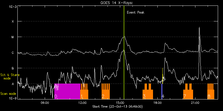 EIS Observation timeline overlay to GOES-Xray curve Code 1" 2" 40" 266" EIS Observations list for this event: STUDY ACRONYM ID DATE OBSERVED DESCRIPTION NOAA# TARGET 0 HPW021_VEL_240x512v1 | 36943 | 2013/10/22 09:45:27 | AR11875 obs | 1875 | Active Region TIMELINE ID DATE OBSERVED FITS FILE XCEN (+W/-E) YCEN (+N/-S) DUR ----------------------------------------------------------------------------------------------------------------- 36943 | 2013/10/22 09:45:27.000 | eis_l0_20131022_094527.fits.gz | -287.07 | -24.29 | 2h3m47s 1 HH_Flare_162x152 | 36949 | 2013/10/22 11:49:33 | AR11875 obs | 1875 | Flare TIMELINE ID DATE OBSERVED FITS FILE XCEN (+W/-E) YCEN (+N/-S) DUR ----------------------------------------------------------------------------------------------------------------- 36949 | 2013/10/22 11:49:33.000 | eis_l0_20131022_114933.fits.gz | -238.99 | 28.25 | 4m10s 36949 | 2013/10/22 11:53:46.000 | eis_l0_20131022_115346.fits.gz | -238.37 | 28.17 | 4m11s 36949 | 2013/10/22 11:58:00.000 | eis_l0_20131022_115800.fits.gz | -237.68 | 28.01 | 4m10s 36949 | 2013/10/22 12:02:13.000 | eis_l0_20131022_120213.fits.gz | -236.98 | 27.94 | 4m10s 36949 | 2013/10/22 12:06:26.000 | eis_l0_20131022_120626.fits.gz | -236.44 | 28.01 | 4m11s 36949 | 2013/10/22 12:10:40.000 | eis_l0_20131022_121040.fits.gz | -235.74 | 28.09 | 4m11s 36949 | 2013/10/22 12:14:53.000 | eis_l0_20131022_121453.fits.gz | -235.13 | 28.09 | 4m11s 36949 | 2013/10/22 12:19:07.000 | eis_l0_20131022_121907.fits.gz | -234.51 | 27.86 | 4m10s 36949 | 2013/10/22 12:23:20.000 | eis_l0_20131022_122320.fits.gz | -233.89 | 27.94 | 4m11s 2 HH_Flare_162x152 | 36950 | 2013/10/22 13:32:09 | AR11875 obs | | Flare TIMELINE ID DATE OBSERVED FITS FILE XCEN (+W/-E) YCEN (+N/-S) DUR ----------------------------------------------------------------------------------------------------------------- 36950 | 2013/10/22 13:32:09.000 | eis_l0_20131022_133209.fits.gz | -223.54 | 28.71 | 4m11s 36950 | 2013/10/22 13:36:23.000 | eis_l0_20131022_133623.fits.gz | -222.84 | 28.94 | 4m10s 36950 | 2013/10/22 13:40:36.000 | eis_l0_20131022_134036.fits.gz | -222.23 | 28.71 | 4m11s 36950 | 2013/10/22 13:44:50.000 | eis_l0_20131022_134450.fits.gz | -221.53 | 28.71 | 4m10s 36950 | 2013/10/22 13:49:03.000 | eis_l0_20131022_134903.fits.gz | -221.07 | 28.78 | 4m11s 36950 | 2013/10/22 13:53:16.000 | eis_l0_20131022_135316.fits.gz | -220.37 | 28.86 | 4m11s 36950 | 2013/10/22 13:57:30.000 | eis_l0_20131022_135730.fits.gz | -219.76 | 28.71 | 4m10s 36950 | 2013/10/22 14:01:43.000 | eis_l0_20131022_140143.fits.gz | -219.06 | 28.86 | 4m11s 36950 | 2013/10/22 14:05:57.000 | eis_l0_20131022_140557.fits.gz | -218.44 | 28.86 | 4m11s 3 madj_ar | 36975 | 2013/10/22 16:48:42 | AR11875 obs | | Active Region TIMELINE ID DATE OBSERVED FITS FILE XCEN (+W/-E) YCEN (+N/-S) DUR ----------------------------------------------------------------------------------------------------------------- 36975 | 2013/10/22 16:48:42.000 | eis_l0_20131022_164842.fits.gz | -223.25 | 28.40 | 9m42s 36975 | 2013/10/22 16:58:27.000 | eis_l0_20131022_165827.fits.gz | -221.71 | 28.32 | 9m42s 36975 | 2013/10/22 17:08:12.000 | eis_l0_20131022_170812.fits.gz | -220.32 | 28.40 | 9m42s 36975 | 2013/10/22 17:17:57.000 | eis_l0_20131022_171757.fits.gz | -218.70 | 28.40 | 9m42s 36975 | 2013/10/22 17:27:42.000 | eis_l0_20131022_172742.fits.gz | -217.30 | 28.32 | 9m42s 4 PRY_slot_contextLITE | 36899 | 2013/10/22 18:19:20 | EIS-AIA alignment | 1873 | Active Region TIMELINE ID DATE OBSERVED FITS FILE XCEN (+W/-E) YCEN (+N/-S) DUR ----------------------------------------------------------------------------------------------------------------- 36899 | 2013/10/22 18:19:20.000 | eis_l0_20131022_181920.fits.gz | -15.21 | -0.58 | 2m56s 5 Alignment_266 | 36900 | 2013/10/22 18:22:34 | EIS-AIA alignment | | Quiet Sun TIMELINE ID DATE OBSERVED FITS FILE XCEN (+W/-E) YCEN (+N/-S) DUR ----------------------------------------------------------------------------------------------------------------- 36900 | 2013/10/22 18:22:34.000 | eis_l0_20131022_182234.fits.gz | -132.49 | -0.35 | 1m22s 6 XRT_synop_AIA | 36901 | 2013/10/22 18:25:09 | EIS-AIA alignment | | Quiet Sun TIMELINE ID DATE OBSERVED FITS FILE XCEN (+W/-E) YCEN (+N/-S) DUR ----------------------------------------------------------------------------------------------------------------- 36901 | 2013/10/22 18:25:09.000 | eis_l0_20131022_182509.fits.gz | -132.49 | -0.58 | 10s 7 madj_ar | 36973 | 2013/10/22 20:02:51 | AR11875 obs | | Active Region TIMELINE ID DATE OBSERVED FITS FILE XCEN (+W/-E) YCEN (+N/-S) DUR ----------------------------------------------------------------------------------------------------------------- 36973 | 2013/10/22 20:02:51.000 | eis_l0_20131022_200251.fits.gz | -193.67 | 28.16 | 9m42s 36973 | 2013/10/22 20:12:36.000 | eis_l0_20131022_201236.fits.gz | -192.04 | 27.86 | 9m42s 36973 | 2013/10/22 20:22:21.000 | eis_l0_20131022_202221.fits.gz | -190.58 | 27.93 | 9m42s 36973 | 2013/10/22 20:32:06.000 | eis_l0_20131022_203206.fits.gz | -189.11 | 28.09 | 9m42s 36973 | 2013/10/22 20:41:51.000 | eis_l0_20131022_204151.fits.gz | -187.56 | 28.09 | 7m45s 8 madj_ar_small | 36974 | 2013/10/22 21:59:31 | AR11875 obs | | Active Region TIMELINE ID DATE OBSERVED FITS FILE XCEN (+W/-E) YCEN (+N/-S) DUR ----------------------------------------------------------------------------------------------------------------- 36974 | 2013/10/22 21:59:31.000 | eis_l0_20131022_215931.fits.gz | -175.67 | 26.78 | 49s 36974 | 2013/10/22 22:00:23.000 | eis_l0_20131022_220023.fits.gz | -175.59 | 27.01 | 3m19s 36974 | 2013/10/22 22:03:45.000 | eis_l0_20131022_220345.fits.gz | -174.97 | 26.78 | 3m18s 36974 | 2013/10/22 22:07:06.000 | eis_l0_20131022_220706.fits.gz | -174.59 | 26.78 | 3m19s 36974 | 2013/10/22 22:10:28.000 | eis_l0_20131022_221028.fits.gz | -174.04 | 26.78 | 3m18s 36974 | 2013/10/22 22:13:49.000 | eis_l0_20131022_221349.fits.gz | -173.58 | 26.93 | 3m18s 36974 | 2013/10/22 22:17:11.000 | eis_l