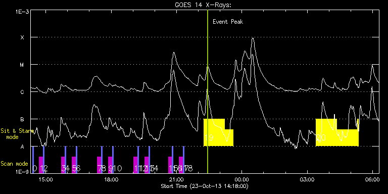 EIS Observation timeline overlay to GOES-Xray curve Code 1" 2" 40" 266" EIS Observations list for this event: STUDY ACRONYM ID DATE OBSERVED DESCRIPTION NOAA# TARGET 0 PRY_slot_contextLITE | 36923 | 2013/10/23 14:22:52 | HOP79 SOT irradiance scan #11 | 1875 | Active Region TIMELINE ID DATE OBSERVED FITS FILE XCEN (+W/-E) YCEN (+N/-S) DUR ----------------------------------------------------------------------------------------------------------------- 36923 | 2013/10/23 14:22:52.000 | eis_l0_20131023_142252.fits.gz | -30.35 | 24.37 | 2m56s 1 SK_DEEP_5x512_SLIT1 | 36924 | 2013/10/23 14:42:19 | HOP79 SOT irradiance scan #12 | | Quiet Sun TIMELINE ID DATE OBSERVED FITS FILE XCEN (+W/-E) YCEN (+N/-S) DUR ----------------------------------------------------------------------------------------------------------------- 36924 | 2013/10/23 14:42:19.000 | eis_l0_20131023_144219.fits.gz | -15.05 | 124.49 | 10m7s 2 PRY_slot_contextLITE | 36925 | 2013/10/23 14:52:52 | HOP79 SOT irradiance scan #12 | 1875 | Active Region TIMELINE ID DATE OBSERVED FITS FILE XCEN (+W/-E) YCEN (+N/-S) DUR ----------------------------------------------------------------------------------------------------------------- 36925 | 2013/10/23 14:52:52.000 | eis_l0_20131023_145252.fits.gz | -30.35 | 124.33 | 2m56s 3 SK_DEEP_5x512_SLIT1 | 36926 | 2013/10/23 15:42:19 | HOP79 SOT irradiance scan #13 | | Quiet Sun TIMELINE ID DATE OBSERVED FITS FILE XCEN (+W/-E) YCEN (+N/-S) DUR ----------------------------------------------------------------------------------------------------------------- 36926 | 2013/10/23 15:42:19.000 | eis_l0_20131023_154219.fits.gz | -15.20 | 224.68 | 10m8s 4 PRY_slot_contextLITE | 36927 | 2013/10/23 15:52:52 | HOP79 SOT irradiance scan #13 | 1875 | Active Region TIMELINE ID DATE OBSERVED FITS FILE XCEN (+W/-E) YCEN (+N/-S) DUR ----------------------------------------------------------------------------------------------------------------- 36927 | 2013/10/23 15:52:52.000 | eis_l0_20131023_155252.fits.gz | -30.35 | 224.52 | 2m56s 5 SK_DEEP_5x512_SLIT1 | 36928 | 2013/10/23 16:12:19 | HOP79 SOT irradiance scan #14 | | Quiet Sun TIMELINE ID DATE OBSERVED FITS FILE XCEN (+W/-E) YCEN (+N/-S) DUR ----------------------------------------------------------------------------------------------------------------- 36928 | 2013/10/23 16:12:19.000 | eis_l0_20131023_161219.fits.gz | -15.13 | 324.79 | 10m8s 6 PRY_slot_contextLITE | 36929 | 2013/10/23 16:22:52 | HOP79 SOT irradiance scan #14 | | Active Region TIMELINE ID DATE OBSERVED FITS FILE XCEN (+W/-E) YCEN (+N/-S) DUR ----------------------------------------------------------------------------------------------------------------- 36929 | 2013/10/23 16:22:52.000 | eis_l0_20131023_162252.fits.gz | -30.35 | 324.64 | 2m56s 7 SK_DEEP_5x512_SLIT1 | 36930 | 2013/10/23 17:22:19 | HOP79 SOT irradiance scan #15 | | Quiet Sun TIMELINE ID DATE OBSERVED FITS FILE XCEN (+W/-E) YCEN (+N/-S) DUR ----------------------------------------------------------------------------------------------------------------- 36930 | 2013/10/23 17:22:19.000 | eis_l0_20131023_172219.fits.gz | -15.13 | 424.83 | 10m8s 8 PRY_slot_contextLITE | 36931 | 2013/10/23 17:32:52 | HOP79 SOT irradiance scan #15 | | Active Region TIMELINE ID DATE OBSERVED FITS FILE XCEN (+W/-E) YCEN (+N/-S) DUR ----------------------------------------------------------------------------------------------------------------- 36931 | 2013/10/23 17:32:52.000 | eis_l0_20131023_173252.fits.gz | -30.43 | 424.75 | 2m56s 9 SK_DEEP_5x512_SLIT1 | 36932 | 2013/10/23 17:52:19 | HOP79 SOT irradiance scan #16 | | Quiet Sun TIMELINE ID DATE OBSERVED FITS FILE XCEN (+W/-E) YCEN (+N/-S) DUR ----------------------------------------------------------------------------------------------------------------- 36932 | 2013/10/23 17:52:19.000 | eis_l0_20131023_175219.fits.gz | -15.13 | 524.47 | 10m7s 10 PRY_slot_contextLITE | 36933 | 2013/10/23 18:02:52 | HOP79 SOT irradiance scan #16 | | Active Region TIMELINE ID DATE OBSERVED FITS FILE XCEN (+W/-E) YCEN (+N/-S) DUR ----------------------------------------------------------------------------------------------------------------- 36933 | 2013/10/23 18:02:52.000 | eis_l0_20131023_180252.fits.gz | -30.43 | 524.32 | 2m56s 11 SK_DEEP_5x512_SLIT1 | 36934 | 2013/10/23 19:02:19 | HOP79 SOT irradiance scan #17 | | Quiet Sun TIMELINE ID DATE OBSERVED FITS FILE XCEN (+W/-E) YCEN (+N/-S) DUR ----------------------------------------------------------------------------------------------------------------- 36934 | 2013/10/23 19:02:19.000 | eis_l0_20131023_190219.fits.gz | -15.13 | 624.59 | 10m7s 12 PRY_slot_contextLITE | 36935 | 2013/10/23 19:12:52 | HOP79 SOT irradiance scan #17 | | Active Region TIMELINE ID DATE OBSERVED FITS FILE XCEN (+W/-E) YCEN (+N/-S) DUR ----------------------------------------------------------------------------------------------------------------- 36935 | 2013/10/23 19:12:52.000 | eis_l0_20131023_191252.fits.gz | -30.43 | 624.43 | 2m56s 13 SK_DEEP_5x512_SLIT1 | 36936 | 2013/10/23 19:32:19 | HOP79 SOT irradiance scan #18 | | Quiet Sun TIMELINE ID DATE OBSERVED FITS FILE XCEN (+W/-E) YCEN (+N/-S) DUR ----------------------------------------------------------------------------------------------------------------- 36936 | 2013/10/23 19:32:19.000 | eis_l0_20131023_193219.fits.gz | -15.13 | 724.62 | 10m8s 14 PRY_slot_contextLITE | 36937 | 2013/10/23 19:42:52 | HOP79 SOT irradiance scan #18 | | Active Region TIMELINE ID DATE OBSERVED FITS FILE XCEN (+W/-E) YCEN (+N/-S) DUR ----------------------------------------------------------------------------------------------------------------- 36937 | 2013/10/23 19:42:52.000 | eis_l0_20131023_194252.fits.gz | -30.35 | 724.55 | 2m56s 15 SK_DEEP_5x512_SLIT1 | 36938 | 2013/10/23 20:37:19 | HOP79 SOT irradiance scan #19 | | Quiet Sun TIMELINE ID DATE OBSERVED FITS FILE XCEN (+W/-E) YCEN (+N/-S) DUR ---------------------------------------------------------------------------