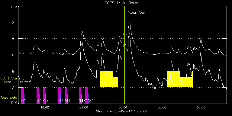EIS Observation timeline overlay to GOES-Xray curve Code 1" 2" 40" 266" EIS Observations list for this event: STUDY ACRONYM ID DATE OBSERVED DESCRIPTION NOAA# TARGET 0 SK_DEEP_5x512_SLIT1 | 36928 | 2013/10/23 16:12:19 | HOP79 SOT irradiance scan #14 | | Quiet Sun TIMELINE ID DATE OBSERVED FITS FILE XCEN (+W/-E) YCEN (+N/-S) DUR ----------------------------------------------------------------------------------------------------------------- 36928 | 2013/10/23 16:12:19.000 | eis_l0_20131023_161219.fits.gz | -15.13 | 324.79 | 10m8s 1 PRY_slot_contextLITE | 36929 | 2013/10/23 16:22:52 | HOP79 SOT irradiance scan #14 | | Active Region TIMELINE ID DATE OBSERVED FITS FILE XCEN (+W/-E) YCEN (+N/-S) DUR ----------------------------------------------------------------------------------------------------------------- 36929 | 2013/10/23 16:22:52.000 | eis_l0_20131023_162252.fits.gz | -30.35 | 324.64 | 2m56s 2 SK_DEEP_5x512_SLIT1 | 36930 | 2013/10/23 17:22:19 | HOP79 SOT irradiance scan #15 | | Quiet Sun TIMELINE ID DATE OBSERVED FITS FILE XCEN (+W/-E) YCEN (+N/-S) DUR ----------------------------------------------------------------------------------------------------------------- 36930 | 2013/10/23 17:22:19.000 | eis_l0_20131023_172219.fits.gz | -15.13 | 424.83 | 10m8s 3 PRY_slot_contextLITE | 36931 | 2013/10/23 17:32:52 | HOP79 SOT irradiance scan #15 | | Active Region TIMELINE ID DATE OBSERVED FITS FILE XCEN (+W/-E) YCEN (+N/-S) DUR ----------------------------------------------------------------------------------------------------------------- 36931 | 2013/10/23 17:32:52.000 | eis_l0_20131023_173252.fits.gz | -30.43 | 424.75 | 2m56s 4 SK_DEEP_5x512_SLIT1 | 36932 | 2013/10/23 17:52:19 | HOP79 SOT irradiance scan #16 | | Quiet Sun TIMELINE ID DATE OBSERVED FITS FILE XCEN (+W/-E) YCEN (+N/-S) DUR ----------------------------------------------------------------------------------------------------------------- 36932 | 2013/10/23 17:52:19.000 | eis_l0_20131023_175219.fits.gz | -15.13 | 524.47 | 10m7s 5 PRY_slot_contextLITE | 36933 | 2013/10/23 18:02:52 | HOP79 SOT irradiance scan #16 | | Active Region TIMELINE ID DATE OBSERVED FITS FILE XCEN (+W/-E) YCEN (+N/-S) DUR ----------------------------------------------------------------------------------------------------------------- 36933 | 2013/10/23 18:02:52.000 | eis_l0_20131023_180252.fits.gz | -30.43 | 524.32 | 2m56s 6 SK_DEEP_5x512_SLIT1 | 36934 | 2013/10/23 19:02:19 | HOP79 SOT irradiance scan #17 | | Quiet Sun TIMELINE ID DATE OBSERVED FITS FILE XCEN (+W/-E) YCEN (+N/-S) DUR ----------------------------------------------------------------------------------------------------------------- 36934 | 2013/10/23 19:02:19.000 | eis_l0_20131023_190219.fits.gz | -15.13 | 624.59 | 10m7s 7 PRY_slot_contextLITE | 36935 | 2013/10/23 19:12:52 | HOP79 SOT irradiance scan #17 | | Active Region TIMELINE ID DATE OBSERVED FITS FILE XCEN (+W/-E) YCEN (+N/-S) DUR ----------------------------------------------------------------------------------------------------------------- 36935 | 2013/10/23 19:12:52.000 | eis_l0_20131023_191252.fits.gz | -30.43 | 624.43 | 2m56s 8 SK_DEEP_5x512_SLIT1 | 36936 | 2013/10/23 19:32:19 | HOP79 SOT irradiance scan #18 | | Quiet Sun TIMELINE ID DATE OBSERVED FITS FILE XCEN (+W/-E) YCEN (+N/-S) DUR ----------------------------------------------------------------------------------------------------------------- 36936 | 2013/10/23 19:32:19.000 | eis_l0_20131023_193219.fits.gz | -15.13 | 724.62 | 10m8s 9 PRY_slot_contextLITE | 36937 | 2013/10/23 19:42:52 | HOP79 SOT irradiance scan #18 | | Active Region TIMELINE ID DATE OBSERVED FITS FILE XCEN (+W/-E) YCEN (+N/-S) DUR ----------------------------------------------------------------------------------------------------------------- 36937 | 2013/10/23 19:42:52.000 | eis_l0_20131023_194252.fits.gz | -30.35 | 724.55 | 2m56s 10 SK_DEEP_5x512_SLIT1 | 36938 | 2013/10/23 20:37:19 | HOP79 SOT irradiance scan #19 | | Quiet Sun TIMELINE ID DATE OBSERVED FITS FILE XCEN (+W/-E) YCEN (+N/-S) DUR ----------------------------------------------------------------------------------------------------------------- 36938 | 2013/10/23 20:37:19.000 | eis_l0_20131023_203719.fits.gz | -15.13 | 824.81 | 10m7s 11 PRY_slot_contextLITE | 36939 | 2013/10/23 20:47:52 | HOP79 SOT irradiance scan #19 | | Active Region TIMELINE ID DATE OBSERVED FITS FILE XCEN (+W/-E) YCEN (+N/-S) DUR ----------------------------------------------------------------------------------------------------------------- 36939 | 2013/10/23 20:47:52.000 | eis_l0_20131023_204752.fits.gz | -30.43 | 824.58 | 2m56s 12 SK_DEEP_5x512_SLIT1 | 36940 | 2013/10/23 21:07:19 | HOP79 SOT irradiance scan #20 | | Quiet Sun TIMELINE ID DATE OBSERVED FITS FILE XCEN (+W/-E) YCEN (+N/-S) DUR ----------------------------------------------------------------------------------------------------------------- 36940 | 2013/10/23 21:07:19.000 | eis_l0_20131023_210719.fits.gz | -15.13 | 924.39 | 10m7s 13 PRY_slot_contextLITE | 36941 | 2013/10/23 21:17:52 | HOP79 SOT irradiance scan #20 | | Active Region TIMELINE ID DATE OBSERVED FITS FILE XCEN (+W/-E) YCEN (+N/-S) DUR ----------------------------------------------------------------------------------------------------------------- 36941 | 2013/10/23 21:17:52.000 | eis_l0_20131023_211752.fits.gz | -30.35 | 924.46 | 2m57s 14 Flare266_Hunter02 | 36971 | 2013/10/23 22:15:20 | AR11875 obs (EIS-FT obs) | 1875 | Flare TIMELINE ID DATE OBSERVED FITS FILE XCEN (+W/-E) YCEN (+N/-S) DUR ----------------------------------------------------------------------------------------------------------------- 36971 | 2013/10/23 22:15:20.000 | eis_l0_20131023_221520.fits.gz | -9.91 | 29.17 | 56m53s 36971 | 2013/10/23 23:12:40.000 | eis_l0_20131023_231240.fits.gz | -0.87 | 29.17 | 23m40s 15 Flare266_Hunter02 | 36976 | 2013/10/24 03:23:56 | AR11875 obs (EIS-FT obs) | 1875 | Flare TIMELINE ID DATE OBSERVED FITS FILE XCEN (+W/-E) YCEN (+N/-S) DUR -----------------