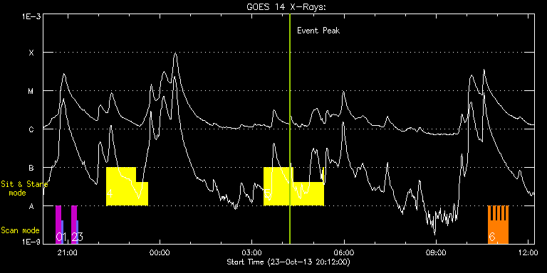 EIS Observation timeline overlay to GOES-Xray curve Code 1" 2" 40" 266" EIS Observations list for this event: STUDY ACRONYM ID DATE OBSERVED DESCRIPTION NOAA# TARGET 0 SK_DEEP_5x512_SLIT1 | 36938 | 2013/10/23 20:37:19 | HOP79 SOT irradiance scan #19 | | Quiet Sun TIMELINE ID DATE OBSERVED FITS FILE XCEN (+W/-E) YCEN (+N/-S) DUR ----------------------------------------------------------------------------------------------------------------- 36938 | 2013/10/23 20:37:19.000 | eis_l0_20131023_203719.fits.gz | -15.13 | 824.81 | 10m7s 1 PRY_slot_contextLITE | 36939 | 2013/10/23 20:47:52 | HOP79 SOT irradiance scan #19 | | Active Region TIMELINE ID DATE OBSERVED FITS FILE XCEN (+W/-E) YCEN (+N/-S) DUR ----------------------------------------------------------------------------------------------------------------- 36939 | 2013/10/23 20:47:52.000 | eis_l0_20131023_204752.fits.gz | -30.43 | 824.58 | 2m56s 2 SK_DEEP_5x512_SLIT1 | 36940 | 2013/10/23 21:07:19 | HOP79 SOT irradiance scan #20 | | Quiet Sun TIMELINE ID DATE OBSERVED FITS FILE XCEN (+W/-E) YCEN (+N/-S) DUR ----------------------------------------------------------------------------------------------------------------- 36940 | 2013/10/23 21:07:19.000 | eis_l0_20131023_210719.fits.gz | -15.13 | 924.39 | 10m7s 3 PRY_slot_contextLITE | 36941 | 2013/10/23 21:17:52 | HOP79 SOT irradiance scan #20 | | Active Region TIMELINE ID DATE OBSERVED FITS FILE XCEN (+W/-E) YCEN (+N/-S) DUR ----------------------------------------------------------------------------------------------------------------- 36941 | 2013/10/23 21:17:52.000 | eis_l0_20131023_211752.fits.gz | -30.35 | 924.46 | 2m57s 4 Flare266_Hunter02 | 36971 | 2013/10/23 22:15:20 | AR11875 obs (EIS-FT obs) | 1875 | Flare TIMELINE ID DATE OBSERVED FITS FILE XCEN (+W/-E) YCEN (+N/-S) DUR ----------------------------------------------------------------------------------------------------------------- 36971 | 2013/10/23 22:15:20.000 | eis_l0_20131023_221520.fits.gz | -9.91 | 29.17 | 56m53s 36971 | 2013/10/23 23:12:40.000 | eis_l0_20131023_231240.fits.gz | -0.87 | 29.17 | 23m40s 5 Flare266_Hunter02 | 36976 | 2013/10/24 03:23:56 | AR11875 obs (EIS-FT obs) | 1875 | Flare TIMELINE ID DATE OBSERVED FITS FILE XCEN (+W/-E) YCEN (+N/-S) DUR ----------------------------------------------------------------------------------------------------------------- 36976 | 2013/10/24 03:23:56.000 | eis_l0_20131024_032356.fits.gz | 37.75 | 29.94 | 56m54s 36976 | 2013/10/24 04:21:17.000 | eis_l0_20131024_042117.fits.gz | 46.48 | 30.25 | 56m53s 36976 | 2013/10/24 05:18:37.000 | eis_l0_20131024_051837.fits.gz | 55.28 | 30.40 | 2m14s 6 HH_Flare_162x152 | 37032 | 2013/10/24 10:42:14 | AR 11875 obs | 1875 | Flare TIMELINE ID DATE OBSERVED FITS FILE XCEN (+W/-E) YCEN (+N/-S) DUR ----------------------------------------------------------------------------------------------------------------- 37032 | 2013/10/24 10:42:14.000 | eis_l0_20131024_104214.fits.gz | 237.01 | 32.56 | 4m11s 37032 | 2013/10/24 10:46:27.000 | eis_l0_20131024_104627.fits.gz | 237.62 | 32.72 | 4m11s 37032 | 2013/10/24 10:50:40.000 | eis_l0_20131024_105040.fits.gz | 238.32 | 32.64 | 4m11s 37032 | 2013/10/24 10:54:54.000 | eis_l0_20131024_105454.fits.gz | 238.94 | 32.72 | 4m11s 37032 | 2013/10/24 10:59:07.000 | eis_l0_20131024_105907.fits.gz | 239.55 | 32.79 | 4m11s 37032 | 2013/10/24 11:03:21.000 | eis_l0_20131024_110321.fits.gz | 240.17 | 32.79 | 4m10s 37032 | 2013/10/24 11:07:34.000 | eis_l0_20131024_110734.fits.gz | 240.87 | 32.87 | 4m11s 37032 | 2013/10/24 11:11:48.000 | eis_l0_20131024_111148.fits.gz | 241.49 | 32.79 | 4m10s 37032 | 2013/10/24 11:16:01.000 | eis_l0_20131024_111601.fits.gz | 242.03 | 32.79 | 4m10s : Check study information : Download file : View thumbnails For this event, also check for: