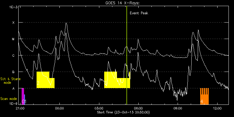 EIS Observation timeline overlay to GOES-Xray curve Code 1" 2" 40" 266" EIS Observations list for this event: STUDY ACRONYM ID DATE OBSERVED DESCRIPTION NOAA# TARGET 0 SK_DEEP_5x512_SLIT1 | 36940 | 2013/10/23 21:07:19 | HOP79 SOT irradiance scan #20 | | Quiet Sun TIMELINE ID DATE OBSERVED FITS FILE XCEN (+W/-E) YCEN (+N/-S) DUR ----------------------------------------------------------------------------------------------------------------- 36940 | 2013/10/23 21:07:19.000 | eis_l0_20131023_210719.fits.gz | -15.13 | 924.39 | 10m7s 1 PRY_slot_contextLITE | 36941 | 2013/10/23 21:17:52 | HOP79 SOT irradiance scan #20 | | Active Region TIMELINE ID DATE OBSERVED FITS FILE XCEN (+W/-E) YCEN (+N/-S) DUR ----------------------------------------------------------------------------------------------------------------- 36941 | 2013/10/23 21:17:52.000 | eis_l0_20131023_211752.fits.gz | -30.35 | 924.46 | 2m57s 2 Flare266_Hunter02 | 36971 | 2013/10/23 22:15:20 | AR11875 obs (EIS-FT obs) | 1875 | Flare TIMELINE ID DATE OBSERVED FITS FILE XCEN (+W/-E) YCEN (+N/-S) DUR ----------------------------------------------------------------------------------------------------------------- 36971 | 2013/10/23 22:15:20.000 | eis_l0_20131023_221520.fits.gz | -9.91 | 29.17 | 56m53s 36971 | 2013/10/23 23:12:40.000 | eis_l0_20131023_231240.fits.gz | -0.87 | 29.17 | 23m40s 3 Flare266_Hunter02 | 36976 | 2013/10/24 03:23:56 | AR11875 obs (EIS-FT obs) | 1875 | Flare TIMELINE ID DATE OBSERVED FITS FILE XCEN (+W/-E) YCEN (+N/-S) DUR ----------------------------------------------------------------------------------------------------------------- 36976 | 2013/10/24 03:23:56.000 | eis_l0_20131024_032356.fits.gz | 37.75 | 29.94 | 56m54s 36976 | 2013/10/24 04:21:17.000 | eis_l0_20131024_042117.fits.gz | 46.48 | 30.25 | 56m53s 36976 | 2013/10/24 05:18:37.000 | eis_l0_20131024_051837.fits.gz | 55.28 | 30.40 | 2m14s 4 HH_Flare_162x152 | 37032 | 2013/10/24 10:42:14 | AR 11875 obs | 1875 | Flare TIMELINE ID DATE OBSERVED FITS FILE XCEN (+W/-E) YCEN (+N/-S) DUR ----------------------------------------------------------------------------------------------------------------- 37032 | 2013/10/24 10:42:14.000 | eis_l0_20131024_104214.fits.gz | 237.01 | 32.56 | 4m11s 37032 | 2013/10/24 10:46:27.000 | eis_l0_20131024_104627.fits.gz | 237.62 | 32.72 | 4m11s 37032 | 2013/10/24 10:50:40.000 | eis_l0_20131024_105040.fits.gz | 238.32 | 32.64 | 4m11s 37032 | 2013/10/24 10:54:54.000 | eis_l0_20131024_105454.fits.gz | 238.94 | 32.72 | 4m11s 37032 | 2013/10/24 10:59:07.000 | eis_l0_20131024_105907.fits.gz | 239.55 | 32.79 | 4m11s 37032 | 2013/10/24 11:03:21.000 | eis_l0_20131024_110321.fits.gz | 240.17 | 32.79 | 4m10s 37032 | 2013/10/24 11:07:34.000 | eis_l0_20131024_110734.fits.gz | 240.87 | 32.87 | 4m11s 37032 | 2013/10/24 11:11:48.000 | eis_l0_20131024_111148.fits.gz | 241.49 | 32.79 | 4m10s 37032 | 2013/10/24 11:16:01.000 | eis_l0_20131024_111601.fits.gz | 242.03 | 32.79 | 4m10s : Check study information : Download file : View thumbnails For this event, also check for: