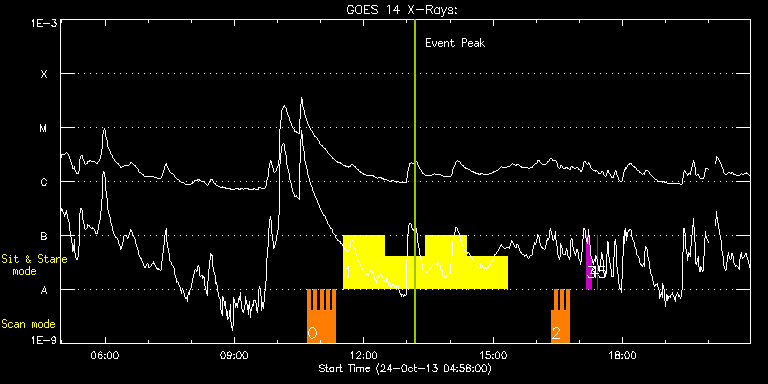 EIS Observation timeline overlay to GOES-Xray curve Code 1" 2" 40" 266" EIS Observations list for this event: STUDY ACRONYM ID DATE OBSERVED DESCRIPTION NOAA# TARGET 0 HH_Flare_162x152 | 37032 | 2013/10/24 10:42:14 | AR 11875 obs | 1875 | Flare TIMELINE ID DATE OBSERVED FITS FILE XCEN (+W/-E) YCEN (+N/-S) DUR ----------------------------------------------------------------------------------------------------------------- 37032 | 2013/10/24 10:42:14.000 | eis_l0_20131024_104214.fits.gz | 237.01 | 32.56 | 4m11s 37032 | 2013/10/24 10:46:27.000 | eis_l0_20131024_104627.fits.gz | 237.62 | 32.72 | 4m11s 37032 | 2013/10/24 10:50:40.000 | eis_l0_20131024_105040.fits.gz | 238.32 | 32.64 | 4m11s 37032 | 2013/10/24 10:54:54.000 | eis_l0_20131024_105454.fits.gz | 238.94 | 32.72 | 4m11s 37032 | 2013/10/24 10:59:07.000 | eis_l0_20131024_105907.fits.gz | 239.55 | 32.79 | 4m11s 37032 | 2013/10/24 11:03:21.000 | eis_l0_20131024_110321.fits.gz | 240.17 | 32.79 | 4m10s 37032 | 2013/10/24 11:07:34.000 | eis_l0_20131024_110734.fits.gz | 240.87 | 32.87 | 4m11s 37032 | 2013/10/24 11:11:48.000 | eis_l0_20131024_111148.fits.gz | 241.49 | 32.79 | 4m10s 37032 | 2013/10/24 11:16:01.000 | eis_l0_20131024_111601.fits.gz | 242.03 | 32.79 | 4m10s 1 Flare266_Hunter01 | 37033 | 2013/10/24 11:31:46 | AR 11875 obs (EIS-FT obs) | 1875 | Flare TIMELINE ID DATE OBSERVED FITS FILE XCEN (+W/-E) YCEN (+N/-S) DUR ----------------------------------------------------------------------------------------------------------------- 37033 | 2013/10/24 11:31:46.000 | eis_l0_20131024_113146.fits.gz | 112.98 | 32.87 | 56m22s 37033 | 2013/10/24 12:29:00.000 | eis_l0_20131024_122900.fits.gz | 121.56 | 33.34 | 56m23s 37033 | 2013/10/24 13:26:15.000 | eis_l0_20131024_132615.fits.gz | 130.29 | 33.41 | 56m22s 37033 | 2013/10/24 14:23:30.000 | eis_l0_20131024_142330.fits.gz | 138.86 | 33.64 | 56m22s 2 HH_Flare_162x152 | 37041 | 2013/10/24 16:21:20 | AR 11875 obs | | Flare TIMELINE ID DATE OBSERVED FITS FILE XCEN (+W/-E) YCEN (+N/-S) DUR ----------------------------------------------------------------------------------------------------------------- 37041 | 2013/10/24 16:21:20.000 | eis_l0_20131024_162120.fits.gz | 287.99 | 34.26 | 4m11s 37041 | 2013/10/24 16:25:34.000 | eis_l0_20131024_162534.fits.gz | 288.53 | 34.19 | 4m10s 37041 | 2013/10/24 16:29:47.000 | eis_l0_20131024_162947.fits.gz | 289.15 | 34.34 | 4m11s 37041 | 2013/10/24 16:34:01.000 | eis_l0_20131024_163401.fits.gz | 289.84 | 34.26 | 4m10s 37041 | 2013/10/24 16:38:14.000 | eis_l0_20131024_163814.fits.gz | 290.46 | 34.34 | 4m11s 37041 | 2013/10/24 16:42:27.000 | eis_l0_20131024_164227.fits.gz | 291.15 | 34.19 | 4m11s 3 regcal071 | 37027 | 2013/10/24 17:10:12 | Dark exposures, CCD bottom rows (100s | | Engineering TIMELINE ID DATE OBSERVED FITS FILE XCEN (+W/-E) YCEN (+N/-S) DUR ----------------------------------------------------------------------------------------------------------------- 37027 | 2013/10/24 17:10:12.000 | eis_l0_20131024_171012.fits.gz | 300.25 | -288.51 | 3m22s 4 regcal072 | 37028 | 2013/10/24 17:14:01 | Dark exposures, top CCD rows (100s exp | | Engineering TIMELINE ID DATE OBSERVED FITS FILE XCEN (+W/-E) YCEN (+N/-S) DUR ----------------------------------------------------------------------------------------------------------------- 37028 | 2013/10/24 17:14:01.000 | eis_l0_20131024_171401.fits.gz | 300.71 | 222.49 | 3m22s 5 regcal077 | 37029 | 2013/10/24 17:25:12 | Flatfield, 2 exposures, led 80ms, full | | Engineering TIMELINE ID DATE OBSERVED FITS FILE XCEN (+W/-E) YCEN (+N/-S) DUR ----------------------------------------------------------------------------------------------------------------- 37029 | 2013/10/24 17:25:12.000 | eis_l0_20131024_172512.fits.gz | 302.49 | -33.35 | 4s : Check study information : Download file : View thumbnails For this event, also check for:
