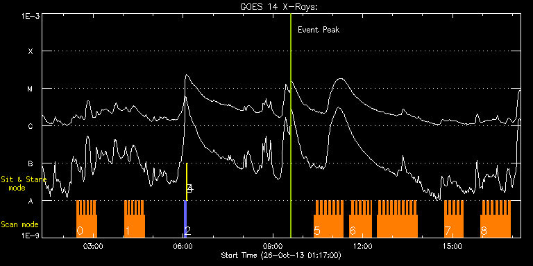 EIS Observation timeline overlay to GOES-Xray curve Code 1" 2" 40" 266" EIS Observations list for this event: STUDY ACRONYM ID DATE OBSERVED DESCRIPTION NOAA# TARGET 0 madj_ar_small | 37047 | 2013/10/26 02:26:57 | AR 11875 obs | 1875 | Active Region TIMELINE ID DATE OBSERVED FITS FILE XCEN (+W/-E) YCEN (+N/-S) DUR ----------------------------------------------------------------------------------------------------------------- 37047 | 2013/10/26 02:26:57.000 | eis_l0_20131026_022657.fits.gz | 564.54 | 48.71 | 3m18s 37047 | 2013/10/26 02:30:18.000 | eis_l0_20131026_023018.fits.gz | 564.93 | 48.71 | 3m18s 37047 | 2013/10/26 02:33:39.000 | eis_l0_20131026_023339.fits.gz | 565.39 | 48.55 | 3m19s 37047 | 2013/10/26 02:37:01.000 | eis_l0_20131026_023701.fits.gz | 565.78 | 48.79 | 3m18s 37047 | 2013/10/26 02:40:22.000 | eis_l0_20131026_024022.fits.gz | 566.24 | 48.71 | 3m19s 37047 | 2013/10/26 02:43:44.000 | eis_l0_20131026_024344.fits.gz | 566.62 | 48.79 | 3m19s 37047 | 2013/10/26 02:47:06.000 | eis_l0_20131026_024706.fits.gz | 567.09 | 48.71 | 3m18s 37047 | 2013/10/26 02:50:27.000 | eis_l0_20131026_025027.fits.gz | 567.47 | 48.71 | 3m19s 37047 | 2013/10/26 02:53:49.000 | eis_l0_20131026_025349.fits.gz | 567.94 | 48.86 | 3m19s 37047 | 2013/10/26 02:57:11.000 | eis_l0_20131026_025711.fits.gz | 568.33 | 48.86 | 3m19s 37047 | 2013/10/26 03:00:33.000 | eis_l0_20131026_030033.fits.gz | 568.79 | 48.94 | 3m18s 37047 | 2013/10/26 03:03:55.000 | eis_l0_20131026_030355.fits.gz | 569.17 | 48.79 | 3m18s 1 madj_ar_small | 37048 | 2013/10/26 04:02:56 | AR 11875 obs | 1875 | Active Region TIMELINE ID DATE OBSERVED FITS FILE XCEN (+W/-E) YCEN (+N/-S) DUR ----------------------------------------------------------------------------------------------------------------- 37048 | 2013/10/26 04:02:56.000 | eis_l0_20131026_040256.fits.gz | 576.59 | 49.48 | 3m18s 37048 | 2013/10/26 04:06:17.000 | eis_l0_20131026_040617.fits.gz | 577.05 | 49.40 | 3m19s 37048 | 2013/10/26 04:09:39.000 | eis_l0_20131026_040939.fits.gz | 577.36 | 49.48 | 3m19s 37048 | 2013/10/26 04:13:01.000 | eis_l0_20131026_041301.fits.gz | 577.83 | 49.56 | 3m18s 37048 | 2013/10/26 04:16:22.000 | eis_l0_20131026_041622.fits.gz | 578.29 | 49.56 | 3m18s 37048 | 2013/10/26 04:19:43.000 | eis_l0_20131026_041943.fits.gz | 578.60 | 49.56 | 3m19s 37048 | 2013/10/26 04:23:05.000 | eis_l0_20131026_042305.fits.gz | 578.98 | 49.71 | 3m18s 37048 | 2013/10/26 04:26:26.000 | eis_l0_20131026_042626.fits.gz | 579.53 | 49.63 | 3m19s 37048 | 2013/10/26 04:29:48.000 | eis_l0_20131026_042948.fits.gz | 579.91 | 49.63 | 3m18s 37048 | 2013/10/26 04:33:09.000 | eis_l0_20131026_043309.fits.gz | 580.30 | 49.63 | 3m19s 37048 | 2013/10/26 04:36:31.000 | eis_l0_20131026_043631.fits.gz | 580.84 | 49.56 | 3m19s 37048 | 2013/10/26 04:39:53.000 | eis_l0_20131026_043953.fits.gz | 581.15 | 49.63 | 3m18s 2 PRY_slot_contextLITE | 37024 | 2013/10/26 06:02:49 | EIS-AIA alignment | | Active Region TIMELINE ID DATE OBSERVED FITS FILE XCEN (+W/-E) YCEN (+N/-S) DUR ----------------------------------------------------------------------------------------------------------------- 37024 | 2013/10/26 06:02:49.000 | eis_l0_20131026_060249.fits.gz | -15.29 | -0.50 | 2m56s 3 Alignment_266 | 37025 | 2013/10/26 06:06:03 | EIS-AIA alignment | | Quiet Sun TIMELINE ID DATE OBSERVED FITS FILE XCEN (+W/-E) YCEN (+N/-S) DUR ----------------------------------------------------------------------------------------------------------------- 37025 | 2013/10/26 06:06:03.000 | eis_l0_20131026_060603.fits.gz | -132.57 | -0.58 | 1m22s 4 XRT_synop_AIA | 37031 | 2013/10/26 06:08:10 | EIS-AIA alignment | | Quiet Sun TIMELINE ID DATE OBSERVED FITS FILE XCEN (+W/-E) YCEN (+N/-S) DUR ----------------------------------------------------------------------------------------------------------------- 37031 | 2013/10/26 06:08:10.000 | eis_l0_20131026_060810.fits.gz | -132.49 | -0.42 | 10s 5 HH_Flare_162x152 | 37057 | 2013/10/26 10:22:20 | Active Region Observation | 1882 | Flare TIMELINE ID DATE OBSERVED FITS FILE XCEN (+W/-E) YCEN (+N/-S) DUR ----------------------------------------------------------------------------------------------------------------- 37057 | 2013/10/26 10:22:20.000 | eis_l0_20131026_102220.fits.gz | -827.45 | -205.51 | 4m10s 37057 | 2013/10/26 10:26:33.000 | eis_l0_20131026_102633.fits.gz | -827.06 | -205.59 | 4m11s 37057 | 2013/10/26 10:30:47.000 | eis_l0_20131026_103047.fits.gz | -826.75 | -205.75 | 4m10s 37057 | 2013/10/26 10:35:00.000 | eis_l0_20131026_103500.fits.gz | -826.36 | -205.82 | 4m11s 37057 | 2013/10/26 10:39:13.000 | eis_l0_20131026_103913.fits.gz | -826.13 | -205.67 | 4m11s 37057 | 2013/10/26 10:43:27.000 | eis_l0_20131026_104327.fits.gz | -825.74 | -205.90 | 4m10s 37057 | 2013/10/26 10:47:40.000 | eis_l0_20131026_104740.fits.gz | -825.51 | -205.98 | 4m11s 37057 | 2013/10/26 10:51:54.000 | eis_l0_20131026_105154.fits.gz | -825.13 | -205.98 | 4m10s 37057 | 2013/10/26 10:56:07.000 | eis_l0_20131026_105607.fits.gz | -824.82 | -205.98 | 4m11s 37057 | 2013/10/26 11:00:20.000 | eis_l0_20131026_110020.fits.gz | -824.51 | -206.13 | 4m11s 37057 | 2013/10/26 11:04:34.000 | eis_l0_20131026_110434.fits.gz | -824.20 | -206.06 | 4m10s 37057 | 2013/10/26 11:08:47.000 | eis_l0_20131026_110847.fits.gz | -823.74 | -206.37 | 4m11s 37057 | 2013/10/26 11:13:01.000 | eis_l0_20131026_111301.fits.gz | -823.51 | -206.21 | 4m10s 37057 | 2013/10/26 11:17:14.000 | eis_l0_20131026_111714.fits.gz | -823.20 | -206.21 | 4m11s 6 cam_artb_lite_v2 | 37083 | 2013/10/26 11:33:40 | AR Obs - High cadence | | Active Region TIMELINE ID DATE OBSERVED FITS FILE XCEN (+W/-E) YCEN (+N/-S) DUR ----------------------------------------------------------------------------------------------------------------- 37083 | 2013/10/26 11:33:40.000 | eis_l0_20131026_113340.fits.gz | 694.48 | 36.98 | 3m52s 37083 | 2013/10/26 11:37:34.000 | eis_l0_20131026_113734.fits.gz | 694.79 | 37.06 | 3m52s 37083 | 2013/10/26 11:41:29.000 | eis_l0_20131026_114129.fit