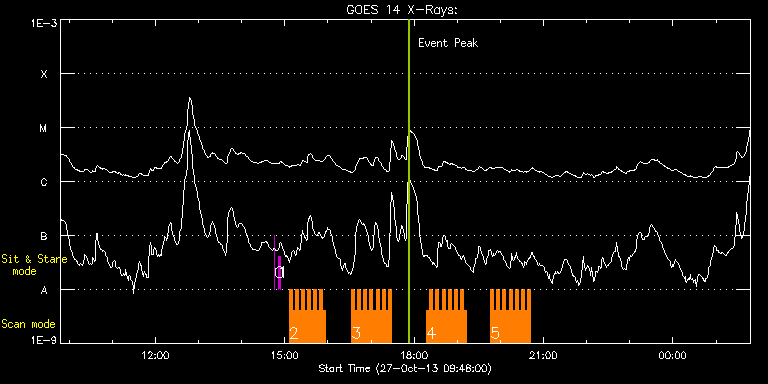 EIS Observation timeline overlay to GOES-Xray curve Code 1" 2" 40" 266" EIS Observations list for this event: STUDY ACRONYM ID DATE OBSERVED DESCRIPTION NOAA# TARGET 0 regcal070 | 37052 | 2013/10/27 14:45:42 | Flat field with overscan pixels (50*8) | | Engineering TIMELINE ID DATE OBSERVED FITS FILE XCEN (+W/-E) YCEN (+N/-S) DUR ----------------------------------------------------------------------------------------------------------------- 37052 | 2013/10/27 14:45:42.000 | eis_l0_20131027_144542.fits.gz | -653.06 | -16.59 | 2s 1 regcal074 | 37053 | 2013/10/27 14:50:41 | Dark exposures including overscan pixe | | Engineering TIMELINE ID DATE OBSERVED FITS FILE XCEN (+W/-E) YCEN (+N/-S) DUR ----------------------------------------------------------------------------------------------------------------- 37053 | 2013/10/27 14:50:41.000 | eis_l0_20131027_145041.fits.gz | -652.60 | -16.59 | 3m22s 2 HH_Flare_162x152 | 37088 | 2013/10/27 15:06:13 | Active Region Observation | 1882 | Flare TIMELINE ID DATE OBSERVED FITS FILE XCEN (+W/-E) YCEN (+N/-S) DUR ----------------------------------------------------------------------------------------------------------------- 37088 | 2013/10/27 15:06:13.000 | eis_l0_20131027_150613.fits.gz | -666.38 | -222.74 | 4m11s 37088 | 2013/10/27 15:10:27.000 | eis_l0_20131027_151027.fits.gz | -665.92 | -222.82 | 4m10s 37088 | 2013/10/27 15:14:40.000 | eis_l0_20131027_151440.fits.gz | -665.38 | -222.90 | 4m10s 37088 | 2013/10/27 15:18:53.000 | eis_l0_20131027_151853.fits.gz | -664.84 | -223.05 | 4m11s 37088 | 2013/10/27 15:23:07.000 | eis_l0_20131027_152307.fits.gz | -664.53 | -222.90 | 4m10s 37088 | 2013/10/27 15:27:20.000 | eis_l0_20131027_152720.fits.gz | -664.07 | -222.90 | 4m11s 37088 | 2013/10/27 15:31:34.000 | eis_l0_20131027_153134.fits.gz | -663.60 | -222.97 | 4m10s 37088 | 2013/10/27 15:35:47.000 | eis_l0_20131027_153547.fits.gz | -662.98 | -222.97 | 4m11s 37088 | 2013/10/27 15:40:01.000 | eis_l0_20131027_154001.fits.gz | -662.68 | -223.05 | 4m10s 37088 | 2013/10/27 15:44:14.000 | eis_l0_20131027_154414.fits.gz | -662.21 | -222.82 | 4m11s 37088 | 2013/10/27 15:48:28.000 | eis_l0_20131027_154828.fits.gz | -661.83 | -223.05 | 4m11s 37088 | 2013/10/27 15:52:41.000 | eis_l0_20131027_155241.fits.gz | -661.28 | -223.13 | 4m11s 3 HH_Flare_162x152 | 37089 | 2013/10/27 16:33:13 | Active Region Observation | 1882 | Flare TIMELINE ID DATE OBSERVED FITS FILE XCEN (+W/-E) YCEN (+N/-S) DUR ----------------------------------------------------------------------------------------------------------------- 37089 | 2013/10/27 16:33:13.000 | eis_l0_20131027_163313.fits.gz | -656.80 | -223.51 | 4m11s 37089 | 2013/10/27 16:37:26.000 | eis_l0_20131027_163726.fits.gz | -656.26 | -223.44 | 4m11s 37089 | 2013/10/27 16:41:40.000 | eis_l0_20131027_164140.fits.gz | -655.88 | -223.59 | 4m10s 37089 | 2013/10/27 16:45:53.000 | eis_l0_20131027_164553.fits.gz | -655.41 | -223.51 | 4m11s 37089 | 2013/10/27 16:50:07.000 | eis_l0_20131027_165007.fits.gz | -654.87 | -223.67 | 4m10s 37089 | 2013/10/27 16:54:20.000 | eis_l0_20131027_165420.fits.gz | -654.41 | -223.67 | 4m10s 37089 | 2013/10/27 16:58:33.000 | eis_l0_20131027_165833.fits.gz | -654.02 | -223.59 | 4m11s 37089 | 2013/10/27 17:02:47.000 | eis_l0_20131027_170247.fits.gz | -653.48 | -223.75 | 4m11s 37089 | 2013/10/27 17:07:00.000 | eis_l0_20131027_170700.fits.gz | -653.10 | -223.75 | 4m11s 37089 | 2013/10/27 17:11:14.000 | eis_l0_20131027_171114.fits.gz | -652.56 | -223.82 | 4m10s 37089 | 2013/10/27 17:15:27.000 | eis_l0_20131027_171527.fits.gz | -652.09 | -223.82 | 4m11s 37089 | 2013/10/27 17:19:41.000 | eis_l0_20131027_171941.fits.gz | -651.63 | -223.75 | 4m11s 37089 | 2013/10/27 17:23:54.000 | eis_l0_20131027_172354.fits.gz | -651.17 | -223.82 | 4m11s 4 HH_Flare_162x152 | 37090 | 2013/10/27 18:17:44 | Active Region Observation | 1882 | Flare TIMELINE ID DATE OBSERVED FITS FILE XCEN (+W/-E) YCEN (+N/-S) DUR ----------------------------------------------------------------------------------------------------------------- 37090 | 2013/10/27 18:17:44.000 | eis_l0_20131027_181744.fits.gz | -645.14 | -224.52 | 4m10s 37090 | 2013/10/27 18:21:57.000 | eis_l0_20131027_182157.fits.gz | -644.60 | -224.44 | 4m11s 37090 | 2013/10/27 18:26:10.000 | eis_l0_20131027_182610.fits.gz | -644.06 | -224.44 | 4m11s 37090 | 2013/10/27 18:30:24.000 | eis_l0_20131027_183024.fits.gz | -643.67 | -224.36 | 4m10s 37090 | 2013/10/27 18:34:37.000 | eis_l0_20131027_183437.fits.gz | -643.21 | -224.44 | 4m11s 37090 | 2013/10/27 18:38:51.000 | eis_l0_20131027_183851.fits.gz | -642.59 | -224.44 | 4m10s 37090 | 2013/10/27 18:43:04.000 | eis_l0_20131027_184304.fits.gz | -642.21 | -224.52 | 4m11s 37090 | 2013/10/27 18:47:17.000 | eis_l0_20131027_184717.fits.gz | -641.74 | -224.36 | 4m11s 37090 | 2013/10/27 18:51:31.000 | eis_l0_20131027_185131.fits.gz | -641.28 | -224.52 | 4m11s 37090 | 2013/10/27 18:55:44.000 | eis_l0_20131027_185544.fits.gz | -640.82 | -224.52 | 4m11s 37090 | 2013/10/27 18:59:58.000 | eis_l0_20131027_185958.fits.gz | -640.35 | -224.60 | 4m11s 37090 | 2013/10/27 19:04:11.000 | eis_l0_20131027_190411.fits.gz | -639.81 | -224.67 | 4m11s 37090 | 2013/10/27 19:08:24.000 | eis_l0_20131027_190824.fits.gz | -639.35 | -224.60 | 4m11s 5 HH_Flare_162x152 | 37091 | 2013/10/27 19:46:43 | Active Region Observation | 1882 | Flare TIMELINE ID DATE OBSERVED FITS FILE XCEN (+W/-E) YCEN (+N/-S) DUR ----------------------------------------------------------------------------------------------------------------- 37091 | 2013/10/27 19:46:43.000 | eis_l0_20131027_194643.fits.gz | -635.02 | -224.90 | 4m10s 37091 | 2013/10/27 19:50:56.000 | eis_l0_20131027_195056.fits.gz | -634.48 | -225.06 | 4m11s 37091 | 2013/10/27 19:55:10.000 | eis_l0_20131027_195510.fits.gz | -634.02 | -225.06 | 4m10s 37091 | 2013/10/27 19:59:23.000 | eis_l0_20131027_195923.fits.gz | -633.55 | -225.06 | 4m11s 37091 | 2013/10/27 20:03:36.000 | eis_l0_20131027_200336.fits.gz | -633.01 | -225.21 | 4m11s 37091 | 