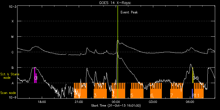 EIS Observation timeline overlay to GOES-Xray curve Code 1" 2" 40" 266" EIS Observations list for this event: STUDY ACRONYM ID DATE OBSERVED DESCRIPTION NOAA# TARGET 0 regcal071 | 37143 | 2013/10/31 17:23:12 | Dark exposures, CCD bottom rows (100s | | Engineering TIMELINE ID DATE OBSERVED FITS FILE XCEN (+W/-E) YCEN (+N/-S) DUR ----------------------------------------------------------------------------------------------------------------- 37143 | 2013/10/31 17:23:12.000 | eis_l0_20131031_172312.fits.gz | 604.53 | 415.53 | 3m22s 1 regcal072 | 37144 | 2013/10/31 17:30:12 | Dark exposures, top CCD rows (100s exp | | Engineering TIMELINE ID DATE OBSERVED FITS FILE XCEN (+W/-E) YCEN (+N/-S) DUR ----------------------------------------------------------------------------------------------------------------- 37144 | 2013/10/31 17:30:12.000 | eis_l0_20131031_173012.fits.gz | 604.53 | 926.68 | 3m22s 2 HH_Flare_162x152 | 37117 | 2013/10/31 20:36:13 | Active Region Observation | | Flare TIMELINE ID DATE OBSERVED FITS FILE XCEN (+W/-E) YCEN (+N/-S) DUR ----------------------------------------------------------------------------------------------------------------- 37117 | 2013/10/31 20:36:13.000 | eis_l0_20131031_203613.fits.gz | -272.42 | -320.23 | 4m11s 37117 | 2013/10/31 20:40:27.000 | eis_l0_20131031_204027.fits.gz | -271.73 | -320.15 | 4m10s 37117 | 2013/10/31 20:44:40.000 | eis_l0_20131031_204440.fits.gz | -271.18 | -320.15 | 4m10s 37117 | 2013/10/31 20:48:53.000 | eis_l0_20131031_204853.fits.gz | -270.57 | -320.15 | 4m11s 37117 | 2013/10/31 20:53:07.000 | eis_l0_20131031_205307.fits.gz | -269.95 | -320.15 | 4m10s 37117 | 2013/10/31 20:57:20.000 | eis_l0_20131031_205720.fits.gz | -269.33 | -320.23 | 4m11s 37117 | 2013/10/31 21:01:33.000 | eis_l0_20131031_210133.fits.gz | -268.87 | -320.15 | 4m11s 37117 | 2013/10/31 21:05:47.000 | eis_l0_20131031_210547.fits.gz | -268.10 | -320.30 | 4m10s 37117 | 2013/10/31 21:10:00.000 | eis_l0_20131031_211000.fits.gz | -267.48 | -320.15 | 4m11s 37117 | 2013/10/31 21:14:14.000 | eis_l0_20131031_211414.fits.gz | -266.86 | -320.23 | 4m10s 37117 | 2013/10/31 21:18:27.000 | eis_l0_20131031_211827.fits.gz | -266.24 | -320.30 | 4m11s 37117 | 2013/10/31 21:22:41.000 | eis_l0_20131031_212241.fits.gz | -265.78 | -320.15 | 4m10s 37117 | 2013/10/31 21:26:54.000 | eis_l0_20131031_212654.fits.gz | -265.16 | -320.23 | 4m11s 37117 | 2013/10/31 21:31:08.000 | eis_l0_20131031_213108.fits.gz | -264.46 | -320.23 | 4m10s 37117 | 2013/10/31 21:35:21.000 | eis_l0_20131031_213521.fits.gz | -264.00 | -320.23 | 4m10s 3 HH_Flare_162x152 | 37118 | 2013/10/31 22:12:14 | Active Region Observation | | Flare TIMELINE ID DATE OBSERVED FITS FILE XCEN (+W/-E) YCEN (+N/-S) DUR ----------------------------------------------------------------------------------------------------------------- 37118 | 2013/10/31 22:12:14.000 | eis_l0_20131031_221214.fits.gz | -258.67 | -320.38 | 4m10s 37118 | 2013/10/31 22:16:27.000 | eis_l0_20131031_221627.fits.gz | -257.90 | -320.46 | 4m11s 37118 | 2013/10/31 22:20:40.000 | eis_l0_20131031_222040.fits.gz | -257.36 | -320.30 | 4m11s 37118 | 2013/10/31 22:24:54.000 | eis_l0_20131031_222454.fits.gz | -256.74 | -320.46 | 4m11s 37118 | 2013/10/31 22:29:07.000 | eis_l0_20131031_222907.fits.gz | -256.12 | -320.46 | 4m11s 37118 | 2013/10/31 22:33:21.000 | eis_l0_20131031_223321.fits.gz | -255.50 | -320.46 | 4m11s 37118 | 2013/10/31 22:37:35.000 | eis_l0_20131031_223735.fits.gz | -254.96 | -320.30 | 4m10s 37118 | 2013/10/31 22:41:48.000 | eis_l0_20131031_224148.fits.gz | -254.35 | -320.38 | 4m11s 37118 | 2013/10/31 22:46:02.000 | eis_l0_20131031_224602.fits.gz | -253.65 | -320.54 | 4m10s 37118 | 2013/10/31 22:50:15.000 | eis_l0_20131031_225015.fits.gz | -253.11 | -320.38 | 4m11s 37118 | 2013/10/31 22:54:29.000 | eis_l0_20131031_225429.fits.gz | -252.49 | -320.46 | 4m10s 37118 | 2013/10/31 22:58:42.000 | eis_l0_20131031_225842.fits.gz | -251.87 | -320.46 | 4m10s 37118 | 2013/10/31 23:02:55.000 | eis_l0_20131031_230255.fits.gz | -251.33 | -320.38 | 4m11s 37118 | 2013/10/31 23:07:09.000 | eis_l0_20131031_230709.fits.gz | -250.71 | -320.46 | 4m10s 37118 | 2013/10/31 23:11:22.000 | eis_l0_20131031_231122.fits.gz | -250.10 | -320.23 | 4m11s 4 HH_Flare_162x152 | 37119 | 2013/10/31 23:40:13 | Active Region Observation | | Flare TIMELINE ID DATE OBSERVED FITS FILE XCEN (+W/-E) YCEN (+N/-S) DUR ----------------------------------------------------------------------------------------------------------------- 37119 | 2013/10/31 23:40:13.000 | eis_l0_20131031_234013.fits.gz | -245.85 | -320.54 | 4m11s 37119 | 2013/10/31 23:44:27.000 | eis_l0_20131031_234427.fits.gz | -245.31 | -320.46 | 4m10s 37119 | 2013/10/31 23:48:40.000 | eis_l0_20131031_234840.fits.gz | -244.61 | -320.54 | 4m11s 37119 | 2013/10/31 23:52:54.000 | eis_l0_20131031_235254.fits.gz | -244.07 | -320.46 | 4m10s 37119 | 2013/10/31 23:57:07.000 | eis_l0_20131031_235707.fits.gz | -243.45 | -320.46 | 4m11s 37119 | 2013/11/01 00:01:21.000 | eis_l0_20131101_000121.fits.gz | -242.84 | -320.61 | 4m10s 37119 | 2013/11/01 00:05:34.000 | eis_l0_20131101_000534.fits.gz | -242.22 | -320.61 | 4m10s 37119 | 2013/11/01 00:09:47.000 | eis_l0_20131101_000947.fits.gz | -241.60 | -320.61 | 4m11s 37119 | 2013/11/01 00:14:01.000 | eis_l0_20131101_001401.fits.gz | -240.98 | -320.54 | 4m11s 37119 | 2013/11/01 00:18:14.000 | eis_l0_20131101_001814.fits.gz | -240.44 | -320.38 | 4m11s 37119 | 2013/11/01 00:22:28.000 | eis_l0_20131101_002228.fits.gz | -239.74 | -320.54 | 4m10s 37119 | 2013/11/01 00:26:41.000 | eis_l0_20131101_002641.fits.gz | -239.13 | -320.54 | 4m11s 37119 | 2013/11/01 00:30:54.000 | eis_l0_20131101_003054.fits.gz | -238.51 | -320.69 | 4m11s 37119 | 2013/11/01 00:35:08.000 | eis_l0_20131101_003508.fits.gz | -237.89 | -320.69 | 4m11s 37119 | 2013/11/01 00:39:21.000 | eis_l0_20131101_003921.fits.gz | -237.27 | -320.69 | 4m11s 5 HH_Flare_162x152 | 37120 | 2013/11/01 01:10:13 | Active Region Observation | 1884 | Flare TIMELINE ID DATE 