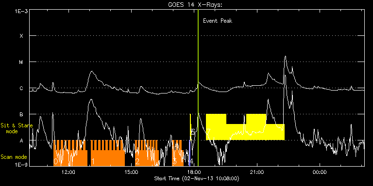 EIS Observation timeline overlay to GOES-Xray curve Code 1" 2" 40" 266" EIS Observations list for this event: STUDY ACRONYM ID DATE OBSERVED DESCRIPTION NOAA# TARGET 0 HH_Flare+AR_180x152 | 37180 | 2013/11/02 11:17:02 | AR 11884 obs | 1884 | Flare TIMELINE ID DATE OBSERVED FITS FILE XCEN (+W/-E) YCEN (+N/-S) DUR ----------------------------------------------------------------------------------------------------------------- 37180 | 2013/11/02 11:17:02.000 | eis_l0_20131102_111702.fits.gz | 75.38 | -280.61 | 5m17s 37180 | 2013/11/02 11:22:22.000 | eis_l0_20131102_112222.fits.gz | 76.08 | -280.53 | 5m17s 37180 | 2013/11/02 11:27:42.000 | eis_l0_20131102_112742.fits.gz | 77.01 | -280.61 | 5m18s 37180 | 2013/11/02 11:33:03.000 | eis_l0_20131102_113303.fits.gz | 77.78 | -280.53 | 5m17s 37180 | 2013/11/02 11:38:23.000 | eis_l0_20131102_113823.fits.gz | 78.71 | -280.53 | 5m18s 37180 | 2013/11/02 11:43:44.000 | eis_l0_20131102_114344.fits.gz | 79.40 | -280.53 | 5m19s 37180 | 2013/11/02 11:49:05.000 | eis_l0_20131102_114905.fits.gz | 80.17 | -280.53 | 5m18s 37180 | 2013/11/02 11:54:26.000 | eis_l0_20131102_115426.fits.gz | 81.02 | -280.61 | 5m18s 37180 | 2013/11/02 11:59:47.000 | eis_l0_20131102_115947.fits.gz | 81.80 | -280.53 | 5m18s 37180 | 2013/11/02 12:05:07.000 | eis_l0_20131102_120507.fits.gz | 82.65 | -280.53 | 5m18s 37180 | 2013/11/02 12:10:28.000 | eis_l0_20131102_121028.fits.gz | 83.50 | -280.68 | 5m18s 37180 | 2013/11/02 12:15:48.000 | eis_l0_20131102_121548.fits.gz | 84.27 | -280.68 | 5m18s 37180 | 2013/11/02 12:21:09.000 | eis_l0_20131102_122109.fits.gz | 85.04 | -280.61 | 5m18s 37180 | 2013/11/02 12:26:30.000 | eis_l0_20131102_122630.fits.gz | 85.81 | -280.45 | 5m18s 37180 | 2013/11/02 12:31:51.000 | eis_l0_20131102_123151.fits.gz | 86.66 | -280.61 | 5m18s 37180 | 2013/11/02 12:37:12.000 | eis_l0_20131102_123712.fits.gz | 87.51 | -280.53 | 5m18s 37180 | 2013/11/02 12:42:33.000 | eis_l0_20131102_124233.fits.gz | 88.21 | -280.53 | 5m18s 37180 | 2013/11/02 12:47:54.000 | eis_l0_20131102_124754.fits.gz | 89.13 | -280.53 | 5m17s 1 HH_Flare+AR_180x152 | 37181 | 2013/11/02 13:04:01 | AR 11884 obs | 1884 | Flare TIMELINE ID DATE OBSERVED FITS FILE XCEN (+W/-E) YCEN (+N/-S) DUR ----------------------------------------------------------------------------------------------------------------- 37181 | 2013/11/02 13:04:01.000 | eis_l0_20131102_130401.fits.gz | 91.53 | -280.45 | 5m18s 37181 | 2013/11/02 13:09:21.000 | eis_l0_20131102_130921.fits.gz | 92.30 | -280.38 | 5m19s 37181 | 2013/11/02 13:14:43.000 | eis_l0_20131102_131443.fits.gz | 93.15 | -280.38 | 5m17s 37181 | 2013/11/02 13:20:03.000 | eis_l0_20131102_132003.fits.gz | 93.92 | -280.30 | 5m17s 37181 | 2013/11/02 13:25:23.000 | eis_l0_20131102_132523.fits.gz | 94.77 | -280.30 | 5m18s 37181 | 2013/11/02 13:30:44.000 | eis_l0_20131102_133044.fits.gz | 95.55 | -280.45 | 5m17s 37181 | 2013/11/02 13:36:04.000 | eis_l0_20131102_133604.fits.gz | 96.24 | -280.45 | 5m17s 37181 | 2013/11/02 13:41:24.000 | eis_l0_20131102_134124.fits.gz | 97.09 | -280.30 | 5m18s 37181 | 2013/11/02 13:46:45.000 | eis_l0_20131102_134645.fits.gz | 97.94 | -280.45 | 5m18s 37181 | 2013/11/02 13:52:06.000 | eis_l0_20131102_135206.fits.gz | 98.71 | -280.45 | 5m18s 37181 | 2013/11/02 13:57:26.000 | eis_l0_20131102_135726.fits.gz | 99.56 | -280.14 | 5m19s 37181 | 2013/11/02 14:02:48.000 | eis_l0_20131102_140248.fits.gz | 100.33 | -280.45 | 5m18s 37181 | 2013/11/02 14:08:08.000 | eis_l0_20131102_140808.fits.gz | 101.26 | -280.38 | 5m18s 37181 | 2013/11/02 14:13:29.000 | eis_l0_20131102_141329.fits.gz | 102.04 | -280.30 | 5m18s 37181 | 2013/11/02 14:18:50.000 | eis_l0_20131102_141850.fits.gz | 102.73 | -280.14 | 5m18s 37181 | 2013/11/02 14:24:11.000 | eis_l0_20131102_142411.fits.gz | 103.58 | -280.22 | 5m18s 37181 | 2013/11/02 14:29:32.000 | eis_l0_20131102_142932.fits.gz | 104.35 | -280.30 | 5m18s 37181 | 2013/11/02 14:34:53.000 | eis_l0_20131102_143453.fits.gz | 105.12 | -280.07 | 5m18s 2 HH_Flare_162x152 | 37173 | 2013/11/02 15:10:44 | AR 11884 obs | | Flare TIMELINE ID DATE OBSERVED FITS FILE XCEN (+W/-E) YCEN (+N/-S) DUR ----------------------------------------------------------------------------------------------------------------- 37173 | 2013/11/02 15:10:44.000 | eis_l0_20131102_151044.fits.gz | 112.11 | -280.14 | 4m10s 37173 | 2013/11/02 15:14:57.000 | eis_l0_20131102_151457.fits.gz | 112.72 | -280.14 | 4m11s 37173 | 2013/11/02 15:19:10.000 | eis_l0_20131102_151910.fits.gz | 113.26 | -280.30 | 4m11s 37173 | 2013/11/02 15:23:24.000 | eis_l0_20131102_152324.fits.gz | 113.96 | -280.07 | 4m11s 37173 | 2013/11/02 15:27:38.000 | eis_l0_20131102_152738.fits.gz | 114.58 | -280.14 | 4m10s 37173 | 2013/11/02 15:31:51.000 | eis_l0_20131102_153151.fits.gz | 115.20 | -280.07 | 4m11s 37173 | 2013/11/02 15:36:04.000 | eis_l0_20131102_153604.fits.gz | 115.89 | -280.22 | 4m11s 37173 | 2013/11/02 15:40:18.000 | eis_l0_20131102_154018.fits.gz | 116.43 | -280.14 | 4m10s 37173 | 2013/11/02 15:44:31.000 | eis_l0_20131102_154431.fits.gz | 117.13 | -280.22 | 4m11s 37173 | 2013/11/02 15:48:45.000 | eis_l0_20131102_154845.fits.gz | 117.75 | -280.14 | 4m10s 37173 | 2013/11/02 15:52:58.000 | eis_l0_20131102_155258.fits.gz | 118.36 | -279.99 | 4m10s 37173 | 2013/11/02 15:57:11.000 | eis_l0_20131102_155711.fits.gz | 118.98 | -279.99 | 4m11s 37173 | 2013/11/02 16:01:25.000 | eis_l0_20131102_160125.fits.gz | 119.75 | -280.14 | 4m10s 37173 | 2013/11/02 16:05:38.000 | eis_l0_20131102_160538.fits.gz | 120.29 | -279.99 | 4m11s 37173 | 2013/11/02 16:09:51.000 | eis_l0_20131102_160951.fits.gz | 120.84 | -279.83 | 4m11s 37173 | 2013/11/02 16:14:05.000 | eis_l0_20131102_161405.fits.gz | 121.61 | -279.99 | 4m11s 3 HH_Flare+AR_180x152 | 37188 | 2013/11/02 16:57:14 | AR 11884 obs | | Flare TIMELINE ID DATE OBSERVED FITS FILE XCEN (+W/-E) YCEN (+N/-S) DUR ----------------------------------------------------------------------------------------------------------------- 37188 | 2013/11/02 16:57:14.000 | eis_l0_201