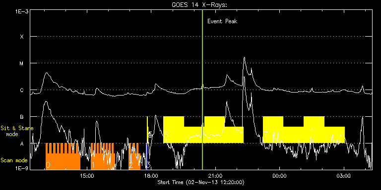EIS Observation timeline overlay to GOES-Xray curve Code 1" 2" 40" 266" EIS Observations list for this event: STUDY ACRONYM ID DATE OBSERVED DESCRIPTION NOAA# TARGET 0 HH_Flare+AR_180x152 | 37181 | 2013/11/02 13:04:01 | AR 11884 obs | 1884 | Flare TIMELINE ID DATE OBSERVED FITS FILE XCEN (+W/-E) YCEN (+N/-S) DUR ----------------------------------------------------------------------------------------------------------------- 37181 | 2013/11/02 13:04:01.000 | eis_l0_20131102_130401.fits.gz | 91.53 | -280.45 | 5m18s 37181 | 2013/11/02 13:09:21.000 | eis_l0_20131102_130921.fits.gz | 92.30 | -280.38 | 5m19s 37181 | 2013/11/02 13:14:43.000 | eis_l0_20131102_131443.fits.gz | 93.15 | -280.38 | 5m17s 37181 | 2013/11/02 13:20:03.000 | eis_l0_20131102_132003.fits.gz | 93.92 | -280.30 | 5m17s 37181 | 2013/11/02 13:25:23.000 | eis_l0_20131102_132523.fits.gz | 94.77 | -280.30 | 5m18s 37181 | 2013/11/02 13:30:44.000 | eis_l0_20131102_133044.fits.gz | 95.55 | -280.45 | 5m17s 37181 | 2013/11/02 13:36:04.000 | eis_l0_20131102_133604.fits.gz | 96.24 | -280.45 | 5m17s 37181 | 2013/11/02 13:41:24.000 | eis_l0_20131102_134124.fits.gz | 97.09 | -280.30 | 5m18s 37181 | 2013/11/02 13:46:45.000 | eis_l0_20131102_134645.fits.gz | 97.94 | -280.45 | 5m18s 37181 | 2013/11/02 13:52:06.000 | eis_l0_20131102_135206.fits.gz | 98.71 | -280.45 | 5m18s 37181 | 2013/11/02 13:57:26.000 | eis_l0_20131102_135726.fits.gz | 99.56 | -280.14 | 5m19s 37181 | 2013/11/02 14:02:48.000 | eis_l0_20131102_140248.fits.gz | 100.33 | -280.45 | 5m18s 37181 | 2013/11/02 14:08:08.000 | eis_l0_20131102_140808.fits.gz | 101.26 | -280.38 | 5m18s 37181 | 2013/11/02 14:13:29.000 | eis_l0_20131102_141329.fits.gz | 102.04 | -280.30 | 5m18s 37181 | 2013/11/02 14:18:50.000 | eis_l0_20131102_141850.fits.gz | 102.73 | -280.14 | 5m18s 37181 | 2013/11/02 14:24:11.000 | eis_l0_20131102_142411.fits.gz | 103.58 | -280.22 | 5m18s 37181 | 2013/11/02 14:29:32.000 | eis_l0_20131102_142932.fits.gz | 104.35 | -280.30 | 5m18s 37181 | 2013/11/02 14:34:53.000 | eis_l0_20131102_143453.fits.gz | 105.12 | -280.07 | 5m18s 1 HH_Flare_162x152 | 37173 | 2013/11/02 15:10:44 | AR 11884 obs | | Flare TIMELINE ID DATE OBSERVED FITS FILE XCEN (+W/-E) YCEN (+N/-S) DUR ----------------------------------------------------------------------------------------------------------------- 37173 | 2013/11/02 15:10:44.000 | eis_l0_20131102_151044.fits.gz | 112.11 | -280.14 | 4m10s 37173 | 2013/11/02 15:14:57.000 | eis_l0_20131102_151457.fits.gz | 112.72 | -280.14 | 4m11s 37173 | 2013/11/02 15:19:10.000 | eis_l0_20131102_151910.fits.gz | 113.26 | -280.30 | 4m11s 37173 | 2013/11/02 15:23:24.000 | eis_l0_20131102_152324.fits.gz | 113.96 | -280.07 | 4m11s 37173 | 2013/11/02 15:27:38.000 | eis_l0_20131102_152738.fits.gz | 114.58 | -280.14 | 4m10s 37173 | 2013/11/02 15:31:51.000 | eis_l0_20131102_153151.fits.gz | 115.20 | -280.07 | 4m11s 37173 | 2013/11/02 15:36:04.000 | eis_l0_20131102_153604.fits.gz | 115.89 | -280.22 | 4m11s 37173 | 2013/11/02 15:40:18.000 | eis_l0_20131102_154018.fits.gz | 116.43 | -280.14 | 4m10s 37173 | 2013/11/02 15:44:31.000 | eis_l0_20131102_154431.fits.gz | 117.13 | -280.22 | 4m11s 37173 | 2013/11/02 15:48:45.000 | eis_l0_20131102_154845.fits.gz | 117.75 | -280.14 | 4m10s 37173 | 2013/11/02 15:52:58.000 | eis_l0_20131102_155258.fits.gz | 118.36 | -279.99 | 4m10s 37173 | 2013/11/02 15:57:11.000 | eis_l0_20131102_155711.fits.gz | 118.98 | -279.99 | 4m11s 37173 | 2013/11/02 16:01:25.000 | eis_l0_20131102_160125.fits.gz | 119.75 | -280.14 | 4m10s 37173 | 2013/11/02 16:05:38.000 | eis_l0_20131102_160538.fits.gz | 120.29 | -279.99 | 4m11s 37173 | 2013/11/02 16:09:51.000 | eis_l0_20131102_160951.fits.gz | 120.84 | -279.83 | 4m11s 37173 | 2013/11/02 16:14:05.000 | eis_l0_20131102_161405.fits.gz | 121.61 | -279.99 | 4m11s 2 HH_Flare+AR_180x152 | 37188 | 2013/11/02 16:57:14 | AR 11884 obs | | Flare TIMELINE ID DATE OBSERVED FITS FILE XCEN (+W/-E) YCEN (+N/-S) DUR ----------------------------------------------------------------------------------------------------------------- 37188 | 2013/11/02 16:57:14.000 | eis_l0_20131102_165714.fits.gz | 126.44 | -279.83 | 5m17s 37188 | 2013/11/02 17:02:34.000 | eis_l0_20131102_170234.fits.gz | 127.37 | -279.83 | 5m17s 37188 | 2013/11/02 17:07:54.000 | eis_l0_20131102_170754.fits.gz | 128.07 | -279.91 | 5m19s 37188 | 2013/11/02 17:13:15.000 | eis_l0_20131102_171315.fits.gz | 128.92 | -279.91 | 5m18s 37188 | 2013/11/02 17:18:36.000 | eis_l0_20131102_171836.fits.gz | 129.69 | -279.83 | 5m17s 37188 | 2013/11/02 17:23:56.000 | eis_l0_20131102_172356.fits.gz | 130.54 | -279.68 | 5m18s 3 PRY_slot_contextLITE | 37152 | 2013/11/02 17:45:21 | EIS-AIA alignment | | Active Region TIMELINE ID DATE OBSERVED FITS FILE XCEN (+W/-E) YCEN (+N/-S) DUR ----------------------------------------------------------------------------------------------------------------- 37152 | 2013/11/02 17:45:21.000 | eis_l0_20131102_174521.fits.gz | -15.29 | -0.42 | 2m57s 4 Alignment_266 | 37153 | 2013/11/02 17:48:36 | EIS-AIA alignment | | Quiet Sun TIMELINE ID DATE OBSERVED FITS FILE XCEN (+W/-E) YCEN (+N/-S) DUR ----------------------------------------------------------------------------------------------------------------- 37153 | 2013/11/02 17:48:36.000 | eis_l0_20131102_174836.fits.gz | -132.57 | -0.50 | 1m22s 5 XRT_synop_AIA | 37154 | 2013/11/02 17:50:43 | EIS-AIA alignment | | Quiet Sun TIMELINE ID DATE OBSERVED FITS FILE XCEN (+W/-E) YCEN (+N/-S) DUR ----------------------------------------------------------------------------------------------------------------- 37154 | 2013/11/02 17:50:43.000 | eis_l0_20131102_175043.fits.gz | -132.57 | -0.42 | 10s 6 Flare266_Hunter01 | 37161 | 2013/11/02 18:34:54 | AR 11884 EIS-FT obs | 1884 | Flare TIMELINE ID DATE OBSERVED FITS FILE XCEN (+W/-E) YCEN (+N/-S) DUR ----------------------------------------------------------------------------------------------------------------- 37161 | 2013/11/02 18:34:54.000 | eis_l0_20131102_183454.fits.gz