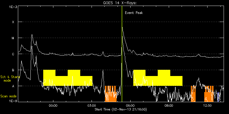 EIS Observation timeline overlay to GOES-Xray curve Code 1" 2" 40" 266" EIS Observations list for this event: STUDY ACRONYM ID DATE OBSERVED DESCRIPTION NOAA# TARGET 0 Flare266_Hunter01 | 37190 | 2013/11/02 23:13:53 | AR 11884 EIS-FT obs | 1884 | Flare TIMELINE ID DATE OBSERVED FITS FILE XCEN (+W/-E) YCEN (+N/-S) DUR ----------------------------------------------------------------------------------------------------------------- 37190 | 2013/11/02 23:13:53.000 | eis_l0_20131102_231353.fits.gz | 52.41 | -278.60 | 56m22s 37190 | 2013/11/03 00:11:07.000 | eis_l0_20131103_001107.fits.gz | 60.91 | -278.68 | 56m23s 37190 | 2013/11/03 01:08:22.000 | eis_l0_20131103_010822.fits.gz | 69.41 | -278.37 | 56m22s 37190 | 2013/11/03 02:05:36.000 | eis_l0_20131103_020536.fits.gz | 77.91 | -278.14 | 56m23s 1 HH_Flare+AR_180x152 | 37182 | 2013/11/03 04:02:15 | AR 11884 obs | 1884 | Flare TIMELINE ID DATE OBSERVED FITS FILE XCEN (+W/-E) YCEN (+N/-S) DUR ----------------------------------------------------------------------------------------------------------------- 37182 | 2013/11/03 04:02:15.000 | eis_l0_20131103_040215.fits.gz | 225.32 | -277.67 | 5m18s 37182 | 2013/11/03 04:07:36.000 | eis_l0_20131103_040736.fits.gz | 226.09 | -277.75 | 5m18s 37182 | 2013/11/03 04:12:57.000 | eis_l0_20131103_041257.fits.gz | 226.94 | -277.67 | 5m17s 37182 | 2013/11/03 04:18:17.000 | eis_l0_20131103_041817.fits.gz | 227.72 | -277.75 | 5m18s 37182 | 2013/11/03 04:23:38.000 | eis_l0_20131103_042338.fits.gz | 228.41 | -277.67 | 5m18s 37182 | 2013/11/03 04:28:59.000 | eis_l0_20131103_042859.fits.gz | 229.26 | -277.83 | 5m18s 37182 | 2013/11/03 04:34:20.000 | eis_l0_20131103_043420.fits.gz | 230.03 | -277.59 | 5m18s 37182 | 2013/11/03 04:39:40.000 | eis_l0_20131103_043940.fits.gz | 230.81 | -277.52 | 5m18s 37182 | 2013/11/03 04:45:01.000 | eis_l0_20131103_044501.fits.gz | 231.50 | -277.67 | 5m19s 37182 | 2013/11/03 04:50:23.000 | eis_l0_20131103_045023.fits.gz | 232.43 | -277.44 | 5m17s 2 Flare266_Hunter01 | 37191 | 2013/11/03 06:14:21 | AR 11884 EIS-FT obs | 1884 | Flare TIMELINE ID DATE OBSERVED FITS FILE XCEN (+W/-E) YCEN (+N/-S) DUR ----------------------------------------------------------------------------------------------------------------- 37191 | 2013/11/03 06:14:21.000 | eis_l0_20131103_061421.fits.gz | 114.52 | -277.29 | 56m22s 37191 | 2013/11/03 07:11:36.000 | eis_l0_20131103_071136.fits.gz | 122.86 | -276.90 | 56m22s 37191 | 2013/11/03 08:08:50.000 | eis_l0_20131103_080850.fits.gz | 131.05 | -276.74 | 56m22s 37191 | 2013/11/03 09:06:05.000 | eis_l0_20131103_090605.fits.gz | 139.40 | -276.51 | 56m22s 3 HH_Flare_162x152 | 37193 | 2013/11/03 10:42:48 | AR 11884 obs | 1884 | Flare TIMELINE ID DATE OBSERVED FITS FILE XCEN (+W/-E) YCEN (+N/-S) DUR ----------------------------------------------------------------------------------------------------------------- 37193 | 2013/11/03 10:42:48.000 | eis_l0_20131103_104248.fits.gz | 279.90 | -296.13 | 4m10s 37193 | 2013/11/03 10:47:01.000 | eis_l0_20131103_104701.fits.gz | 280.52 | -296.20 | 4m11s 37193 | 2013/11/03 10:51:14.000 | eis_l0_20131103_105114.fits.gz | 281.14 | -296.05 | 4m11s 37193 | 2013/11/03 10:55:28.000 | eis_l0_20131103_105528.fits.gz | 281.68 | -296.05 | 4m10s 37193 | 2013/11/03 10:59:41.000 | eis_l0_20131103_105941.fits.gz | 282.29 | -296.13 | 4m11s 4 HH_Flare+AR_180x152 | 37184 | 2013/11/03 11:44:53 | AR 11884 obs | 1884 | Flare TIMELINE ID DATE OBSERVED FITS FILE XCEN (+W/-E) YCEN (+N/-S) DUR ----------------------------------------------------------------------------------------------------------------- 37184 | 2013/11/03 11:44:53.000 | eis_l0_20131103_114453.fits.gz | 292.60 | -275.74 | 5m18s 37184 | 2013/11/03 11:50:14.000 | eis_l0_20131103_115014.fits.gz | 293.38 | -275.74 | 5m17s 37184 | 2013/11/03 11:55:34.000 | eis_l0_20131103_115534.fits.gz | 294.23 | -275.89 | 5m18s 37184 | 2013/11/03 12:00:55.000 | eis_l0_20131103_120055.fits.gz | 294.92 | -275.74 | 5m18s 37184 | 2013/11/03 12:06:15.000 | eis_l0_20131103_120615.fits.gz | 295.77 | -275.74 | 5m18s 37184 | 2013/11/03 12:11:36.000 | eis_l0_20131103_121136.fits.gz | 296.47 | -275.59 | 5m19s 37184 | 2013/11/03 12:16:58.000 | eis_l0_20131103_121658.fits.gz | 297.24 | -275.51 | 5m17s 37184 | 2013/11/03 12:22:18.000 | eis_l0_20131103_122218.fits.gz | 298.01 | -275.59 | 5m17s 5 PRY_slot_context_v3 | 37155 | 2013/11/03 12:48:20 | HOP238 -before 3rd Eclipse (cavity on | | Active Region TIMELINE ID DATE OBSERVED FITS FILE XCEN (+W/-E) YCEN (+N/-S) DUR ----------------------------------------------------------------------------------------------------------------- 37155 | 2013/11/03 12:48:20.000 | eis_l0_20131103_124820.fits.gz | 854.75 | 519.71 | 2m45s : Check study information : Download file : View thumbnails For this event, also check for:
