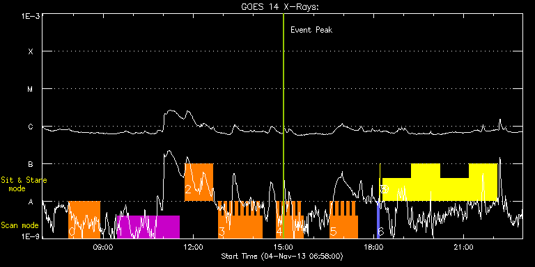EIS Observation timeline overlay to GOES-Xray curve Code 1" 2" 40" 266" EIS Observations list for this event: STUDY ACRONYM ID DATE OBSERVED DESCRIPTION NOAA# TARGET 0 Atlas_60 | 37176 | 2013/11/04 07:51:10 | AR 11884 obs | 1884 | Quiet Sun TIMELINE ID DATE OBSERVED FITS FILE XCEN (+W/-E) YCEN (+N/-S) DUR ----------------------------------------------------------------------------------------------------------------- 37176 | 2013/11/04 07:51:10.000 | eis_l0_20131104_075110.fits.gz | 461.44 | -269.10 | 1h1m39s 1 HPW021_VEL_240x512v1 | 37157 | 2013/11/04 09:28:46 | AR 11884 obs | 1884 | Active Region TIMELINE ID DATE OBSERVED FITS FILE XCEN (+W/-E) YCEN (+N/-S) DUR ----------------------------------------------------------------------------------------------------------------- 37157 | 2013/11/04 09:28:46.000 | eis_l0_20131104_092846.fits.gz | 474.42 | -268.48 | 2h3m47s 2 FLAREDOP_EIS | 37169 | 2013/11/04 11:43:07 | AR 11884 obs with SOHO/CDS | | Flare TIMELINE ID DATE OBSERVED FITS FILE XCEN (+W/-E) YCEN (+N/-S) DUR ----------------------------------------------------------------------------------------------------------------- 37169 | 2013/11/04 11:43:07.000 | eis_l0_20131104_114307.fits.gz | 491.64 | -267.71 | 55m50s 3 IUU_SCAN_STEPS_002 | 37177 | 2013/11/04 12:50:31 | AR 11884 obs | | Active Region TIMELINE ID DATE OBSERVED FITS FILE XCEN (+W/-E) YCEN (+N/-S) DUR ----------------------------------------------------------------------------------------------------------------- 37177 | 2013/11/04 12:50:31.000 | eis_l0_20131104_125031.fits.gz | 499.45 | -267.32 | 5m23s 37177 | 2013/11/04 12:55:57.000 | eis_l0_20131104_125557.fits.gz | 500.14 | -267.24 | 5m24s 37177 | 2013/11/04 13:01:24.000 | eis_l0_20131104_130124.fits.gz | 500.69 | -267.32 | 5m23s 37177 | 2013/11/04 13:06:51.000 | eis_l0_20131104_130651.fits.gz | 501.54 | -267.40 | 5m23s 37177 | 2013/11/04 13:12:17.000 | eis_l0_20131104_131217.fits.gz | 502.23 | -267.17 | 5m24s 37177 | 2013/11/04 13:17:44.000 | eis_l0_20131104_131744.fits.gz | 502.93 | -267.17 | 5m24s 37177 | 2013/11/04 13:23:11.000 | eis_l0_20131104_132311.fits.gz | 503.62 | -267.17 | 5m23s 37177 | 2013/11/04 13:28:38.000 | eis_l0_20131104_132838.fits.gz | 504.39 | -267.09 | 5m23s 37177 | 2013/11/04 13:34:05.000 | eis_l0_20131104_133405.fits.gz | 504.93 | -267.01 | 5m23s 37177 | 2013/11/04 13:39:31.000 | eis_l0_20131104_133931.fits.gz | 505.71 | -267.01 | 5m24s 37177 | 2013/11/04 13:44:58.000 | eis_l0_20131104_134458.fits.gz | 506.40 | -266.93 | 5m24s 37177 | 2013/11/04 13:50:25.000 | eis_l0_20131104_135025.fits.gz | 507.10 | -266.86 | 5m23s 37177 | 2013/11/04 13:55:52.000 | eis_l0_20131104_135552.fits.gz | 507.79 | -266.78 | 5m23s 37177 | 2013/11/04 14:01:19.000 | eis_l0_20131104_140119.fits.gz | 508.64 | -266.86 | 5m23s 37177 | 2013/11/04 14:06:45.000 | eis_l0_20131104_140645.fits.gz | 509.18 | -266.78 | 5m24s 37177 | 2013/11/04 14:12:12.000 | eis_l0_20131104_141212.fits.gz | 509.88 | -266.78 | 5m23s 4 IUU_SCAN_STEPS_002 | 37178 | 2013/11/04 14:45:12 | AR 11884 obs | | Active Region TIMELINE ID DATE OBSERVED FITS FILE XCEN (+W/-E) YCEN (+N/-S) DUR ----------------------------------------------------------------------------------------------------------------- 37178 | 2013/11/04 14:45:12.000 | eis_l0_20131104_144512.fits.gz | 514.20 | -266.62 | 5m24s 37178 | 2013/11/04 14:50:40.000 | eis_l0_20131104_145040.fits.gz | 514.82 | -266.55 | 5m23s 37178 | 2013/11/04 14:56:06.000 | eis_l0_20131104_145606.fits.gz | 515.44 | -266.55 | 5m24s 37178 | 2013/11/04 15:01:33.000 | eis_l0_20131104_150133.fits.gz | 516.14 | -266.47 | 5m23s 37178 | 2013/11/04 15:07:00.000 | eis_l0_20131104_150700.fits.gz | 516.83 | -266.24 | 5m23s 37178 | 2013/11/04 15:12:27.000 | eis_l0_20131104_151227.fits.gz | 517.53 | -266.39 | 5m23s 37178 | 2013/11/04 15:17:53.000 | eis_l0_20131104_151753.fits.gz | 518.14 | -266.24 | 5m24s 37178 | 2013/11/04 15:23:20.000 | eis_l0_20131104_152320.fits.gz | 518.92 | -266.24 | 5m23s 37178 | 2013/11/04 15:28:47.000 | eis_l0_20131104_152847.fits.gz | 519.61 | -266.24 | 5m23s 37178 | 2013/11/04 15:34:13.000 | eis_l0_20131104_153413.fits.gz | 520.23 | -266.16 | 5m24s 5 IUU_SCAN_STEPS_002 | 37179 | 2013/11/04 16:33:12 | AR 11884 obs | | Active Region TIMELINE ID DATE OBSERVED FITS FILE XCEN (+W/-E) YCEN (+N/-S) DUR ----------------------------------------------------------------------------------------------------------------- 37179 | 2013/11/04 16:33:12.000 | eis_l0_20131104_163312.fits.gz | 527.80 | -265.93 | 5m24s 37179 | 2013/11/04 16:38:39.000 | eis_l0_20131104_163839.fits.gz | 528.34 | -265.77 | 5m24s 37179 | 2013/11/04 16:44:06.000 | eis_l0_20131104_164406.fits.gz | 529.11 | -265.77 | 5m23s 37179 | 2013/11/04 16:49:33.000 | eis_l0_20131104_164933.fits.gz | 529.65 | -265.70 | 5m23s 37179 | 2013/11/04 16:55:00.000 | eis_l0_20131104_165500.fits.gz | 530.50 | -265.62 | 5m23s 37179 | 2013/11/04 17:00:26.000 | eis_l0_20131104_170026.fits.gz | 531.12 | -265.70 | 5m24s 37179 | 2013/11/04 17:05:53.000 | eis_l0_20131104_170553.fits.gz | 531.82 | -265.54 | 5m24s 37179 | 2013/11/04 17:11:20.000 | eis_l0_20131104_171120.fits.gz | 532.51 | -265.62 | 5m23s 37179 | 2013/11/04 17:16:47.000 | eis_l0_20131104_171647.fits.gz | 533.13 | -265.54 | 5m23s 37179 | 2013/11/04 17:22:13.000 | eis_l0_20131104_172213.fits.gz | 533.90 | -265.47 | 5m24s 6 PRY_slot_contextLITE | 37158 | 2013/11/04 18:07:49 | EIS-AIA alignment | | Active Region TIMELINE ID DATE OBSERVED FITS FILE XCEN (+W/-E) YCEN (+N/-S) DUR ----------------------------------------------------------------------------------------------------------------- 37158 | 2013/11/04 18:07:49.000 | eis_l0_20131104_180749.fits.gz | -15.29 | -0.58 | 2m56s 7 Alignment_266 | 37159 | 2013/11/04 18:11:04 | EIS-AIA alignment | | Quiet Sun TIMELINE ID DATE OBSERVED FITS FILE XCEN (+W/-E) YCEN (+N/-S) DUR ----------------------------------------------------------------------------------------------------------------- 37159 | 2013/11/04 18:11:04.000 | eis_