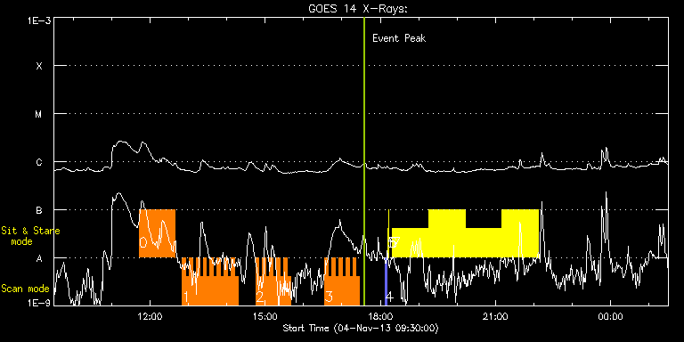 EIS Observation timeline overlay to GOES-Xray curve Code 1" 2" 40" 266" EIS Observations list for this event: STUDY ACRONYM ID DATE OBSERVED DESCRIPTION NOAA# TARGET 0 FLAREDOP_EIS | 37169 | 2013/11/04 11:43:07 | AR 11884 obs with SOHO/CDS | | Flare TIMELINE ID DATE OBSERVED FITS FILE XCEN (+W/-E) YCEN (+N/-S) DUR ----------------------------------------------------------------------------------------------------------------- 37169 | 2013/11/04 11:43:07.000 | eis_l0_20131104_114307.fits.gz | 491.64 | -267.71 | 55m50s 1 IUU_SCAN_STEPS_002 | 37177 | 2013/11/04 12:50:31 | AR 11884 obs | | Active Region TIMELINE ID DATE OBSERVED FITS FILE XCEN (+W/-E) YCEN (+N/-S) DUR ----------------------------------------------------------------------------------------------------------------- 37177 | 2013/11/04 12:50:31.000 | eis_l0_20131104_125031.fits.gz | 499.45 | -267.32 | 5m23s 37177 | 2013/11/04 12:55:57.000 | eis_l0_20131104_125557.fits.gz | 500.14 | -267.24 | 5m24s 37177 | 2013/11/04 13:01:24.000 | eis_l0_20131104_130124.fits.gz | 500.69 | -267.32 | 5m23s 37177 | 2013/11/04 13:06:51.000 | eis_l0_20131104_130651.fits.gz | 501.54 | -267.40 | 5m23s 37177 | 2013/11/04 13:12:17.000 | eis_l0_20131104_131217.fits.gz | 502.23 | -267.17 | 5m24s 37177 | 2013/11/04 13:17:44.000 | eis_l0_20131104_131744.fits.gz | 502.93 | -267.17 | 5m24s 37177 | 2013/11/04 13:23:11.000 | eis_l0_20131104_132311.fits.gz | 503.62 | -267.17 | 5m23s 37177 | 2013/11/04 13:28:38.000 | eis_l0_20131104_132838.fits.gz | 504.39 | -267.09 | 5m23s 37177 | 2013/11/04 13:34:05.000 | eis_l0_20131104_133405.fits.gz | 504.93 | -267.01 | 5m23s 37177 | 2013/11/04 13:39:31.000 | eis_l0_20131104_133931.fits.gz | 505.71 | -267.01 | 5m24s 37177 | 2013/11/04 13:44:58.000 | eis_l0_20131104_134458.fits.gz | 506.40 | -266.93 | 5m24s 37177 | 2013/11/04 13:50:25.000 | eis_l0_20131104_135025.fits.gz | 507.10 | -266.86 | 5m23s 37177 | 2013/11/04 13:55:52.000 | eis_l0_20131104_135552.fits.gz | 507.79 | -266.78 | 5m23s 37177 | 2013/11/04 14:01:19.000 | eis_l0_20131104_140119.fits.gz | 508.64 | -266.86 | 5m23s 37177 | 2013/11/04 14:06:45.000 | eis_l0_20131104_140645.fits.gz | 509.18 | -266.78 | 5m24s 37177 | 2013/11/04 14:12:12.000 | eis_l0_20131104_141212.fits.gz | 509.88 | -266.78 | 5m23s 2 IUU_SCAN_STEPS_002 | 37178 | 2013/11/04 14:45:12 | AR 11884 obs | | Active Region TIMELINE ID DATE OBSERVED FITS FILE XCEN (+W/-E) YCEN (+N/-S) DUR ----------------------------------------------------------------------------------------------------------------- 37178 | 2013/11/04 14:45:12.000 | eis_l0_20131104_144512.fits.gz | 514.20 | -266.62 | 5m24s 37178 | 2013/11/04 14:50:40.000 | eis_l0_20131104_145040.fits.gz | 514.82 | -266.55 | 5m23s 37178 | 2013/11/04 14:56:06.000 | eis_l0_20131104_145606.fits.gz | 515.44 | -266.55 | 5m24s 37178 | 2013/11/04 15:01:33.000 | eis_l0_20131104_150133.fits.gz | 516.14 | -266.47 | 5m23s 37178 | 2013/11/04 15:07:00.000 | eis_l0_20131104_150700.fits.gz | 516.83 | -266.24 | 5m23s 37178 | 2013/11/04 15:12:27.000 | eis_l0_20131104_151227.fits.gz | 517.53 | -266.39 | 5m23s 37178 | 2013/11/04 15:17:53.000 | eis_l0_20131104_151753.fits.gz | 518.14 | -266.24 | 5m24s 37178 | 2013/11/04 15:23:20.000 | eis_l0_20131104_152320.fits.gz | 518.92 | -266.24 | 5m23s 37178 | 2013/11/04 15:28:47.000 | eis_l0_20131104_152847.fits.gz | 519.61 | -266.24 | 5m23s 37178 | 2013/11/04 15:34:13.000 | eis_l0_20131104_153413.fits.gz | 520.23 | -266.16 | 5m24s 3 IUU_SCAN_STEPS_002 | 37179 | 2013/11/04 16:33:12 | AR 11884 obs | | Active Region TIMELINE ID DATE OBSERVED FITS FILE XCEN (+W/-E) YCEN (+N/-S) DUR ----------------------------------------------------------------------------------------------------------------- 37179 | 2013/11/04 16:33:12.000 | eis_l0_20131104_163312.fits.gz | 527.80 | -265.93 | 5m24s 37179 | 2013/11/04 16:38:39.000 | eis_l0_20131104_163839.fits.gz | 528.34 | -265.77 | 5m24s 37179 | 2013/11/04 16:44:06.000 | eis_l0_20131104_164406.fits.gz | 529.11 | -265.77 | 5m23s 37179 | 2013/11/04 16:49:33.000 | eis_l0_20131104_164933.fits.gz | 529.65 | -265.70 | 5m23s 37179 | 2013/11/04 16:55:00.000 | eis_l0_20131104_165500.fits.gz | 530.50 | -265.62 | 5m23s 37179 | 2013/11/04 17:00:26.000 | eis_l0_20131104_170026.fits.gz | 531.12 | -265.70 | 5m24s 37179 | 2013/11/04 17:05:53.000 | eis_l0_20131104_170553.fits.gz | 531.82 | -265.54 | 5m24s 37179 | 2013/11/04 17:11:20.000 | eis_l0_20131104_171120.fits.gz | 532.51 | -265.62 | 5m23s 37179 | 2013/11/04 17:16:47.000 | eis_l0_20131104_171647.fits.gz | 533.13 | -265.54 | 5m23s 37179 | 2013/11/04 17:22:13.000 | eis_l0_20131104_172213.fits.gz | 533.90 | -265.47 | 5m24s 4 PRY_slot_contextLITE | 37158 | 2013/11/04 18:07:49 | EIS-AIA alignment | | Active Region TIMELINE ID DATE OBSERVED FITS FILE XCEN (+W/-E) YCEN (+N/-S) DUR ----------------------------------------------------------------------------------------------------------------- 37158 | 2013/11/04 18:07:49.000 | eis_l0_20131104_180749.fits.gz | -15.29 | -0.58 | 2m56s 5 Alignment_266 | 37159 | 2013/11/04 18:11:04 | EIS-AIA alignment | | Quiet Sun TIMELINE ID DATE OBSERVED FITS FILE XCEN (+W/-E) YCEN (+N/-S) DUR ----------------------------------------------------------------------------------------------------------------- 37159 | 2013/11/04 18:11:04.000 | eis_l0_20131104_181104.fits.gz | -132.49 | -0.42 | 1m22s 6 XRT_synop_AIA | 37160 | 2013/11/04 18:13:11 | EIS-AIA alignment | | Quiet Sun TIMELINE ID DATE OBSERVED FITS FILE XCEN (+W/-E) YCEN (+N/-S) DUR ----------------------------------------------------------------------------------------------------------------- 37160 | 2013/11/04 18:13:11.000 | eis_l0_20131104_181311.fits.gz | -132.57 | -0.50 | 10s 7 Flare266_Hunter01 | 37196 | 2013/11/04 18:18:30 | AR 11884 EIS-FT obs | 1884 | Flare TIMELINE ID DATE OBSERVED FITS FILE XCEN (+W/-E) YCEN (+N/-S) DUR ----------------------------------------------------------------------------------------------------------------- 37196 | 2013/11/04 18:18:30.000 | eis_l0_2013