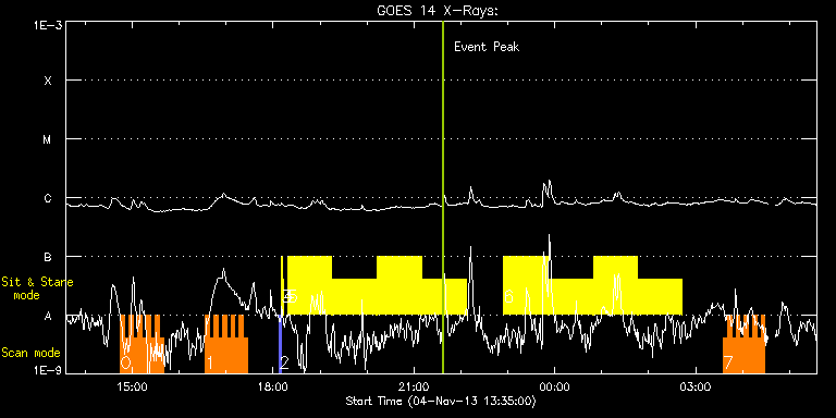 EIS Observation timeline overlay to GOES-Xray curve Code 1" 2" 40" 266" EIS Observations list for this event: STUDY ACRONYM ID DATE OBSERVED DESCRIPTION NOAA# TARGET 0 IUU_SCAN_STEPS_002 | 37178 | 2013/11/04 14:45:12 | AR 11884 obs | | Active Region TIMELINE ID DATE OBSERVED FITS FILE XCEN (+W/-E) YCEN (+N/-S) DUR ----------------------------------------------------------------------------------------------------------------- 37178 | 2013/11/04 14:45:12.000 | eis_l0_20131104_144512.fits.gz | 514.20 | -266.62 | 5m24s 37178 | 2013/11/04 14:50:40.000 | eis_l0_20131104_145040.fits.gz | 514.82 | -266.55 | 5m23s 37178 | 2013/11/04 14:56:06.000 | eis_l0_20131104_145606.fits.gz | 515.44 | -266.55 | 5m24s 37178 | 2013/11/04 15:01:33.000 | eis_l0_20131104_150133.fits.gz | 516.14 | -266.47 | 5m23s 37178 | 2013/11/04 15:07:00.000 | eis_l0_20131104_150700.fits.gz | 516.83 | -266.24 | 5m23s 37178 | 2013/11/04 15:12:27.000 | eis_l0_20131104_151227.fits.gz | 517.53 | -266.39 | 5m23s 37178 | 2013/11/04 15:17:53.000 | eis_l0_20131104_151753.fits.gz | 518.14 | -266.24 | 5m24s 37178 | 2013/11/04 15:23:20.000 | eis_l0_20131104_152320.fits.gz | 518.92 | -266.24 | 5m23s 37178 | 2013/11/04 15:28:47.000 | eis_l0_20131104_152847.fits.gz | 519.61 | -266.24 | 5m23s 37178 | 2013/11/04 15:34:13.000 | eis_l0_20131104_153413.fits.gz | 520.23 | -266.16 | 5m24s 1 IUU_SCAN_STEPS_002 | 37179 | 2013/11/04 16:33:12 | AR 11884 obs | | Active Region TIMELINE ID DATE OBSERVED FITS FILE XCEN (+W/-E) YCEN (+N/-S) DUR ----------------------------------------------------------------------------------------------------------------- 37179 | 2013/11/04 16:33:12.000 | eis_l0_20131104_163312.fits.gz | 527.80 | -265.93 | 5m24s 37179 | 2013/11/04 16:38:39.000 | eis_l0_20131104_163839.fits.gz | 528.34 | -265.77 | 5m24s 37179 | 2013/11/04 16:44:06.000 | eis_l0_20131104_164406.fits.gz | 529.11 | -265.77 | 5m23s 37179 | 2013/11/04 16:49:33.000 | eis_l0_20131104_164933.fits.gz | 529.65 | -265.70 | 5m23s 37179 | 2013/11/04 16:55:00.000 | eis_l0_20131104_165500.fits.gz | 530.50 | -265.62 | 5m23s 37179 | 2013/11/04 17:00:26.000 | eis_l0_20131104_170026.fits.gz | 531.12 | -265.70 | 5m24s 37179 | 2013/11/04 17:05:53.000 | eis_l0_20131104_170553.fits.gz | 531.82 | -265.54 | 5m24s 37179 | 2013/11/04 17:11:20.000 | eis_l0_20131104_171120.fits.gz | 532.51 | -265.62 | 5m23s 37179 | 2013/11/04 17:16:47.000 | eis_l0_20131104_171647.fits.gz | 533.13 | -265.54 | 5m23s 37179 | 2013/11/04 17:22:13.000 | eis_l0_20131104_172213.fits.gz | 533.90 | -265.47 | 5m24s 2 PRY_slot_contextLITE | 37158 | 2013/11/04 18:07:49 | EIS-AIA alignment | | Active Region TIMELINE ID DATE OBSERVED FITS FILE XCEN (+W/-E) YCEN (+N/-S) DUR ----------------------------------------------------------------------------------------------------------------- 37158 | 2013/11/04 18:07:49.000 | eis_l0_20131104_180749.fits.gz | -15.29 | -0.58 | 2m56s 3 Alignment_266 | 37159 | 2013/11/04 18:11:04 | EIS-AIA alignment | | Quiet Sun TIMELINE ID DATE OBSERVED FITS FILE XCEN (+W/-E) YCEN (+N/-S) DUR ----------------------------------------------------------------------------------------------------------------- 37159 | 2013/11/04 18:11:04.000 | eis_l0_20131104_181104.fits.gz | -132.49 | -0.42 | 1m22s 4 XRT_synop_AIA | 37160 | 2013/11/04 18:13:11 | EIS-AIA alignment | | Quiet Sun TIMELINE ID DATE OBSERVED FITS FILE XCEN (+W/-E) YCEN (+N/-S) DUR ----------------------------------------------------------------------------------------------------------------- 37160 | 2013/11/04 18:13:11.000 | eis_l0_20131104_181311.fits.gz | -132.57 | -0.50 | 10s 5 Flare266_Hunter01 | 37196 | 2013/11/04 18:18:30 | AR 11884 EIS-FT obs | 1884 | Flare TIMELINE ID DATE OBSERVED FITS FILE XCEN (+W/-E) YCEN (+N/-S) DUR ----------------------------------------------------------------------------------------------------------------- 37196 | 2013/11/04 18:18:30.000 | eis_l0_20131104_181830.fits.gz | 409.92 | -265.00 | 56m22s 37196 | 2013/11/04 19:15:45.000 | eis_l0_20131104_191545.fits.gz | 416.95 | -264.39 | 56m22s 37196 | 2013/11/04 20:12:59.000 | eis_l0_20131104_201259.fits.gz | 423.90 | -264.08 | 56m23s 37196 | 2013/11/04 21:10:14.000 | eis_l0_20131104_211014.fits.gz | 431.00 | -263.84 | 56m22s 6 Flare266_Hunter01 | 37197 | 2013/11/04 22:54:37 | AR 11884 EIS-FT obs | 1884 | Flare TIMELINE ID DATE OBSERVED FITS FILE XCEN (+W/-E) YCEN (+N/-S) DUR ----------------------------------------------------------------------------------------------------------------- 37197 | 2013/11/04 22:54:37.000 | eis_l0_20131104_225437.fits.gz | 443.60 | -263.23 | 56m23s 37197 | 2013/11/04 23:51:52.000 | eis_l0_20131104_235152.fits.gz | 450.32 | -262.53 | 56m22s 37197 | 2013/11/05 00:49:06.000 | eis_l0_20131105_004906.fits.gz | 457.27 | -262.30 | 56m23s 37197 | 2013/11/05 01:46:21.000 | eis_l0_20131105_014621.fits.gz | 463.99 | -261.68 | 56m22s 7 HH_Flare+AR_180x152 | 37186 | 2013/11/05 03:35:19 | AR 11884 obs | 1884 | Flare TIMELINE ID DATE OBSERVED FITS FILE XCEN (+W/-E) YCEN (+N/-S) DUR ----------------------------------------------------------------------------------------------------------------- 37186 | 2013/11/05 03:35:19.000 | eis_l0_20131105_033519.fits.gz | 606.92 | -260.75 | 5m17s 37186 | 2013/11/05 03:40:39.000 | eis_l0_20131105_034039.fits.gz | 607.62 | -260.91 | 5m19s 37186 | 2013/11/05 03:46:01.000 | eis_l0_20131105_034601.fits.gz | 608.24 | -260.83 | 5m17s 37186 | 2013/11/05 03:51:21.000 | eis_l0_20131105_035121.fits.gz | 608.86 | -260.68 | 5m17s 37186 | 2013/11/05 03:56:41.000 | eis_l0_20131105_035641.fits.gz | 609.40 | -260.68 | 5m19s 37186 | 2013/11/05 04:02:02.000 | eis_l0_20131105_040202.fits.gz | 610.09 | -260.75 | 5m18s 37186 | 2013/11/05 04:07:23.000 | eis_l0_20131105_040723.fits.gz | 610.71 | -260.60 | 5m17s 37186 | 2013/11/05 04:12:43.000 | eis_l0_20131105_041243.fits.gz | 611.25 | -260.52 | 5m18s 37186 | 2013/11/05 04:18:04.000 | eis_l0_20131105_041804.fits.gz | 611.95 | -260.83 | 5m18s 37186 | 2013/11/05 04:23:24.000 | eis