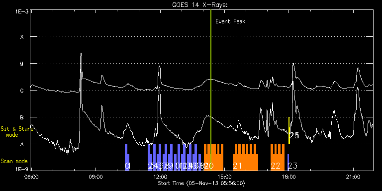 EIS Observation timeline overlay to GOES-Xray curve Code 1" 2" 40" 266" EIS Observations list for this event: STUDY ACRONYM ID DATE OBSERVED DESCRIPTION NOAA# TARGET 0 full_sun_slot_scan_1 | 37198 | 2013/11/05 10:21:20 | HOP130 full_sun_scan #1t | | Quiet Sun TIMELINE ID DATE OBSERVED FITS FILE XCEN (+W/-E) YCEN (+N/-S) DUR ----------------------------------------------------------------------------------------------------------------- 37198 | 2013/11/05 10:21:20.000 | eis_l0_20131105_102120.fits.gz | 920.72 | 185.58 | 5m28s 1 full_sun_slot_scan_1 | 37199 | 2013/11/05 10:26:53 | HOP130 full_sun_scan #1b | 1882 | Quiet Sun TIMELINE ID DATE OBSERVED FITS FILE XCEN (+W/-E) YCEN (+N/-S) DUR ----------------------------------------------------------------------------------------------------------------- 37199 | 2013/11/05 10:26:53.000 | eis_l0_20131105_102653.fits.gz | 920.80 | -286.35 | 5m27s 2 full_sun_slot_scan_1 | 37206 | 2013/11/05 11:25:14 | HOP130 full_sun_scan #5t | | Quiet Sun TIMELINE ID DATE OBSERVED FITS FILE XCEN (+W/-E) YCEN (+N/-S) DUR ----------------------------------------------------------------------------------------------------------------- 37206 | 2013/11/05 11:25:14.000 | eis_l0_20131105_112514.fits.gz | -9884.69 | -9777.20 | 5m27s 3 full_sun_slot_scan_1 | 37207 | 2013/11/05 11:30:46 | HOP130 full_sun_scan #5b | | Quiet Sun TIMELINE ID DATE OBSERVED FITS FILE XCEN (+W/-E) YCEN (+N/-S) DUR ----------------------------------------------------------------------------------------------------------------- 37207 | 2013/11/05 11:30:46.000 | eis_l0_20131105_113046.fits.gz | -9884.69 | -10249.20 | 5m27s 4 full_sun_slot_scan_1 | 37208 | 2013/11/05 11:41:14 | HOP130 full_sun_scan #6 | | Quiet Sun TIMELINE ID DATE OBSERVED FITS FILE XCEN (+W/-E) YCEN (+N/-S) DUR ----------------------------------------------------------------------------------------------------------------- 37208 | 2013/11/05 11:41:14.000 | eis_l0_20131105_114114.fits.gz | 761.05 | 655.55 | 5m27s 5 full_sun_slot_scan_1 | 37209 | 2013/11/05 11:51:14 | HOP130 full_sun_scan #7t | | Quiet Sun TIMELINE ID DATE OBSERVED FITS FILE XCEN (+W/-E) YCEN (+N/-S) DUR ----------------------------------------------------------------------------------------------------------------- 37209 | 2013/11/05 11:51:14.000 | eis_l0_20131105_115114.fits.gz | 395.82 | 1032.75 | 5m27s 6 full_sun_slot_scan_1 | 37210 | 2013/11/05 11:56:46 | HOP130 full_sun_scan #7b | | Quiet Sun TIMELINE ID DATE OBSERVED FITS FILE XCEN (+W/-E) YCEN (+N/-S) DUR ----------------------------------------------------------------------------------------------------------------- 37210 | 2013/11/05 11:56:46.000 | eis_l0_20131105_115646.fits.gz | 395.90 | 560.60 | 5m27s 7 full_sun_slot_scan_1 | 37211 | 2013/11/05 12:07:14 | HOP130 full_sun_scan #8t | | Quiet Sun TIMELINE ID DATE OBSERVED FITS FILE XCEN (+W/-E) YCEN (+N/-S) DUR ----------------------------------------------------------------------------------------------------------------- 37211 | 2013/11/05 12:07:14.000 | eis_l0_20131105_120714.fits.gz | -15.21 | 1126.69 | 5m27s 8 full_sun_slot_scan_1 | 37212 | 2013/11/05 12:12:46 | HOP130 full_sun_scan #8b | | Quiet Sun TIMELINE ID DATE OBSERVED FITS FILE XCEN (+W/-E) YCEN (+N/-S) DUR ----------------------------------------------------------------------------------------------------------------- 37212 | 2013/11/05 12:12:46.000 | eis_l0_20131105_121246.fits.gz | -15.29 | 654.61 | 5m27s 9 full_sun_slot_scan_1 | 37213 | 2013/11/05 12:23:14 | HOP130 full_sun_scan #9t | | Quiet Sun TIMELINE ID DATE OBSERVED FITS FILE XCEN (+W/-E) YCEN (+N/-S) DUR ----------------------------------------------------------------------------------------------------------------- 37213 | 2013/11/05 12:23:14.000 | eis_l0_20131105_122314.fits.gz | -426.15 | 1032.44 | 5m27s 10 full_sun_slot_scan_1 | 37214 | 2013/11/05 12:28:46 | HOP130 full_sun_scan #9b | | Quiet Sun TIMELINE ID DATE OBSERVED FITS FILE XCEN (+W/-E) YCEN (+N/-S) DUR ----------------------------------------------------------------------------------------------------------------- 37214 | 2013/11/05 12:28:46.000 | eis_l0_20131105_122846.fits.gz | -426.08 | 560.52 | 5m27s 11 full_sun_slot_scan_1 | 37215 | 2013/11/05 12:39:14 | HOP130 full_sun_scan #10 | | Quiet Sun TIMELINE ID DATE OBSERVED FITS FILE XCEN (+W/-E) YCEN (+N/-S) DUR ----------------------------------------------------------------------------------------------------------------- 37215 | 2013/11/05 12:39:14.000 | eis_l0_20131105_123914.fits.gz | -830.08 | 655.47 | 5m27s 12 full_sun_slot_scan_1 | 37216 | 2013/11/05 12:49:14 | HOP130 full_sun_scan #11 | | Quiet Sun TIMELINE ID DATE OBSERVED FITS FILE XCEN (+W/-E) YCEN (+N/-S) DUR ----------------------------------------------------------------------------------------------------------------- 37216 | 2013/11/05 12:49:14.000 | eis_l0_20131105_124914.fits.gz | 800.14 | -757.02 | 5m26s 13 full_sun_slot_scan_1 | 37217 | 2013/11/05 12:59:14 | HOP130 full_sun_scan #12t | | Quiet Sun TIMELINE ID DATE OBSERVED FITS FILE XCEN (+W/-E) YCEN (+N/-S) DUR ----------------------------------------------------------------------------------------------------------------- 37217 | 2013/11/05 12:59:14.000 | eis_l0_20131105_125914.fits.gz | 395.82 | -661.44 | 5m27s 14 full_sun_slot_scan_1 | 37218 | 2013/11/05 13:04:46 | HOP130 full_sun_scan #12b | | Quiet Sun TIMELINE ID DATE OBSERVED FITS FILE XCEN (+W/-E) YCEN (+N/-S) DUR ----------------------------------------------------------------------------------------------------------------- 37218 | 2013/11/05 13:04:46.000 | eis_l0_20131105_130446.fits.gz | 395.82 | -1133.52 | 5m27s 15 full_sun_slot_scan_1 | 37219 | 2013/11/05 13:15:14 | HOP130 full_sun_scan #13t | | Quiet Sun TIMELINE ID DATE OBSERVED FITS FILE XCEN (+W/-E) YCEN (+N/-S) DUR ----------------------------------------------------------------------------------------------------------------- 37219 | 2013/11/05 13:15:14.000 | eis_l0_20131105_13