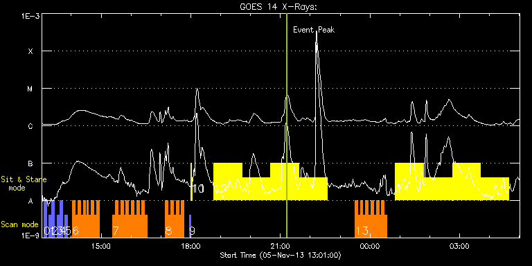 EIS Observation timeline overlay to GOES-Xray curve Code 1" 2" 40" 266" EIS Observations list for this event: STUDY ACRONYM ID DATE OBSERVED DESCRIPTION NOAA# TARGET 0 full_sun_slot_scan_1 | 37218 | 2013/11/05 13:04:46 | HOP130 full_sun_scan #12b | | Quiet Sun TIMELINE ID DATE OBSERVED FITS FILE XCEN (+W/-E) YCEN (+N/-S) DUR ----------------------------------------------------------------------------------------------------------------- 37218 | 2013/11/05 13:04:46.000 | eis_l0_20131105_130446.fits.gz | 395.82 | -1133.52 | 5m27s 1 full_sun_slot_scan_1 | 37219 | 2013/11/05 13:15:14 | HOP130 full_sun_scan #13t | | Quiet Sun TIMELINE ID DATE OBSERVED FITS FILE XCEN (+W/-E) YCEN (+N/-S) DUR ----------------------------------------------------------------------------------------------------------------- 37219 | 2013/11/05 13:15:14.000 | eis_l0_20131105_131514.fits.gz | -15.29 | -755.53 | 5m27s 2 full_sun_slot_scan_1 | 37220 | 2013/11/05 13:20:46 | HOP130 full_sun_scan #13b | | Quiet Sun TIMELINE ID DATE OBSERVED FITS FILE XCEN (+W/-E) YCEN (+N/-S) DUR ----------------------------------------------------------------------------------------------------------------- 37220 | 2013/11/05 13:20:46.000 | eis_l0_20131105_132046.fits.gz | -15.29 | -1227.45 | 5m27s 3 full_sun_slot_scan_1 | 37221 | 2013/11/05 13:31:14 | HOP130 full_sun_scan #14t | | Quiet Sun TIMELINE ID DATE OBSERVED FITS FILE XCEN (+W/-E) YCEN (+N/-S) DUR ----------------------------------------------------------------------------------------------------------------- 37221 | 2013/11/05 13:31:14.000 | eis_l0_20131105_133114.fits.gz | -426.40 | -661.29 | 5m27s 4 full_sun_slot_scan_1 | 37222 | 2013/11/05 13:36:46 | HOP130 full_sun_scan #14b | | Quiet Sun TIMELINE ID DATE OBSERVED FITS FILE XCEN (+W/-E) YCEN (+N/-S) DUR ----------------------------------------------------------------------------------------------------------------- 37222 | 2013/11/05 13:36:46.000 | eis_l0_20131105_133646.fits.gz | -426.15 | -1133.67 | 5m27s 5 full_sun_slot_scan_1 | 37223 | 2013/11/05 13:47:14 | HOP130 full_sun_scan #15 | | Quiet Sun TIMELINE ID DATE OBSERVED FITS FILE XCEN (+W/-E) YCEN (+N/-S) DUR ----------------------------------------------------------------------------------------------------------------- 37223 | 2013/11/05 13:47:14.000 | eis_l0_20131105_134714.fits.gz | -830.08 | -757.25 | 5m27s 6 HH_Flare+AR_180x152H | 37239 | 2013/11/05 14:02:34 | AR11884 obs | | Flare TIMELINE ID DATE OBSERVED FITS FILE XCEN (+W/-E) YCEN (+N/-S) DUR ----------------------------------------------------------------------------------------------------------------- 37239 | 2013/11/05 14:02:34.000 | eis_l0_20131105_140234.fits.gz | 676.68 | -255.81 | 5m18s 37239 | 2013/11/05 14:07:55.000 | eis_l0_20131105_140755.fits.gz | 677.14 | -255.89 | 5m18s 37239 | 2013/11/05 14:13:16.000 | eis_l0_20131105_141316.fits.gz | 677.53 | -255.81 | 5m18s 37239 | 2013/11/05 14:18:37.000 | eis_l0_20131105_141837.fits.gz | 678.15 | -255.66 | 5m17s 37239 | 2013/11/05 14:23:57.000 | eis_l0_20131105_142357.fits.gz | 678.77 | -255.89 | 5m19s 37239 | 2013/11/05 14:29:18.000 | eis_l0_20131105_142918.fits.gz | 679.31 | -255.58 | 3m 37239 | 2013/11/05 14:31:26.000 | eis_l0_20131105_143126.fits.gz | 679.61 | -255.58 | 3m10s 37239 | 2013/11/05 14:34:39.000 | eis_l0_20131105_143439.fits.gz | 679.77 | -255.58 | 5m17s 37239 | 2013/11/05 14:39:59.000 | eis_l0_20131105_143959.fits.gz | 680.39 | -255.50 | 5m18s 37239 | 2013/11/05 14:45:20.000 | eis_l0_20131105_144520.fits.gz | 681.01 | -255.42 | 5m17s 37239 | 2013/11/05 14:50:40.000 | eis_l0_20131105_145040.fits.gz | 681.55 | -255.50 | 5m18s 7 HH_Flare+AR_180x152H | 37240 | 2013/11/05 15:23:14 | AR11884 obs | | Flare TIMELINE ID DATE OBSERVED FITS FILE XCEN (+W/-E) YCEN (+N/-S) DUR ----------------------------------------------------------------------------------------------------------------- 37240 | 2013/11/05 15:23:14.000 | eis_l0_20131105_152314.fits.gz | 684.87 | -255.19 | 5m18s 37240 | 2013/11/05 15:28:34.000 | eis_l0_20131105_152834.fits.gz | 685.49 | -255.35 | 5m19s 37240 | 2013/11/05 15:33:56.000 | eis_l0_20131105_153356.fits.gz | 686.03 | -255.19 | 5m17s 37240 | 2013/11/05 15:39:16.000 | eis_l0_20131105_153916.fits.gz | 686.57 | -255.19 | 5m17s 37240 | 2013/11/05 15:44:36.000 | eis_l0_20131105_154436.fits.gz | 687.11 | -255.04 | 5m18s 37240 | 2013/11/05 15:49:57.000 | eis_l0_20131105_154957.fits.gz | 687.57 | -255.04 | 5m18s 37240 | 2013/11/05 15:55:17.000 | eis_l0_20131105_155517.fits.gz | 688.19 | -254.96 | 5m19s 37240 | 2013/11/05 16:00:38.000 | eis_l0_20131105_160038.fits.gz | 688.73 | -254.81 | 5m19s 37240 | 2013/11/05 16:05:59.000 | eis_l0_20131105_160559.fits.gz | 689.42 | -254.96 | 5m18s 37240 | 2013/11/05 16:11:20.000 | eis_l0_20131105_161120.fits.gz | 689.97 | -254.88 | 5m18s 37240 | 2013/11/05 16:16:41.000 | eis_l0_20131105_161641.fits.gz | 690.51 | -254.81 | 5m18s 37240 | 2013/11/05 16:22:02.000 | eis_l0_20131105_162202.fits.gz | 690.97 | -254.65 | 5m18s 37240 | 2013/11/05 16:27:23.000 | eis_l0_20131105_162723.fits.gz | 691.51 | -254.57 | 5m18s 8 HH_Flare+AR_180x152 | 37259 | 2013/11/05 17:09:14 | AR11884 obs | | Flare TIMELINE ID DATE OBSERVED FITS FILE XCEN (+W/-E) YCEN (+N/-S) DUR ----------------------------------------------------------------------------------------------------------------- 37259 | 2013/11/05 17:09:14.000 | eis_l0_20131105_170914.fits.gz | 695.84 | -254.34 | 5m18s 37259 | 2013/11/05 17:14:34.000 | eis_l0_20131105_171434.fits.gz | 696.38 | -254.34 | 5m18s 37259 | 2013/11/05 17:19:55.000 | eis_l0_20131105_171955.fits.gz | 696.92 | -254.34 | 5m18s 37259 | 2013/11/05 17:25:16.000 | eis_l0_20131105_172516.fits.gz | 697.46 | -254.19 | 5m18s 37259 | 2013/11/05 17:30:37.000 | eis_l0_20131105_173037.fits.gz | 698.00 | -254.11 | 5m19s 37259 | 2013/11/05 17:35:58.000 | eis_l0_20131105_173558.fits.gz | 698.62 | -253.88 | 5m19s 37259 | 2013/11/05 17:41:20.000 | eis_l0_20131105_174120.fits.gz | 699.16 | -254.11 | 5m18s 9 PRY_sl