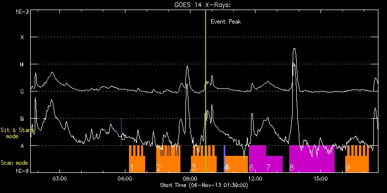 EIS Observation timeline overlay to GOES-Xray curve Code 1" 2" 40" 266" EIS Observations list for this event: STUDY ACRONYM ID DATE OBSERVED DESCRIPTION NOAA# TARGET 0 regcal076 | 37265 | 2013/11/06 05:49:12 | Flatfield, 1 exposure, led 100ms, ccd | | Engineering TIMELINE ID DATE OBSERVED FITS FILE XCEN (+W/-E) YCEN (+N/-S) DUR ----------------------------------------------------------------------------------------------------------------- 37265 | 2013/11/06 05:49:12.000 | eis_l0_20131106_054912.fits.gz | 780.03 | -317.47 | 1s 1 HH_Flare+AR_180x152 | 37254 | 2013/11/06 06:12:20 | AR11884 obs | 1884 | Flare TIMELINE ID DATE OBSERVED FITS FILE XCEN (+W/-E) YCEN (+N/-S) DUR ----------------------------------------------------------------------------------------------------------------- 37254 | 2013/11/06 06:12:20.000 | eis_l0_20131106_061220.fits.gz | 770.38 | -247.39 | 5m18s 37254 | 2013/11/06 06:17:41.000 | eis_l0_20131106_061741.fits.gz | 770.69 | -247.24 | 5m17s 37254 | 2013/11/06 06:23:01.000 | eis_l0_20131106_062301.fits.gz | 771.08 | -247.16 | 5m18s 37254 | 2013/11/06 06:28:22.000 | eis_l0_20131106_062822.fits.gz | 771.62 | -247.24 | 5m18s 37254 | 2013/11/06 06:33:43.000 | eis_l0_20131106_063343.fits.gz | 772.08 | -247.16 | 5m17s 37254 | 2013/11/06 06:39:03.000 | eis_l0_20131106_063903.fits.gz | 772.47 | -247.08 | 5m18s 37254 | 2013/11/06 06:44:24.000 | eis_l0_20131106_064424.fits.gz | 773.01 | -247.08 | 5m18s 37254 | 2013/11/06 06:49:45.000 | eis_l0_20131106_064945.fits.gz | 773.47 | -247.00 | 5m18s 2 Cam_flare_diag | 37246 | 2013/11/06 07:26:43 | AR11884 obs | | Flare TIMELINE ID DATE OBSERVED FITS FILE XCEN (+W/-E) YCEN (+N/-S) DUR ----------------------------------------------------------------------------------------------------------------- 37246 | 2013/11/06 07:26:43.000 | eis_l0_20131106_072643.fits.gz | 777.89 | -246.62 | 2m12s 37246 | 2013/11/06 07:28:58.000 | eis_l0_20131106_072858.fits.gz | 778.12 | -246.70 | 2m12s 37246 | 2013/11/06 07:31:13.000 | eis_l0_20131106_073113.fits.gz | 778.35 | -246.62 | 2m11s 37246 | 2013/11/06 07:33:27.000 | eis_l0_20131106_073327.fits.gz | 778.43 | -246.46 | 2m12s 37246 | 2013/11/06 07:35:42.000 | eis_l0_20131106_073542.fits.gz | 778.66 | -246.62 | 2m11s 37246 | 2013/11/06 07:37:56.000 | eis_l0_20131106_073756.fits.gz | 778.97 | -246.54 | 2m12s 37246 | 2013/11/06 07:40:10.000 | eis_l0_20131106_074010.fits.gz | 779.04 | -246.54 | 2m12s 37246 | 2013/11/06 07:42:25.000 | eis_l0_20131106_074225.fits.gz | 779.20 | -246.46 | 2m12s 37246 | 2013/11/06 07:44:40.000 | eis_l0_20131106_074440.fits.gz | 779.51 | -246.54 | 2m11s 37246 | 2013/11/06 07:46:54.000 | eis_l0_20131106_074654.fits.gz | 779.74 | -246.54 | 2m12s 37246 | 2013/11/06 07:49:09.000 | eis_l0_20131106_074909.fits.gz | 779.89 | -246.54 | 2m12s 37246 | 2013/11/06 07:51:24.000 | eis_l0_20131106_075124.fits.gz | 779.97 | -246.46 | 2m12s 37246 | 2013/11/06 07:53:39.000 | eis_l0_20131106_075339.fits.gz | 780.13 | -246.46 | 2m11s 37246 | 2013/11/06 07:55:53.000 | eis_l0_20131106_075553.fits.gz | 780.36 | -246.39 | 2m12s 37246 | 2013/11/06 07:58:08.000 | eis_l0_20131106_075808.fits.gz | 780.59 | -246.39 | 2m11s 37246 | 2013/11/06 08:00:22.000 | eis_l0_20131106_080022.fits.gz | 780.82 | -246.39 | 2m12s 37246 | 2013/11/06 08:02:36.000 | eis_l0_20131106_080236.fits.gz | 781.05 | -246.39 | 2m12s 37246 | 2013/11/06 08:04:51.000 | eis_l0_20131106_080451.fits.gz | 781.21 | -246.31 | 2m12s 37246 | 2013/11/06 08:07:06.000 | eis_l0_20131106_080706.fits.gz | 781.36 | -246.31 | 2m11s 37246 | 2013/11/06 08:09:20.000 | eis_l0_20131106_080920.fits.gz | 781.52 | -246.39 | 2m12s 37246 | 2013/11/06 08:11:35.000 | eis_l0_20131106_081135.fits.gz | 781.75 | -246.39 | 2m12s 37246 | 2013/11/06 08:13:50.000 | eis_l0_20131106_081350.fits.gz | 781.98 | -246.31 | 2m11s 37246 | 2013/11/06 08:16:04.000 | eis_l0_20131106_081604.fits.gz | 782.06 | -246.15 | 2m12s 37246 | 2013/11/06 08:18:19.000 | eis_l0_20131106_081819.fits.gz | 782.29 | -246.15 | 2m12s 37246 | 2013/11/06 08:20:34.000 | eis_l0_20131106_082034.fits.gz | 782.52 | -246.23 | 2m11s 37246 | 2013/11/06 08:22:48.000 | eis_l0_20131106_082248.fits.gz | 782.75 | -246.23 | 2m12s 37246 | 2013/11/06 08:25:03.000 | eis_l0_20131106_082503.fits.gz | 782.91 | -246.08 | 2m11s 37246 | 2013/11/06 08:27:17.000 | eis_l0_20131106_082717.fits.gz | 783.06 | -246.08 | 2m12s 37246 | 2013/11/06 08:29:31.000 | eis_l0_20131106_082931.fits.gz | 783.29 | -246.08 | 2m12s 3 HH_Flare+AR_180x152 | 37253 | 2013/11/06 09:02:43 | AR11884 obs | 1884 | Flare TIMELINE ID DATE OBSERVED FITS FILE XCEN (+W/-E) YCEN (+N/-S) DUR ----------------------------------------------------------------------------------------------------------------- 37253 | 2013/11/06 09:02:43.000 | eis_l0_20131106_090243.fits.gz | 784.83 | -245.69 | 5m18s 37253 | 2013/11/06 09:08:03.000 | eis_l0_20131106_090803.fits.gz | 785.29 | -245.61 | 5m18s 37253 | 2013/11/06 09:13:23.000 | eis_l0_20131106_091323.fits.gz | 785.75 | -245.69 | 5m18s 37253 | 2013/11/06 09:18:44.000 | eis_l0_20131106_091844.fits.gz | 786.14 | -245.61 | 5m18s 37253 | 2013/11/06 09:24:04.000 | eis_l0_20131106_092404.fits.gz | 786.68 | -245.61 | 5m18s 37253 | 2013/11/06 09:29:25.000 | eis_l0_20131106_092925.fits.gz | 787.07 | -245.54 | 5m18s 37253 | 2013/11/06 09:34:46.000 | eis_l0_20131106_093446.fits.gz | 787.53 | -245.46 | 5m18s 37253 | 2013/11/06 09:40:07.000 | eis_l0_20131106_094007.fits.gz | 787.92 | -245.61 | 5m17s 37253 | 2013/11/06 09:45:27.000 | eis_l0_20131106_094527.fits.gz | 788.38 | -245.46 | 5m19s 37253 | 2013/11/06 09:50:48.000 | eis_l0_20131106_095048.fits.gz | 788.84 | -245.46 | 5m18s 37253 | 2013/11/06 09:56:09.000 | eis_l0_20131106_095609.fits.gz | 789.31 | -245.30 | 5m18s 37253 | 2013/11/06 10:01:30.000 | eis_l0_20131106_100130.fits.gz | 789.77 | -245.30 | 5m18s 37253 | 2013/11/06 10:06:51.000 | eis_l0_20131106_100651.fits.gz | 790.16 | -245.15 | 5m18s 4 PRY_slot_context_v3 | 37228 | 2013/11/06 10:33:21 | EIS spectral Atlas synoptic (QS) | | Act