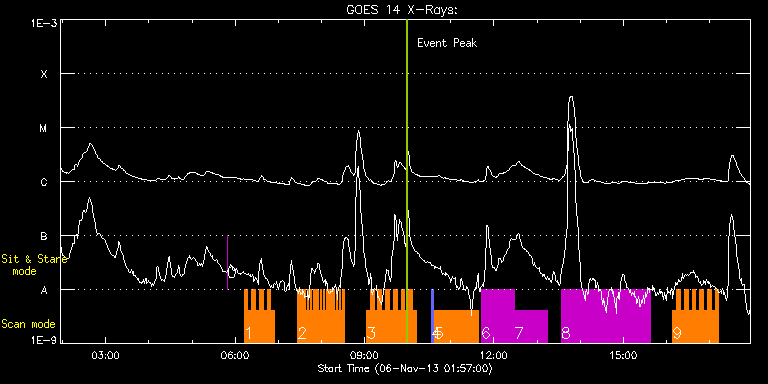 EIS Observation timeline overlay to GOES-Xray curve Code 1" 2" 40" 266" EIS Observations list for this event: STUDY ACRONYM ID DATE OBSERVED DESCRIPTION NOAA# TARGET 0 regcal076 | 37265 | 2013/11/06 05:49:12 | Flatfield, 1 exposure, led 100ms, ccd | | Engineering TIMELINE ID DATE OBSERVED FITS FILE XCEN (+W/-E) YCEN (+N/-S) DUR ----------------------------------------------------------------------------------------------------------------- 37265 | 2013/11/06 05:49:12.000 | eis_l0_20131106_054912.fits.gz | 780.03 | -317.47 | 1s 1 HH_Flare+AR_180x152 | 37254 | 2013/11/06 06:12:20 | AR11884 obs | 1884 | Flare TIMELINE ID DATE OBSERVED FITS FILE XCEN (+W/-E) YCEN (+N/-S) DUR ----------------------------------------------------------------------------------------------------------------- 37254 | 2013/11/06 06:12:20.000 | eis_l0_20131106_061220.fits.gz | 770.38 | -247.39 | 5m18s 37254 | 2013/11/06 06:17:41.000 | eis_l0_20131106_061741.fits.gz | 770.69 | -247.24 | 5m17s 37254 | 2013/11/06 06:23:01.000 | eis_l0_20131106_062301.fits.gz | 771.08 | -247.16 | 5m18s 37254 | 2013/11/06 06:28:22.000 | eis_l0_20131106_062822.fits.gz | 771.62 | -247.24 | 5m18s 37254 | 2013/11/06 06:33:43.000 | eis_l0_20131106_063343.fits.gz | 772.08 | -247.16 | 5m17s 37254 | 2013/11/06 06:39:03.000 | eis_l0_20131106_063903.fits.gz | 772.47 | -247.08 | 5m18s 37254 | 2013/11/06 06:44:24.000 | eis_l0_20131106_064424.fits.gz | 773.01 | -247.08 | 5m18s 37254 | 2013/11/06 06:49:45.000 | eis_l0_20131106_064945.fits.gz | 773.47 | -247.00 | 5m18s 2 Cam_flare_diag | 37246 | 2013/11/06 07:26:43 | AR11884 obs | | Flare TIMELINE ID DATE OBSERVED FITS FILE XCEN (+W/-E) YCEN (+N/-S) DUR ----------------------------------------------------------------------------------------------------------------- 37246 | 2013/11/06 07:26:43.000 | eis_l0_20131106_072643.fits.gz | 777.89 | -246.62 | 2m12s 37246 | 2013/11/06 07:28:58.000 | eis_l0_20131106_072858.fits.gz | 778.12 | -246.70 | 2m12s 37246 | 2013/11/06 07:31:13.000 | eis_l0_20131106_073113.fits.gz | 778.35 | -246.62 | 2m11s 37246 | 2013/11/06 07:33:27.000 | eis_l0_20131106_073327.fits.gz | 778.43 | -246.46 | 2m12s 37246 | 2013/11/06 07:35:42.000 | eis_l0_20131106_073542.fits.gz | 778.66 | -246.62 | 2m11s 37246 | 2013/11/06 07:37:56.000 | eis_l0_20131106_073756.fits.gz | 778.97 | -246.54 | 2m12s 37246 | 2013/11/06 07:40:10.000 | eis_l0_20131106_074010.fits.gz | 779.04 | -246.54 | 2m12s 37246 | 2013/11/06 07:42:25.000 | eis_l0_20131106_074225.fits.gz | 779.20 | -246.46 | 2m12s 37246 | 2013/11/06 07:44:40.000 | eis_l0_20131106_074440.fits.gz | 779.51 | -246.54 | 2m11s 37246 | 2013/11/06 07:46:54.000 | eis_l0_20131106_074654.fits.gz | 779.74 | -246.54 | 2m12s 37246 | 2013/11/06 07:49:09.000 | eis_l0_20131106_074909.fits.gz | 779.89 | -246.54 | 2m12s 37246 | 2013/11/06 07:51:24.000 | eis_l0_20131106_075124.fits.gz | 779.97 | -246.46 | 2m12s 37246 | 2013/11/06 07:53:39.000 | eis_l0_20131106_075339.fits.gz | 780.13 | -246.46 | 2m11s 37246 | 2013/11/06 07:55:53.000 | eis_l0_20131106_075553.fits.gz | 780.36 | -246.39 | 2m12s 37246 | 2013/11/06 07:58:08.000 | eis_l0_20131106_075808.fits.gz | 780.59 | -246.39 | 2m11s 37246 | 2013/11/06 08:00:22.000 | eis_l0_20131106_080022.fits.gz | 780.82 | -246.39 | 2m12s 37246 | 2013/11/06 08:02:36.000 | eis_l0_20131106_080236.fits.gz | 781.05 | -246.39 | 2m12s 37246 | 2013/11/06 08:04:51.000 | eis_l0_20131106_080451.fits.gz | 781.21 | -246.31 | 2m12s 37246 | 2013/11/06 08:07:06.000 | eis_l0_20131106_080706.fits.gz | 781.36 | -246.31 | 2m11s 37246 | 2013/11/06 08:09:20.000 | eis_l0_20131106_080920.fits.gz | 781.52 | -246.39 | 2m12s 37246 | 2013/11/06 08:11:35.000 | eis_l0_20131106_081135.fits.gz | 781.75 | -246.39 | 2m12s 37246 | 2013/11/06 08:13:50.000 | eis_l0_20131106_081350.fits.gz | 781.98 | -246.31 | 2m11s 37246 | 2013/11/06 08:16:04.000 | eis_l0_20131106_081604.fits.gz | 782.06 | -246.15 | 2m12s 37246 | 2013/11/06 08:18:19.000 | eis_l0_20131106_081819.fits.gz | 782.29 | -246.15 | 2m12s 37246 | 2013/11/06 08:20:34.000 | eis_l0_20131106_082034.fits.gz | 782.52 | -246.23 | 2m11s 37246 | 2013/11/06 08:22:48.000 | eis_l0_20131106_082248.fits.gz | 782.75 | -246.23 | 2m12s 37246 | 2013/11/06 08:25:03.000 | eis_l0_20131106_082503.fits.gz | 782.91 | -246.08 | 2m11s 37246 | 2013/11/06 08:27:17.000 | eis_l0_20131106_082717.fits.gz | 783.06 | -246.08 | 2m12s 37246 | 2013/11/06 08:29:31.000 | eis_l0_20131106_082931.fits.gz | 783.29 | -246.08 | 2m12s 3 HH_Flare+AR_180x152 | 37253 | 2013/11/06 09:02:43 | AR11884 obs | 1884 | Flare TIMELINE ID DATE OBSERVED FITS FILE XCEN (+W/-E) YCEN (+N/-S) DUR ----------------------------------------------------------------------------------------------------------------- 37253 | 2013/11/06 09:02:43.000 | eis_l0_20131106_090243.fits.gz | 784.83 | -245.69 | 5m18s 37253 | 2013/11/06 09:08:03.000 | eis_l0_20131106_090803.fits.gz | 785.29 | -245.61 | 5m18s 37253 | 2013/11/06 09:13:23.000 | eis_l0_20131106_091323.fits.gz | 785.75 | -245.69 | 5m18s 37253 | 2013/11/06 09:18:44.000 | eis_l0_20131106_091844.fits.gz | 786.14 | -245.61 | 5m18s 37253 | 2013/11/06 09:24:04.000 | eis_l0_20131106_092404.fits.gz | 786.68 | -245.61 | 5m18s 37253 | 2013/11/06 09:29:25.000 | eis_l0_20131106_092925.fits.gz | 787.07 | -245.54 | 5m18s 37253 | 2013/11/06 09:34:46.000 | eis_l0_20131106_093446.fits.gz | 787.53 | -245.46 | 5m18s 37253 | 2013/11/06 09:40:07.000 | eis_l0_20131106_094007.fits.gz | 787.92 | -245.61 | 5m17s 37253 | 2013/11/06 09:45:27.000 | eis_l0_20131106_094527.fits.gz | 788.38 | -245.46 | 5m19s 37253 | 2013/11/06 09:50:48.000 | eis_l0_20131106_095048.fits.gz | 788.84 | -245.46 | 5m18s 37253 | 2013/11/06 09:56:09.000 | eis_l0_20131106_095609.fits.gz | 789.31 | -245.30 | 5m18s 37253 | 2013/11/06 10:01:30.000 | eis_l0_20131106_100130.fits.gz | 789.77 | -245.30 | 5m18s 37253 | 2013/11/06 10:06:51.000 | eis_l0_20131106_100651.fits.gz | 790.16 | -245.15 | 5m18s 4 PRY_slot_context_v3 | 37228 | 2013/11/06 10:33:21 | EIS spectral Atlas synoptic (QS) | | Act