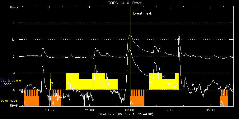 EIS Observation timeline overlay to GOES-Xray curve Code 1" 2" 40" 266" EIS Observations list for this event: STUDY ACRONYM ID DATE OBSERVED DESCRIPTION NOAA# TARGET 0 HH_Flare+AR_180x152 | 37252 | 2013/11/06 16:08:56 | AR11890 obs | | Flare TIMELINE ID DATE OBSERVED FITS FILE XCEN (+W/-E) YCEN (+N/-S) DUR ----------------------------------------------------------------------------------------------------------------- 37252 | 2013/11/06 16:08:56.000 | eis_l0_20131106_160856.fits.gz | -469.91 | -240.82 | 5m19s 37252 | 2013/11/06 16:14:18.000 | eis_l0_20131106_161418.fits.gz | -469.13 | -240.75 | 5m18s 37252 | 2013/11/06 16:19:39.000 | eis_l0_20131106_161939.fits.gz | -468.44 | -240.75 | 5m18s 37252 | 2013/11/06 16:25:00.000 | eis_l0_20131106_162500.fits.gz | -467.74 | -240.82 | 5m18s 37252 | 2013/11/06 16:30:21.000 | eis_l0_20131106_163021.fits.gz | -467.13 | -240.82 | 5m17s 37252 | 2013/11/06 16:35:41.000 | eis_l0_20131106_163541.fits.gz | -466.35 | -240.90 | 5m18s 37252 | 2013/11/06 16:41:02.000 | eis_l0_20131106_164102.fits.gz | -465.66 | -240.90 | 5m18s 37252 | 2013/11/06 16:46:23.000 | eis_l0_20131106_164623.fits.gz | -464.96 | -240.82 | 5m18s 37252 | 2013/11/06 16:51:44.000 | eis_l0_20131106_165144.fits.gz | -464.27 | -240.98 | 5m18s 37252 | 2013/11/06 16:57:05.000 | eis_l0_20131106_165705.fits.gz | -463.57 | -240.90 | 5m17s 37252 | 2013/11/06 17:02:25.000 | eis_l0_20131106_170225.fits.gz | -462.72 | -240.98 | 5m19s 37252 | 2013/11/06 17:07:46.000 | eis_l0_20131106_170746.fits.gz | -462.11 | -240.98 | 5m19s 1 PRY_slot_contextLITE | 37230 | 2013/11/06 17:59:50 | EIS-AIA alignment | | Active Region TIMELINE ID DATE OBSERVED FITS FILE XCEN (+W/-E) YCEN (+N/-S) DUR ----------------------------------------------------------------------------------------------------------------- 37230 | 2013/11/06 17:59:50.000 | eis_l0_20131106_175950.fits.gz | -15.21 | -0.35 | 2m56s 2 Alignment_266 | 37231 | 2013/11/06 18:03:04 | EIS-AIA alignment | | Quiet Sun TIMELINE ID DATE OBSERVED FITS FILE XCEN (+W/-E) YCEN (+N/-S) DUR ----------------------------------------------------------------------------------------------------------------- 37231 | 2013/11/06 18:03:04.000 | eis_l0_20131106_180304.fits.gz | -132.57 | -0.35 | 1m22s 3 XRT_synop_AIA | 37232 | 2013/11/06 18:05:38 | EIS-AIA alignment | | Quiet Sun TIMELINE ID DATE OBSERVED FITS FILE XCEN (+W/-E) YCEN (+N/-S) DUR ----------------------------------------------------------------------------------------------------------------- 37232 | 2013/11/06 18:05:38.000 | eis_l0_20131106_180538.fits.gz | -132.49 | -0.42 | 10s 4 HH_Flare+AR_180x152 | 37249 | 2013/11/06 18:09:50 | AR11890 obs | | Flare TIMELINE ID DATE OBSERVED FITS FILE XCEN (+W/-E) YCEN (+N/-S) DUR ----------------------------------------------------------------------------------------------------------------- 37249 | 2013/11/06 18:09:50.000 | eis_l0_20131106_180950.fits.gz | -453.84 | -241.37 | 5m17s 37249 | 2013/11/06 18:15:10.000 | eis_l0_20131106_181510.fits.gz | -453.07 | -241.21 | 5m18s 37249 | 2013/11/06 18:20:31.000 | eis_l0_20131106_182031.fits.gz | -452.45 | -241.13 | 5m18s 37249 | 2013/11/06 18:25:52.000 | eis_l0_20131106_182552.fits.gz | -451.68 | -241.37 | 5m18s 37249 | 2013/11/06 18:31:13.000 | eis_l0_20131106_183113.fits.gz | -450.98 | -241.37 | 5m18s 37249 | 2013/11/06 18:36:34.000 | eis_l0_20131106_183634.fits.gz | -450.29 | -241.44 | 5m17s 37249 | 2013/11/06 18:41:54.000 | eis_l0_20131106_184154.fits.gz | -449.51 | -241.21 | 5m19s 37249 | 2013/11/06 18:47:16.000 | eis_l0_20131106_184716.fits.gz | -448.89 | -241.29 | 5m17s 5 Flare266_Hunter01 | 37263 | 2013/11/06 19:17:29 | AR11890 obs (EIS-FT) | 1890 | Flare TIMELINE ID DATE OBSERVED FITS FILE XCEN (+W/-E) YCEN (+N/-S) DUR ----------------------------------------------------------------------------------------------------------------- 37263 | 2013/11/06 19:17:29.000 | eis_l0_20131106_191729.fits.gz | -574.99 | -241.60 | 56m23s 37263 | 2013/11/06 20:14:44.000 | eis_l0_20131106_201444.fits.gz | -567.42 | -241.52 | 56m22s 37263 | 2013/11/06 21:11:59.000 | eis_l0_20131106_211159.fits.gz | -559.62 | -241.91 | 56m22s 37263 | 2013/11/06 22:09:13.000 | eis_l0_20131106_220913.fits.gz | -551.82 | -241.91 | 56m22s 6 HH_Flare+AR_180x152 | 37260 | 2013/11/07 00:00:49 | AR11890 obs | 1890 | Flare TIMELINE ID DATE OBSERVED FITS FILE XCEN (+W/-E) YCEN (+N/-S) DUR ----------------------------------------------------------------------------------------------------------------- 37260 | 2013/11/07 00:00:49.000 | eis_l0_20131107_000049.fits.gz | -406.33 | -242.29 | 5m18s 37260 | 2013/11/07 00:06:10.000 | eis_l0_20131107_000610.fits.gz | -405.56 | -242.52 | 5m17s 37260 | 2013/11/07 00:11:30.000 | eis_l0_20131107_001130.fits.gz | -404.86 | -242.68 | 5m17s 37260 | 2013/11/07 00:16:50.000 | eis_l0_20131107_001650.fits.gz | -404.09 | -242.60 | 5m18s 37260 | 2013/11/07 00:22:11.000 | eis_l0_20131107_002211.fits.gz | -403.40 | -242.52 | 5m18s 37260 | 2013/11/07 00:27:32.000 | eis_l0_20131107_002732.fits.gz | -402.55 | -242.68 | 5m18s 37260 | 2013/11/07 00:32:52.000 | eis_l0_20131107_003252.fits.gz | -401.77 | -242.60 | 5m18s 37260 | 2013/11/07 00:38:13.000 | eis_l0_20131107_003813.fits.gz | -401.16 | -242.60 | 5m18s 37260 | 2013/11/07 00:43:34.000 | eis_l0_20131107_004334.fits.gz | -400.38 | -242.60 | 5m18s 37260 | 2013/11/07 00:48:55.000 | eis_l0_20131107_004855.fits.gz | -399.61 | -242.68 | 5m18s 37260 | 2013/11/07 00:54:15.000 | eis_l0_20131107_005415.fits.gz | -398.84 | -242.68 | 5m18s 37260 | 2013/11/07 00:59:35.000 | eis_l0_20131107_005935.fits.gz | -398.14 | -242.68 | 5m18s 7 Flare266_Hunter01 | 37264 | 2013/11/07 01:27:21 | AR11890 obs (EIS-FT) | | Flare TIMELINE ID DATE OBSERVED FITS FILE XCEN (+W/-E) YCEN (+N/-S) DUR ----------------------------------------------------------------------------------------------------------------- 37264 | 2013/11/07 01:27:21.000 | eis_l0_20131107_012721.fits.gz | -524.70 | -242.76 | 56m23s 37264 | 2013/11/07 02:2