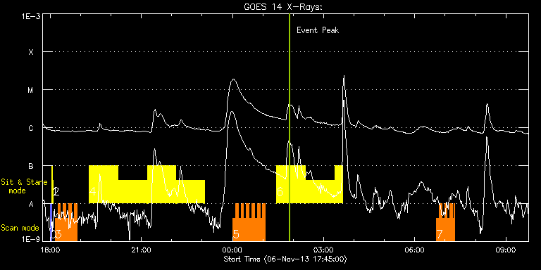 EIS Observation timeline overlay to GOES-Xray curve Code 1" 2" 40" 266" EIS Observations list for this event: STUDY ACRONYM ID DATE OBSERVED DESCRIPTION NOAA# TARGET 0 PRY_slot_contextLITE | 37230 | 2013/11/06 17:59:50 | EIS-AIA alignment | | Active Region TIMELINE ID DATE OBSERVED FITS FILE XCEN (+W/-E) YCEN (+N/-S) DUR ----------------------------------------------------------------------------------------------------------------- 37230 | 2013/11/06 17:59:50.000 | eis_l0_20131106_175950.fits.gz | -15.21 | -0.35 | 2m56s 1 Alignment_266 | 37231 | 2013/11/06 18:03:04 | EIS-AIA alignment | | Quiet Sun TIMELINE ID DATE OBSERVED FITS FILE XCEN (+W/-E) YCEN (+N/-S) DUR ----------------------------------------------------------------------------------------------------------------- 37231 | 2013/11/06 18:03:04.000 | eis_l0_20131106_180304.fits.gz | -132.57 | -0.35 | 1m22s 2 XRT_synop_AIA | 37232 | 2013/11/06 18:05:38 | EIS-AIA alignment | | Quiet Sun TIMELINE ID DATE OBSERVED FITS FILE XCEN (+W/-E) YCEN (+N/-S) DUR ----------------------------------------------------------------------------------------------------------------- 37232 | 2013/11/06 18:05:38.000 | eis_l0_20131106_180538.fits.gz | -132.49 | -0.42 | 10s 3 HH_Flare+AR_180x152 | 37249 | 2013/11/06 18:09:50 | AR11890 obs | | Flare TIMELINE ID DATE OBSERVED FITS FILE XCEN (+W/-E) YCEN (+N/-S) DUR ----------------------------------------------------------------------------------------------------------------- 37249 | 2013/11/06 18:09:50.000 | eis_l0_20131106_180950.fits.gz | -453.84 | -241.37 | 5m17s 37249 | 2013/11/06 18:15:10.000 | eis_l0_20131106_181510.fits.gz | -453.07 | -241.21 | 5m18s 37249 | 2013/11/06 18:20:31.000 | eis_l0_20131106_182031.fits.gz | -452.45 | -241.13 | 5m18s 37249 | 2013/11/06 18:25:52.000 | eis_l0_20131106_182552.fits.gz | -451.68 | -241.37 | 5m18s 37249 | 2013/11/06 18:31:13.000 | eis_l0_20131106_183113.fits.gz | -450.98 | -241.37 | 5m18s 37249 | 2013/11/06 18:36:34.000 | eis_l0_20131106_183634.fits.gz | -450.29 | -241.44 | 5m17s 37249 | 2013/11/06 18:41:54.000 | eis_l0_20131106_184154.fits.gz | -449.51 | -241.21 | 5m19s 37249 | 2013/11/06 18:47:16.000 | eis_l0_20131106_184716.fits.gz | -448.89 | -241.29 | 5m17s 4 Flare266_Hunter01 | 37263 | 2013/11/06 19:17:29 | AR11890 obs (EIS-FT) | 1890 | Flare TIMELINE ID DATE OBSERVED FITS FILE XCEN (+W/-E) YCEN (+N/-S) DUR ----------------------------------------------------------------------------------------------------------------- 37263 | 2013/11/06 19:17:29.000 | eis_l0_20131106_191729.fits.gz | -574.99 | -241.60 | 56m23s 37263 | 2013/11/06 20:14:44.000 | eis_l0_20131106_201444.fits.gz | -567.42 | -241.52 | 56m22s 37263 | 2013/11/06 21:11:59.000 | eis_l0_20131106_211159.fits.gz | -559.62 | -241.91 | 56m22s 37263 | 2013/11/06 22:09:13.000 | eis_l0_20131106_220913.fits.gz | -551.82 | -241.91 | 56m22s 5 HH_Flare+AR_180x152 | 37260 | 2013/11/07 00:00:49 | AR11890 obs | 1890 | Flare TIMELINE ID DATE OBSERVED FITS FILE XCEN (+W/-E) YCEN (+N/-S) DUR ----------------------------------------------------------------------------------------------------------------- 37260 | 2013/11/07 00:00:49.000 | eis_l0_20131107_000049.fits.gz | -406.33 | -242.29 | 5m18s 37260 | 2013/11/07 00:06:10.000 | eis_l0_20131107_000610.fits.gz | -405.56 | -242.52 | 5m17s 37260 | 2013/11/07 00:11:30.000 | eis_l0_20131107_001130.fits.gz | -404.86 | -242.68 | 5m17s 37260 | 2013/11/07 00:16:50.000 | eis_l0_20131107_001650.fits.gz | -404.09 | -242.60 | 5m18s 37260 | 2013/11/07 00:22:11.000 | eis_l0_20131107_002211.fits.gz | -403.40 | -242.52 | 5m18s 37260 | 2013/11/07 00:27:32.000 | eis_l0_20131107_002732.fits.gz | -402.55 | -242.68 | 5m18s 37260 | 2013/11/07 00:32:52.000 | eis_l0_20131107_003252.fits.gz | -401.77 | -242.60 | 5m18s 37260 | 2013/11/07 00:38:13.000 | eis_l0_20131107_003813.fits.gz | -401.16 | -242.60 | 5m18s 37260 | 2013/11/07 00:43:34.000 | eis_l0_20131107_004334.fits.gz | -400.38 | -242.60 | 5m18s 37260 | 2013/11/07 00:48:55.000 | eis_l0_20131107_004855.fits.gz | -399.61 | -242.68 | 5m18s 37260 | 2013/11/07 00:54:15.000 | eis_l0_20131107_005415.fits.gz | -398.84 | -242.68 | 5m18s 37260 | 2013/11/07 00:59:35.000 | eis_l0_20131107_005935.fits.gz | -398.14 | -242.68 | 5m18s 6 Flare266_Hunter01 | 37264 | 2013/11/07 01:27:21 | AR11890 obs (EIS-FT) | | Flare TIMELINE ID DATE OBSERVED FITS FILE XCEN (+W/-E) YCEN (+N/-S) DUR ----------------------------------------------------------------------------------------------------------------- 37264 | 2013/11/07 01:27:21.000 | eis_l0_20131107_012721.fits.gz | -524.70 | -242.76 | 56m23s 37264 | 2013/11/07 02:24:36.000 | eis_l0_20131107_022436.fits.gz | -516.59 | -243.07 | 56m22s 37264 | 2013/11/07 03:21:50.000 | eis_l0_20131107_032150.fits.gz | -508.56 | -243.07 | 16m18s 7 HH_Flare+AR_180x152 | 37251 | 2013/11/07 06:42:43 | AR11890 obs | 1890 | Flare TIMELINE ID DATE OBSERVED FITS FILE XCEN (+W/-E) YCEN (+N/-S) DUR ----------------------------------------------------------------------------------------------------------------- 37251 | 2013/11/07 06:42:43.000 | eis_l0_20131107_064243.fits.gz | -350.25 | -243.84 | 5m18s 37251 | 2013/11/07 06:48:04.000 | eis_l0_20131107_064804.fits.gz | -349.40 | -243.76 | 5m17s 37251 | 2013/11/07 06:53:24.000 | eis_l0_20131107_065324.fits.gz | -348.70 | -243.76 | 5m18s 37251 | 2013/11/07 06:58:45.000 | eis_l0_20131107_065845.fits.gz | -347.86 | -243.91 | 5m18s 37251 | 2013/11/07 07:04:06.000 | eis_l0_20131107_070406.fits.gz | -347.24 | -243.76 | 5m17s 37251 | 2013/11/07 07:09:26.000 | eis_l0_20131107_070926.fits.gz | -346.39 | -243.76 | 5m18s 37251 | 2013/11/07 07:14:47.000 | eis_l0_20131107_071447.fits.gz | -345.61 | -243.76 | 3m52s 37251 | 2013/11/07 07:17:26.000 | eis_l0_20131107_071726.fits.gz | -345.31 | -243.84 | 1m13s : Check study information : Download file : View thumbnails For this event, also check for: