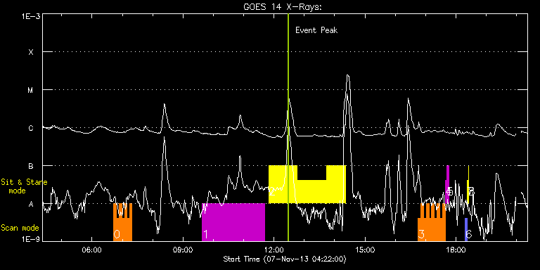 EIS Observation timeline overlay to GOES-Xray curve Code 1" 2" 40" 266" EIS Observations list for this event: STUDY ACRONYM ID DATE OBSERVED DESCRIPTION NOAA# TARGET 0 HH_Flare+AR_180x152 | 37251 | 2013/11/07 06:42:43 | AR11890 obs | 1890 | Flare TIMELINE ID DATE OBSERVED FITS FILE XCEN (+W/-E) YCEN (+N/-S) DUR ----------------------------------------------------------------------------------------------------------------- 37251 | 2013/11/07 06:42:43.000 | eis_l0_20131107_064243.fits.gz | -350.25 | -243.84 | 5m18s 37251 | 2013/11/07 06:48:04.000 | eis_l0_20131107_064804.fits.gz | -349.40 | -243.76 | 5m17s 37251 | 2013/11/07 06:53:24.000 | eis_l0_20131107_065324.fits.gz | -348.70 | -243.76 | 5m18s 37251 | 2013/11/07 06:58:45.000 | eis_l0_20131107_065845.fits.gz | -347.86 | -243.91 | 5m18s 37251 | 2013/11/07 07:04:06.000 | eis_l0_20131107_070406.fits.gz | -347.24 | -243.76 | 5m17s 37251 | 2013/11/07 07:09:26.000 | eis_l0_20131107_070926.fits.gz | -346.39 | -243.76 | 5m18s 37251 | 2013/11/07 07:14:47.000 | eis_l0_20131107_071447.fits.gz | -345.61 | -243.76 | 3m52s 37251 | 2013/11/07 07:17:26.000 | eis_l0_20131107_071726.fits.gz | -345.31 | -243.84 | 1m13s 1 HPW021_VEL_240x512v1 | 37266 | 2013/11/07 09:38:27 | AR 11890 obs, velocity field | 1890 | Active Region TIMELINE ID DATE OBSERVED FITS FILE XCEN (+W/-E) YCEN (+N/-S) DUR ----------------------------------------------------------------------------------------------------------------- 37266 | 2013/11/07 09:38:27.000 | eis_l0_20131107_093827.fits.gz | -342.41 | -250.32 | 2h3m47s 2 Flare266_Hunter01 | 37267 | 2013/11/07 11:49:29 | AR 11890 obs (EIS-FT) | 1890 | Flare TIMELINE ID DATE OBSERVED FITS FILE XCEN (+W/-E) YCEN (+N/-S) DUR ----------------------------------------------------------------------------------------------------------------- 37267 | 2013/11/07 11:49:29.000 | eis_l0_20131107_114929.fits.gz | -456.04 | -251.79 | 56m22s 37267 | 2013/11/07 12:46:44.000 | eis_l0_20131107_124644.fits.gz | -447.93 | -251.86 | 56m22s 37267 | 2013/11/07 13:43:58.000 | eis_l0_20131107_134358.fits.gz | -439.67 | -252.02 | 38m15s 3 HH_Flare+AR_180x152 | 37268 | 2013/11/07 16:45:14 | AR 11890 obs | 1890 | Flare TIMELINE ID DATE OBSERVED FITS FILE XCEN (+W/-E) YCEN (+N/-S) DUR ----------------------------------------------------------------------------------------------------------------- 37268 | 2013/11/07 16:45:14.000 | eis_l0_20131107_164514.fits.gz | -283.46 | -252.33 | 5m18s 37268 | 2013/11/07 16:50:35.000 | eis_l0_20131107_165035.fits.gz | -282.69 | -252.25 | 5m18s 37268 | 2013/11/07 16:55:55.000 | eis_l0_20131107_165555.fits.gz | -281.84 | -252.56 | 5m19s 37268 | 2013/11/07 17:01:17.000 | eis_l0_20131107_170117.fits.gz | -281.14 | -252.33 | 5m17s 37268 | 2013/11/07 17:06:37.000 | eis_l0_20131107_170637.fits.gz | -280.37 | -252.48 | 5m18s 37268 | 2013/11/07 17:11:58.000 | eis_l0_20131107_171158.fits.gz | -279.52 | -252.48 | 5m18s 37268 | 2013/11/07 17:17:19.000 | eis_l0_20131107_171719.fits.gz | -278.67 | -252.48 | 5m17s 37268 | 2013/11/07 17:22:39.000 | eis_l0_20131107_172239.fits.gz | -277.90 | -252.56 | 5m19s 37268 | 2013/11/07 17:28:00.000 | eis_l0_20131107_172800.fits.gz | -277.20 | -252.40 | 5m18s 37268 | 2013/11/07 17:33:21.000 | eis_l0_20131107_173321.fits.gz | -276.35 | -252.56 | 5m18s 4 regcal071 | 37281 | 2013/11/07 17:38:42 | Dark exposures, CCD bottom rows (100s | | Engineering TIMELINE ID DATE OBSERVED FITS FILE XCEN (+W/-E) YCEN (+N/-S) DUR ----------------------------------------------------------------------------------------------------------------- 37281 | 2013/11/07 17:38:42.000 | eis_l0_20131107_173842.fits.gz | -262.34 | -575.56 | 3m22s 5 regcal072 | 37282 | 2013/11/07 17:42:31 | Dark exposures, top CCD rows (100s exp | | Engineering TIMELINE ID DATE OBSERVED FITS FILE XCEN (+W/-E) YCEN (+N/-S) DUR ----------------------------------------------------------------------------------------------------------------- 37282 | 2013/11/07 17:42:31.000 | eis_l0_20131107_174231.fits.gz | -261.73 | -64.48 | 3m21s 6 PRY_slot_contextLITE | 37269 | 2013/11/07 18:18:50 | EIS-AIA alignment | | Active Region TIMELINE ID DATE OBSERVED FITS FILE XCEN (+W/-E) YCEN (+N/-S) DUR ----------------------------------------------------------------------------------------------------------------- 37269 | 2013/11/07 18:18:50.000 | eis_l0_20131107_181850.fits.gz | -15.21 | -0.58 | 2m56s 7 Alignment_266 | 37270 | 2013/11/07 18:22:05 | EIS-AIA alignment | | Quiet Sun TIMELINE ID DATE OBSERVED FITS FILE XCEN (+W/-E) YCEN (+N/-S) DUR ----------------------------------------------------------------------------------------------------------------- 37270 | 2013/11/07 18:22:05.000 | eis_l0_20131107_182205.fits.gz | -132.64 | -0.42 | 1m22s 8 XRT_synop_AIA | 37271 | 2013/11/07 18:24:39 | EIS-AIA alignment | | Quiet Sun TIMELINE ID DATE OBSERVED FITS FILE XCEN (+W/-E) YCEN (+N/-S) DUR ----------------------------------------------------------------------------------------------------------------- 37271 | 2013/11/07 18:24:39.000 | eis_l0_20131107_182439.fits.gz | -132.49 | -0.50 | 10s : Check study information : Download file : View thumbnails For this event, also check for: