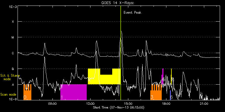 EIS Observation timeline overlay to GOES-Xray curve Code 1" 2" 40" 266" EIS Observations list for this event: STUDY ACRONYM ID DATE OBSERVED DESCRIPTION NOAA# TARGET 0 HH_Flare+AR_180x152 | 37251 | 2013/11/07 06:42:43 | AR11890 obs | 1890 | Flare TIMELINE ID DATE OBSERVED FITS FILE XCEN (+W/-E) YCEN (+N/-S) DUR ----------------------------------------------------------------------------------------------------------------- 37251 | 2013/11/07 06:42:43.000 | eis_l0_20131107_064243.fits.gz | -350.25 | -243.84 | 5m18s 37251 | 2013/11/07 06:48:04.000 | eis_l0_20131107_064804.fits.gz | -349.40 | -243.76 | 5m17s 37251 | 2013/11/07 06:53:24.000 | eis_l0_20131107_065324.fits.gz | -348.70 | -243.76 | 5m18s 37251 | 2013/11/07 06:58:45.000 | eis_l0_20131107_065845.fits.gz | -347.86 | -243.91 | 5m18s 37251 | 2013/11/07 07:04:06.000 | eis_l0_20131107_070406.fits.gz | -347.24 | -243.76 | 5m17s 37251 | 2013/11/07 07:09:26.000 | eis_l0_20131107_070926.fits.gz | -346.39 | -243.76 | 5m18s 37251 | 2013/11/07 07:14:47.000 | eis_l0_20131107_071447.fits.gz | -345.61 | -243.76 | 3m52s 37251 | 2013/11/07 07:17:26.000 | eis_l0_20131107_071726.fits.gz | -345.31 | -243.84 | 1m13s 1 HPW021_VEL_240x512v1 | 37266 | 2013/11/07 09:38:27 | AR 11890 obs, velocity field | 1890 | Active Region TIMELINE ID DATE OBSERVED FITS FILE XCEN (+W/-E) YCEN (+N/-S) DUR ----------------------------------------------------------------------------------------------------------------- 37266 | 2013/11/07 09:38:27.000 | eis_l0_20131107_093827.fits.gz | -342.41 | -250.32 | 2h3m47s 2 Flare266_Hunter01 | 37267 | 2013/11/07 11:49:29 | AR 11890 obs (EIS-FT) | 1890 | Flare TIMELINE ID DATE OBSERVED FITS FILE XCEN (+W/-E) YCEN (+N/-S) DUR ----------------------------------------------------------------------------------------------------------------- 37267 | 2013/11/07 11:49:29.000 | eis_l0_20131107_114929.fits.gz | -456.04 | -251.79 | 56m22s 37267 | 2013/11/07 12:46:44.000 | eis_l0_20131107_124644.fits.gz | -447.93 | -251.86 | 56m22s 37267 | 2013/11/07 13:43:58.000 | eis_l0_20131107_134358.fits.gz | -439.67 | -252.02 | 38m15s 3 HH_Flare+AR_180x152 | 37268 | 2013/11/07 16:45:14 | AR 11890 obs | 1890 | Flare TIMELINE ID DATE OBSERVED FITS FILE XCEN (+W/-E) YCEN (+N/-S) DUR ----------------------------------------------------------------------------------------------------------------- 37268 | 2013/11/07 16:45:14.000 | eis_l0_20131107_164514.fits.gz | -283.46 | -252.33 | 5m18s 37268 | 2013/11/07 16:50:35.000 | eis_l0_20131107_165035.fits.gz | -282.69 | -252.25 | 5m18s 37268 | 2013/11/07 16:55:55.000 | eis_l0_20131107_165555.fits.gz | -281.84 | -252.56 | 5m19s 37268 | 2013/11/07 17:01:17.000 | eis_l0_20131107_170117.fits.gz | -281.14 | -252.33 | 5m17s 37268 | 2013/11/07 17:06:37.000 | eis_l0_20131107_170637.fits.gz | -280.37 | -252.48 | 5m18s 37268 | 2013/11/07 17:11:58.000 | eis_l0_20131107_171158.fits.gz | -279.52 | -252.48 | 5m18s 37268 | 2013/11/07 17:17:19.000 | eis_l0_20131107_171719.fits.gz | -278.67 | -252.48 | 5m17s 37268 | 2013/11/07 17:22:39.000 | eis_l0_20131107_172239.fits.gz | -277.90 | -252.56 | 5m19s 37268 | 2013/11/07 17:28:00.000 | eis_l0_20131107_172800.fits.gz | -277.20 | -252.40 | 5m18s 37268 | 2013/11/07 17:33:21.000 | eis_l0_20131107_173321.fits.gz | -276.35 | -252.56 | 5m18s 4 regcal071 | 37281 | 2013/11/07 17:38:42 | Dark exposures, CCD bottom rows (100s | | Engineering TIMELINE ID DATE OBSERVED FITS FILE XCEN (+W/-E) YCEN (+N/-S) DUR ----------------------------------------------------------------------------------------------------------------- 37281 | 2013/11/07 17:38:42.000 | eis_l0_20131107_173842.fits.gz | -262.34 | -575.56 | 3m22s 5 regcal072 | 37282 | 2013/11/07 17:42:31 | Dark exposures, top CCD rows (100s exp | | Engineering TIMELINE ID DATE OBSERVED FITS FILE XCEN (+W/-E) YCEN (+N/-S) DUR ----------------------------------------------------------------------------------------------------------------- 37282 | 2013/11/07 17:42:31.000 | eis_l0_20131107_174231.fits.gz | -261.73 | -64.48 | 3m21s 6 PRY_slot_contextLITE | 37269 | 2013/11/07 18:18:50 | EIS-AIA alignment | | Active Region TIMELINE ID DATE OBSERVED FITS FILE XCEN (+W/-E) YCEN (+N/-S) DUR ----------------------------------------------------------------------------------------------------------------- 37269 | 2013/11/07 18:18:50.000 | eis_l0_20131107_181850.fits.gz | -15.21 | -0.58 | 2m56s 7 Alignment_266 | 37270 | 2013/11/07 18:22:05 | EIS-AIA alignment | | Quiet Sun TIMELINE ID DATE OBSERVED FITS FILE XCEN (+W/-E) YCEN (+N/-S) DUR ----------------------------------------------------------------------------------------------------------------- 37270 | 2013/11/07 18:22:05.000 | eis_l0_20131107_182205.fits.gz | -132.64 | -0.42 | 1m22s 8 XRT_synop_AIA | 37271 | 2013/11/07 18:24:39 | EIS-AIA alignment | | Quiet Sun TIMELINE ID DATE OBSERVED FITS FILE XCEN (+W/-E) YCEN (+N/-S) DUR ----------------------------------------------------------------------------------------------------------------- 37271 | 2013/11/07 18:24:39.000 | eis_l0_20131107_182439.fits.gz | -132.49 | -0.50 | 10s : Check study information : Download file : View thumbnails For this event, also check for: