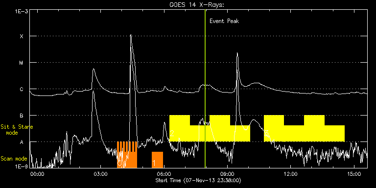 EIS Observation timeline overlay to GOES-Xray curve Code 1" 2" 40" 266" EIS Observations list for this event: STUDY ACRONYM ID DATE OBSERVED DESCRIPTION NOAA# TARGET 0 HH_Flare_162x152 | 37285 | 2013/11/08 03:47:20 | AR 11890 obs | 1890 | Flare TIMELINE ID DATE OBSERVED FITS FILE XCEN (+W/-E) YCEN (+N/-S) DUR ----------------------------------------------------------------------------------------------------------------- 37285 | 2013/11/08 03:47:20.000 | eis_l0_20131108_034720.fits.gz | -184.24 | -252.18 | 4m10s 37285 | 2013/11/08 03:51:33.000 | eis_l0_20131108_035133.fits.gz | -183.70 | -252.18 | 4m10s 37285 | 2013/11/08 03:55:46.000 | eis_l0_20131108_035546.fits.gz | -183.09 | -252.25 | 4m11s 37285 | 2013/11/08 04:00:00.000 | eis_l0_20131108_040000.fits.gz | -182.47 | -252.25 | 4m10s 37285 | 2013/11/08 04:04:13.000 | eis_l0_20131108_040413.fits.gz | -181.85 | -252.49 | 4m11s 37285 | 2013/11/08 04:08:27.000 | eis_l0_20131108_040827.fits.gz | -181.23 | -252.33 | 4m10s 37285 | 2013/11/08 04:12:40.000 | eis_l0_20131108_041240.fits.gz | -180.54 | -252.25 | 4m10s 37285 | 2013/11/08 04:16:53.000 | eis_l0_20131108_041653.fits.gz | -179.84 | -252.41 | 4m11s 37285 | 2013/11/08 04:21:07.000 | eis_l0_20131108_042107.fits.gz | -179.30 | -252.33 | 4m10s 37285 | 2013/11/08 04:25:20.000 | eis_l0_20131108_042520.fits.gz | -178.68 | -252.49 | 4m11s 37285 | 2013/11/08 04:29:34.000 | eis_l0_20131108_042934.fits.gz | -178.07 | -252.33 | 4m10s 37285 | 2013/11/08 04:33:47.000 | eis_l0_20131108_043347.fits.gz | -177.37 | -252.41 | 4m11s 37285 | 2013/11/08 04:38:00.000 | eis_l0_20131108_043800.fits.gz | -176.75 | -252.25 | 4m11s 1 Atlas_30 | 37286 | 2013/11/08 05:25:10 | AR 11890 obs | 1890 | Quiet Sun TIMELINE ID DATE OBSERVED FITS FILE XCEN (+W/-E) YCEN (+N/-S) DUR ----------------------------------------------------------------------------------------------------------------- 37286 | 2013/11/08 05:25:10.000 | eis_l0_20131108_052510.fits.gz | -169.15 | -253.18 | 31m39s 2 Flare266_Hunter01 | 37295 | 2013/11/08 06:16:00 | AR 11890 obs (EIS-FT) | 1890 | Flare TIMELINE ID DATE OBSERVED FITS FILE XCEN (+W/-E) YCEN (+N/-S) DUR ----------------------------------------------------------------------------------------------------------------- 37295 | 2013/11/08 06:16:00.000 | eis_l0_20131108_061600.fits.gz | -293.67 | -253.33 | 56m23s 37295 | 2013/11/08 07:13:15.000 | eis_l0_20131108_071315.fits.gz | -285.02 | -253.49 | 56m22s 37295 | 2013/11/08 08:10:29.000 | eis_l0_20131108_081029.fits.gz | -276.44 | -253.41 | 56m23s 37295 | 2013/11/08 09:07:44.000 | eis_l0_20131108_090744.fits.gz | -267.87 | -253.49 | 56m22s 3 Flare266_Hunter01 | 37296 | 2013/11/08 10:44:21 | AR 11890 obs (EIS-FT) | 1890 | Flare TIMELINE ID DATE OBSERVED FITS FILE XCEN (+W/-E) YCEN (+N/-S) DUR ----------------------------------------------------------------------------------------------------------------- 37296 | 2013/11/08 10:44:21.000 | eis_l0_20131108_104421.fits.gz | -253.27 | -253.41 | 56m22s 37296 | 2013/11/08 11:41:35.000 | eis_l0_20131108_114135.fits.gz | -244.62 | -253.41 | 56m23s 37296 | 2013/11/08 12:38:50.000 | eis_l0_20131108_123850.fits.gz | -235.89 | -253.41 | 56m22s 37296 | 2013/11/08 13:36:04.000 | eis_l0_20131108_133604.fits.gz | -227.24 | -253.49 | 56m23s : Check study information : Download file : View thumbnails For this event, also check for: