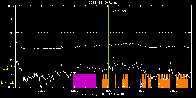 EIS Observation timeline overlay to GOES-Xray curve Code 1" 2" 40" 266" EIS Observations list for this event: STUDY ACRONYM ID DATE OBSERVED DESCRIPTION NOAA# TARGET 0 HPW021_VEL_240x512v1 | 37300 | 2013/11/09 11:55:27 | AR 11890 obs | 1890 | Active Region TIMELINE ID DATE OBSERVED FITS FILE XCEN (+W/-E) YCEN (+N/-S) DUR ----------------------------------------------------------------------------------------------------------------- 37300 | 2013/11/09 11:55:27.000 | eis_l0_20131109_115527.fits.gz | 64.81 | -281.06 | 2h3m47s 1 HH_Flare_162x152 | 37335 | 2013/11/09 14:32:27 | AR11890 obs | 1890 | Flare TIMELINE ID DATE OBSERVED FITS FILE XCEN (+W/-E) YCEN (+N/-S) DUR ----------------------------------------------------------------------------------------------------------------- 37335 | 2013/11/09 14:32:27.000 | eis_l0_20131109_143227.fits.gz | 87.94 | -280.91 | 4m11s 37335 | 2013/11/09 14:36:41.000 | eis_l0_20131109_143641.fits.gz | 88.48 | -280.75 | 4m10s 37335 | 2013/11/09 14:40:54.000 | eis_l0_20131109_144054.fits.gz | 89.10 | -280.83 | 4m11s 37335 | 2013/11/09 14:45:08.000 | eis_l0_20131109_144508.fits.gz | 89.72 | -280.68 | 4m10s 37335 | 2013/11/09 14:49:21.000 | eis_l0_20131109_144921.fits.gz | 90.49 | -280.91 | 4m10s 37335 | 2013/11/09 14:53:34.000 | eis_l0_20131109_145334.fits.gz | 91.03 | -280.75 | 4m11s 37335 | 2013/11/09 14:57:48.000 | eis_l0_20131109_145748.fits.gz | 91.72 | -280.75 | 2m46s 37335 | 2013/11/09 15:43:09.000 | eis_l0_20131109_154309.fits.gz | 98.60 | -280.75 | 1m4s 2 HH_Flare_162x152 | 37336 | 2013/11/09 16:21:11 | AR11890 obs | 1890 | Flare TIMELINE ID DATE OBSERVED FITS FILE XCEN (+W/-E) YCEN (+N/-S) DUR ----------------------------------------------------------------------------------------------------------------- 37336 | 2013/11/09 16:21:11.000 | eis_l0_20131109_162111.fits.gz | 104.32 | -280.60 | 4m10s 37336 | 2013/11/09 16:25:24.000 | eis_l0_20131109_162524.fits.gz | 105.01 | -280.45 | 4m11s 37336 | 2013/11/09 16:29:37.000 | eis_l0_20131109_162937.fits.gz | 105.55 | -280.52 | 4m11s 37336 | 2013/11/09 16:33:51.000 | eis_l0_20131109_163351.fits.gz | 106.17 | -280.60 | 4m10s 37336 | 2013/11/09 16:38:04.000 | eis_l0_20131109_163804.fits.gz | 106.79 | -280.60 | 4m10s 37336 | 2013/11/09 16:42:17.000 | eis_l0_20131109_164217.fits.gz | 107.48 | -280.45 | 4m11s 37336 | 2013/11/09 16:46:31.000 | eis_l0_20131109_164631.fits.gz | 108.18 | -280.52 | 4m6s 37336 | 2013/11/09 16:49:19.000 | eis_l0_20131109_164919.fits.gz | 108.56 | -280.60 | 1m18s 3 PRY_slot_contextLITE | 37301 | 2013/11/09 17:57:51 | EIS-AIA alignment | 1890 | Active Region TIMELINE ID DATE OBSERVED FITS FILE XCEN (+W/-E) YCEN (+N/-S) DUR ----------------------------------------------------------------------------------------------------------------- 37301 | 2013/11/09 17:57:51.000 | eis_l0_20131109_175751.fits.gz | -15.29 | -0.50 | 2m57s 4 Alignment_266 | 37302 | 2013/11/09 18:01:06 | EIS-AIA alignment | | Quiet Sun TIMELINE ID DATE OBSERVED FITS FILE XCEN (+W/-E) YCEN (+N/-S) DUR ----------------------------------------------------------------------------------------------------------------- 37302 | 2013/11/09 18:01:06.000 | eis_l0_20131109_180106.fits.gz | -132.49 | -0.42 | 1m22s 5 XRT_synop_AIA | 37303 | 2013/11/09 18:03:40 | EIS-AIA alignment | | Quiet Sun TIMELINE ID DATE OBSERVED FITS FILE XCEN (+W/-E) YCEN (+N/-S) DUR ----------------------------------------------------------------------------------------------------------------- 37303 | 2013/11/09 18:03:40.000 | eis_l0_20131109_180340.fits.gz | -132.57 | -0.58 | 10s 6 HH_Flare_162x152 | 37337 | 2013/11/09 18:07:51 | AR11890 obs | | Flare TIMELINE ID DATE OBSERVED FITS FILE XCEN (+W/-E) YCEN (+N/-S) DUR ----------------------------------------------------------------------------------------------------------------- 37337 | 2013/11/09 18:07:51.000 | eis_l0_20131109_180751.fits.gz | 120.54 | -280.37 | 4m11s 37337 | 2013/11/09 18:12:04.000 | eis_l0_20131109_181204.fits.gz | 121.08 | -280.29 | 4m11s 37337 | 2013/11/09 18:16:18.000 | eis_l0_20131109_181618.fits.gz | 121.70 | -280.29 | 4m10s 37337 | 2013/11/09 18:20:31.000 | eis_l0_20131109_182031.fits.gz | 122.32 | -280.37 | 4m11s 37337 | 2013/11/09 18:24:45.000 | eis_l0_20131109_182445.fits.gz | 122.93 | -280.21 | 2m42s 37337 | 2013/11/09 18:39:50.000 | eis_l0_20131109_183950.fits.gz | 125.17 | -280.14 | 1m46s 37337 | 2013/11/09 18:41:39.000 | eis_l0_20131109_184139.fits.gz | 125.56 | -280.29 | 4m10s 37337 | 2013/11/09 18:45:52.000 | eis_l0_20131109_184552.fits.gz | 126.10 | -280.21 | 4m11s 37337 | 2013/11/09 18:50:06.000 | eis_l0_20131109_185006.fits.gz | 126.79 | -280.29 | 4m10s 37337 | 2013/11/09 18:54:19.000 | eis_l0_20131109_185419.fits.gz | 127.34 | -280.06 | 4m11s 7 HH_Flare_162x152 | 37338 | 2013/11/09 19:34:41 | AR11890 obs | | Flare TIMELINE ID DATE OBSERVED FITS FILE XCEN (+W/-E) YCEN (+N/-S) DUR ----------------------------------------------------------------------------------------------------------------- 37338 | 2013/11/09 19:34:41.000 | eis_l0_20131109_193441.fits.gz | 133.51 | -280.14 | 4m10s 37338 | 2013/11/09 19:38:54.000 | eis_l0_20131109_193854.fits.gz | 134.06 | -280.21 | 4m11s 37338 | 2013/11/09 19:43:08.000 | eis_l0_20131109_194308.fits.gz | 134.67 | -280.14 | 4m10s 37338 | 2013/11/09 19:47:21.000 | eis_l0_20131109_194721.fits.gz | 135.37 | -280.06 | 4m11s 37338 | 2013/11/09 19:51:34.000 | eis_l0_20131109_195134.fits.gz | 135.99 | -280.14 | 4m11s 37338 | 2013/11/09 19:55:48.000 | eis_l0_20131109_195548.fits.gz | 136.60 | -279.90 | 4m10s 37338 | 2013/11/09 20:00:01.000 | eis_l0_20131109_200001.fits.gz | 137.15 | -279.90 | 4m11s 37338 | 2013/11/09 20:04:15.000 | eis_l0_20131109_200415.fits.gz | 137.92 | -280.14 | 4m10s 37338 | 2013/11/09 20:08:28.000 | eis_l0_20131109_200828.fits.gz | 138.54 | -280.06 | 4m10s 37338 | 2013/11/09 20:12:41.000 | eis_l0_20131109_201241.fits.gz | 139.15 | -279.90 | 4m11s 37338 | 2013/11/09 20:16:55.000 | eis_l0_20131109_201655.fits.gz | 139.77 | -279