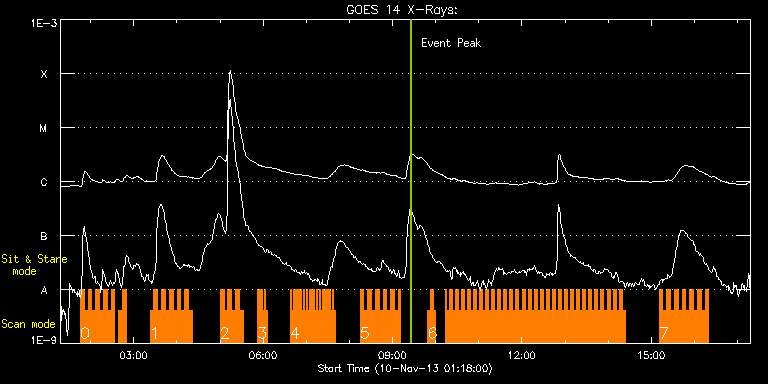 EIS Observation timeline overlay to GOES-Xray curve Code 1" 2" 40" 266" EIS Observations list for this event: STUDY ACRONYM ID DATE OBSERVED DESCRIPTION NOAA# TARGET 0 HH_Flare+AR_180x152 | 37319 | 2013/11/10 01:45:43 | AR11890 obs | 1890 | Flare TIMELINE ID DATE OBSERVED FITS FILE XCEN (+W/-E) YCEN (+N/-S) DUR ----------------------------------------------------------------------------------------------------------------- 37319 | 2013/11/10 01:45:43.000 | eis_l0_20131110_014543.fits.gz | 187.73 | -279.05 | 5m19s 37319 | 2013/11/10 01:51:04.000 | eis_l0_20131110_015104.fits.gz | 188.50 | -279.05 | 5m19s 37319 | 2013/11/10 01:56:26.000 | eis_l0_20131110_015626.fits.gz | 189.28 | -279.13 | 5m18s 37319 | 2013/11/10 02:01:47.000 | eis_l0_20131110_020147.fits.gz | 190.05 | -279.05 | 5m18s 37319 | 2013/11/10 02:07:08.000 | eis_l0_20131110_020708.fits.gz | 190.90 | -278.98 | 5m18s 37319 | 2013/11/10 02:12:29.000 | eis_l0_20131110_021229.fits.gz | 191.75 | -279.05 | 5m18s 37319 | 2013/11/10 02:17:50.000 | eis_l0_20131110_021750.fits.gz | 192.44 | -278.98 | 5m17s 37319 | 2013/11/10 02:23:10.000 | eis_l0_20131110_022310.fits.gz | 193.29 | -278.98 | 5m19s 37319 | 2013/11/10 02:28:32.000 | eis_l0_20131110_022832.fits.gz | 194.07 | -278.90 | 5m17s 37319 | 2013/11/10 02:39:13.000 | eis_l0_20131110_023913.fits.gz | 195.61 | -278.90 | 5m18s 37319 | 2013/11/10 02:44:34.000 | eis_l0_20131110_024434.fits.gz | 196.46 | -279.05 | 5m18s 1 HH_Flare+AR_180x152 | 37320 | 2013/11/10 03:22:43 | AR11890 obs | 1890 | Flare TIMELINE ID DATE OBSERVED FITS FILE XCEN (+W/-E) YCEN (+N/-S) DUR ----------------------------------------------------------------------------------------------------------------- 37320 | 2013/11/10 03:22:43.000 | eis_l0_20131110_032243.fits.gz | 202.10 | -278.51 | 5m18s 37320 | 2013/11/10 03:28:04.000 | eis_l0_20131110_032804.fits.gz | 202.95 | -278.59 | 5m17s 37320 | 2013/11/10 03:33:24.000 | eis_l0_20131110_033324.fits.gz | 203.72 | -278.75 | 5m18s 37320 | 2013/11/10 03:38:45.000 | eis_l0_20131110_033845.fits.gz | 204.57 | -278.75 | 5m19s 37320 | 2013/11/10 03:44:07.000 | eis_l0_20131110_034407.fits.gz | 205.34 | -278.75 | 5m18s 37320 | 2013/11/10 03:49:28.000 | eis_l0_20131110_034928.fits.gz | 206.12 | -278.67 | 5m17s 37320 | 2013/11/10 03:54:48.000 | eis_l0_20131110_035448.fits.gz | 206.89 | -278.67 | 5m18s 37320 | 2013/11/10 04:00:09.000 | eis_l0_20131110_040009.fits.gz | 207.66 | -278.67 | 5m18s 37320 | 2013/11/10 04:05:30.000 | eis_l0_20131110_040530.fits.gz | 208.51 | -278.67 | 5m19s 37320 | 2013/11/10 04:10:51.000 | eis_l0_20131110_041051.fits.gz | 209.28 | -278.51 | 5m18s 37320 | 2013/11/10 04:16:12.000 | eis_l0_20131110_041612.fits.gz | 210.06 | -278.67 | 5m18s 2 HH_Flare+AR_180x152 | 37321 | 2013/11/10 05:00:13 | AR11890 obs | 1890 | Flare TIMELINE ID DATE OBSERVED FITS FILE XCEN (+W/-E) YCEN (+N/-S) DUR ----------------------------------------------------------------------------------------------------------------- 37321 | 2013/11/10 05:00:13.000 | eis_l0_20131110_050013.fits.gz | 216.54 | -278.51 | 5m19s 37321 | 2013/11/10 05:05:35.000 | eis_l0_20131110_050535.fits.gz | 217.32 | -278.44 | 5m18s 37321 | 2013/11/10 05:10:56.000 | eis_l0_20131110_051056.fits.gz | 218.17 | -278.44 | 5m17s 37321 | 2013/11/10 05:16:16.000 | eis_l0_20131110_051616.fits.gz | 218.94 | -278.28 | 5m18s 37321 | 2013/11/10 05:21:37.000 | eis_l0_20131110_052137.fits.gz | 219.63 | -278.36 | 5m18s 37321 | 2013/11/10 05:26:58.000 | eis_l0_20131110_052658.fits.gz | 220.48 | -278.36 | 5m18s 3 Cam_flare_diag | 37348 | 2013/11/10 05:52:14 | AR11890 obs | 1890 | Flare TIMELINE ID DATE OBSERVED FITS FILE XCEN (+W/-E) YCEN (+N/-S) DUR ----------------------------------------------------------------------------------------------------------------- 37348 | 2013/11/10 05:52:14.000 | eis_l0_20131110_055214.fits.gz | 225.60 | -278.28 | 2m12s 37348 | 2013/11/10 05:54:29.000 | eis_l0_20131110_055429.fits.gz | 225.90 | -278.13 | 2m11s 37348 | 2013/11/10 05:56:43.000 | eis_l0_20131110_055643.fits.gz | 226.21 | -278.20 | 2m12s 37348 | 2013/11/10 05:58:58.000 | eis_l0_20131110_055858.fits.gz | 226.44 | -278.20 | 2m12s 37348 | 2013/11/10 06:01:12.000 | eis_l0_20131110_060112.fits.gz | 226.75 | -278.28 | 2m12s 37348 | 2013/11/10 06:03:26.000 | eis_l0_20131110_060326.fits.gz | 227.14 | -278.36 | 2m12s 4 Cam_flare_diag | 37322 | 2013/11/10 06:37:43 | AR11890 obs | 1890 | Flare TIMELINE ID DATE OBSERVED FITS FILE XCEN (+W/-E) YCEN (+N/-S) DUR ----------------------------------------------------------------------------------------------------------------- 37322 | 2013/11/10 06:37:43.000 | eis_l0_20131110_063743.fits.gz | 232.16 | -277.97 | 2m12s 37322 | 2013/11/10 06:39:58.000 | eis_l0_20131110_063958.fits.gz | 232.47 | -277.97 | 2m12s 37322 | 2013/11/10 06:42:12.000 | eis_l0_20131110_064212.fits.gz | 232.86 | -278.05 | 2m12s 37322 | 2013/11/10 06:44:27.000 | eis_l0_20131110_064427.fits.gz | 233.09 | -278.05 | 2m12s 37322 | 2013/11/10 06:46:41.000 | eis_l0_20131110_064641.fits.gz | 233.47 | -278.05 | 2m12s 37322 | 2013/11/10 06:48:56.000 | eis_l0_20131110_064856.fits.gz | 233.86 | -278.13 | 2m12s 37322 | 2013/11/10 06:51:10.000 | eis_l0_20131110_065110.fits.gz | 234.17 | -277.90 | 2m12s 37322 | 2013/11/10 06:53:25.000 | eis_l0_20131110_065325.fits.gz | 234.48 | -277.90 | 2m12s 37322 | 2013/11/10 06:55:39.000 | eis_l0_20131110_065539.fits.gz | 234.86 | -277.97 | 2m12s 37322 | 2013/11/10 06:57:54.000 | eis_l0_20131110_065754.fits.gz | 235.17 | -278.13 | 2m12s 37322 | 2013/11/10 07:00:08.000 | eis_l0_20131110_070008.fits.gz | 235.40 | -278.13 | 2m12s 37322 | 2013/11/10 07:02:23.000 | eis_l0_20131110_070223.fits.gz | 235.79 | -278.05 | 2m12s 37322 | 2013/11/10 07:04:37.000 | eis_l0_20131110_070437.fits.gz | 236.18 | -277.97 | 2m12s 37322 | 2013/11/10 07:06:52.000 | eis_l0_20131110_070652.fits.gz | 236.49 | -277.97 | 2m12s 37322 | 2013/11/10 07:09:06.000 | eis_l0_20131110_070906.fits.gz | 236.80 | -278.05 | 2m12s 37322 | 2013/11/10 07:11:21.000