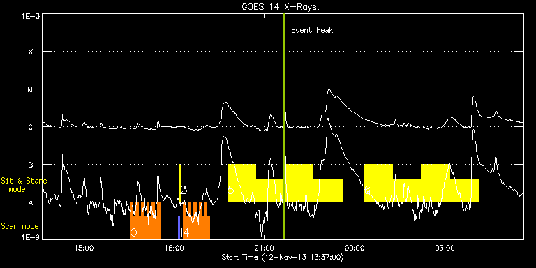 EIS Observation timeline overlay to GOES-Xray curve Code 1" 2" 40" 266" EIS Observations list for this event: STUDY ACRONYM ID DATE OBSERVED DESCRIPTION NOAA# TARGET 0 HH_Flare+AR_180x152 | 37364 | 2013/11/12 16:32:57 | AR11890 obs | 1890 | Flare TIMELINE ID DATE OBSERVED FITS FILE XCEN (+W/-E) YCEN (+N/-S) DUR ----------------------------------------------------------------------------------------------------------------- 37364 | 2013/11/12 16:32:57.000 | eis_l0_20131112_163257.fits.gz | -9871.70 | -9963.20 | 5m18s 37364 | 2013/11/12 16:38:18.000 | eis_l0_20131112_163818.fits.gz | -9871.70 | -9963.20 | 5m17s 37364 | 2013/11/12 16:43:38.000 | eis_l0_20131112_164338.fits.gz | -9871.70 | -9963.20 | 5m18s 37364 | 2013/11/12 16:48:59.000 | eis_l0_20131112_164859.fits.gz | -9871.70 | -9963.20 | 5m18s 37364 | 2013/11/12 16:54:20.000 | eis_l0_20131112_165420.fits.gz | -9871.70 | -9963.20 | 5m18s 37364 | 2013/11/12 16:59:41.000 | eis_l0_20131112_165941.fits.gz | -9871.70 | -9963.20 | 5m18s 37364 | 2013/11/12 17:05:02.000 | eis_l0_20131112_170502.fits.gz | -9871.70 | -9963.20 | 5m18s 37364 | 2013/11/12 17:10:23.000 | eis_l0_20131112_171023.fits.gz | -9871.70 | -9963.20 | 5m18s 37364 | 2013/11/12 17:15:44.000 | eis_l0_20131112_171544.fits.gz | -9871.70 | -9963.20 | 5m17s 37364 | 2013/11/12 17:21:04.000 | eis_l0_20131112_172104.fits.gz | -9871.70 | -9963.20 | 5m18s 37364 | 2013/11/12 17:26:25.000 | eis_l0_20131112_172625.fits.gz | -9871.70 | -9963.20 | 5m18s 1 PRY_slot_contextLITE | 37354 | 2013/11/12 18:07:50 | EIS-AIA alignment | | Active Region TIMELINE ID DATE OBSERVED FITS FILE XCEN (+W/-E) YCEN (+N/-S) DUR ----------------------------------------------------------------------------------------------------------------- 37354 | 2013/11/12 18:07:50.000 | eis_l0_20131112_180750.fits.gz | -9884.69 | -9963.20 | 2m56s 2 Alignment_266 | 37355 | 2013/11/12 18:11:05 | EIS-AIA alignment | | Quiet Sun TIMELINE ID DATE OBSERVED FITS FILE XCEN (+W/-E) YCEN (+N/-S) DUR ----------------------------------------------------------------------------------------------------------------- 37355 | 2013/11/12 18:11:05.000 | eis_l0_20131112_181105.fits.gz | -10002.00 | -9963.20 | 1m22s 3 XRT_synop_AIA | 37356 | 2013/11/12 18:13:12 | EIS-AIA alignment | | Quiet Sun TIMELINE ID DATE OBSERVED FITS FILE XCEN (+W/-E) YCEN (+N/-S) DUR ----------------------------------------------------------------------------------------------------------------- 37356 | 2013/11/12 18:13:12.000 | eis_l0_20131112_181312.fits.gz | -10002.00 | -9963.20 | 10s 4 HH_Flare+AR_180x152 | 37365 | 2013/11/12 18:17:50 | AR11890 obs | 1890 | Flare TIMELINE ID DATE OBSERVED FITS FILE XCEN (+W/-E) YCEN (+N/-S) DUR ----------------------------------------------------------------------------------------------------------------- 37365 | 2013/11/12 18:17:50.000 | eis_l0_20131112_181750.fits.gz | -9871.70 | -9963.20 | 5m18s 37365 | 2013/11/12 18:23:10.000 | eis_l0_20131112_182310.fits.gz | -9871.70 | -9963.20 | 5m19s 37365 | 2013/11/12 18:28:32.000 | eis_l0_20131112_182832.fits.gz | -9871.70 | -9963.20 | 5m17s 37365 | 2013/11/12 18:33:52.000 | eis_l0_20131112_183352.fits.gz | -9871.70 | -9963.20 | 5m18s 37365 | 2013/11/12 18:39:13.000 | eis_l0_20131112_183913.fits.gz | -9871.70 | -9963.20 | 5m18s 37365 | 2013/11/12 18:44:34.000 | eis_l0_20131112_184434.fits.gz | -9871.70 | -9963.20 | 5m18s 37365 | 2013/11/12 18:49:55.000 | eis_l0_20131112_184955.fits.gz | -9871.70 | -9963.20 | 5m18s 37365 | 2013/11/12 18:55:15.000 | eis_l0_20131112_185515.fits.gz | -9871.70 | -9963.20 | 5m18s 37365 | 2013/11/12 19:00:36.000 | eis_l0_20131112_190036.fits.gz | -9871.70 | -9963.20 | 5m18s 37365 | 2013/11/12 19:05:56.000 | eis_l0_20131112_190556.fits.gz | -9871.70 | -9963.20 | 5m18s 5 Flare266_Hunter01 | 37377 | 2013/11/12 19:46:34 | AR 11890 obs (EIS-FT) | 1890 | Flare TIMELINE ID DATE OBSERVED FITS FILE XCEN (+W/-E) YCEN (+N/-S) DUR ----------------------------------------------------------------------------------------------------------------- 37377 | 2013/11/12 19:46:34.000 | eis_l0_20131112_194634.fits.gz | -10002.00 | -9963.20 | 56m22s 37377 | 2013/11/12 20:43:48.000 | eis_l0_20131112_204348.fits.gz | -10002.00 | -9963.20 | 56m22s 37377 | 2013/11/12 21:41:02.000 | eis_l0_20131112_214102.fits.gz | -10002.00 | -9963.20 | 56m23s 37377 | 2013/11/12 22:38:17.000 | eis_l0_20131112_223817.fits.gz | -10002.00 | -9963.20 | 56m22s 6 Flare266_Hunter01 | 37362 | 2013/11/13 00:18:40 | AR 11890 obs (EIS-FT) | | Flare TIMELINE ID DATE OBSERVED FITS FILE XCEN (+W/-E) YCEN (+N/-S) DUR ----------------------------------------------------------------------------------------------------------------- 37362 | 2013/11/13 00:18:40.000 | eis_l0_20131113_001840.fits.gz | -10002.00 | -9963.20 | 56m23s 37362 | 2013/11/13 01:15:55.000 | eis_l0_20131113_011555.fits.gz | -10002.00 | -9963.20 | 56m22s 37362 | 2013/11/13 02:13:09.000 | eis_l0_20131113_021309.fits.gz | -10002.00 | -9963.20 | 56m23s 37362 | 2013/11/13 03:10:24.000 | eis_l0_20131113_031024.fits.gz | -10002.00 | -9963.20 | 56m22s : Check study information : Download file : View thumbnails For this event, also check for: