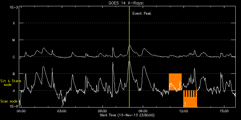 EIS Observation timeline overlay to GOES-Xray curve Code 1" 2" 40" 266" EIS Observations list for this event: STUDY ACRONYM ID DATE OBSERVED DESCRIPTION NOAA# TARGET 0 FLAREDOP_EIS | 37402 | 2013/11/14 10:54:21 | AR11890 obs | | Flare TIMELINE ID DATE OBSERVED FITS FILE XCEN (+W/-E) YCEN (+N/-S) DUR ----------------------------------------------------------------------------------------------------------------- 37402 | 2013/11/14 10:54:21.000 | eis_l0_20131114_105421.fits.gz | -9869.95 | -9963.20 | 55m52s 1 HH_Flare+AR_180x152 | 37403 | 2013/11/14 11:59:41 | AR11890 obs | 1890 | Flare TIMELINE ID DATE OBSERVED FITS FILE XCEN (+W/-E) YCEN (+N/-S) DUR ----------------------------------------------------------------------------------------------------------------- 37403 | 2013/11/14 11:59:41.000 | eis_l0_20131114_115941.fits.gz | -9871.70 | -9963.20 | 5m18s 37403 | 2013/11/14 12:05:01.000 | eis_l0_20131114_120501.fits.gz | -9871.70 | -9963.20 | 5m18s 37403 | 2013/11/14 12:10:22.000 | eis_l0_20131114_121022.fits.gz | -9871.70 | -9963.20 | 5m18s 37403 | 2013/11/14 12:15:43.000 | eis_l0_20131114_121543.fits.gz | -9871.70 | -9963.20 | 5m18s 37403 | 2013/11/14 12:21:04.000 | eis_l0_20131114_122104.fits.gz | -9871.70 | -9963.20 | 5m18s 37403 | 2013/11/14 12:26:25.000 | eis_l0_20131114_122625.fits.gz | -9871.70 | -9963.20 | 5m18s 37403 | 2013/11/14 12:31:46.000 | eis_l0_20131114_123146.fits.gz | -9871.70 | -9963.20 | 5m17s 37403 | 2013/11/14 12:37:06.000 | eis_l0_20131114_123706.fits.gz | -9871.70 | -9963.20 | 5m18s 37403 | 2013/11/14 12:42:27.000 | eis_l0_20131114_124227.fits.gz | -9871.70 | -9963.20 | 5m18s 37403 | 2013/11/14 12:47:48.000 | eis_l0_20131114_124748.fits.gz | -9871.70 | -9963.20 | 5m18s 37403 | 2013/11/14 12:53:09.000 | eis_l0_20131114_125309.fits.gz | -9871.70 | -9963.20 | 5m18s : Check study information : Download file : View thumbnails For this event, also check for: