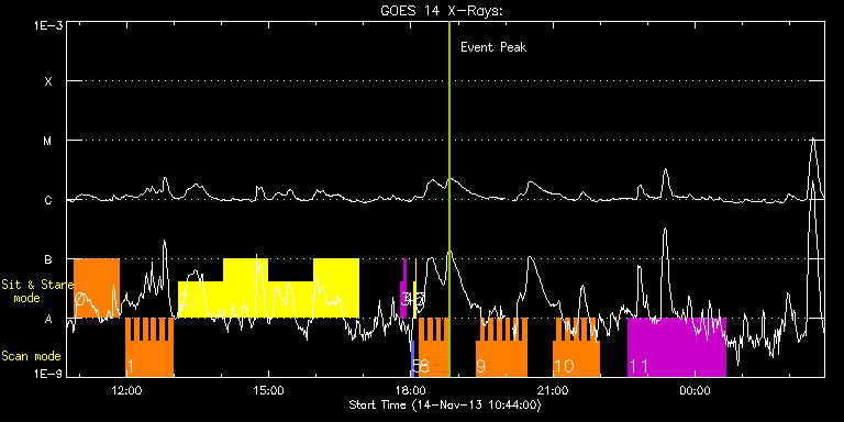 EIS Observation timeline overlay to GOES-Xray curve Code 1" 2" 40" 266" EIS Observations list for this event: STUDY ACRONYM ID DATE OBSERVED DESCRIPTION NOAA# TARGET 0 FLAREDOP_EIS | 37402 | 2013/11/14 10:54:21 | AR11890 obs | | Flare TIMELINE ID DATE OBSERVED FITS FILE XCEN (+W/-E) YCEN (+N/-S) DUR ----------------------------------------------------------------------------------------------------------------- 37402 | 2013/11/14 10:54:21.000 | eis_l0_20131114_105421.fits.gz | -9869.95 | -9963.20 | 55m52s 1 HH_Flare+AR_180x152 | 37403 | 2013/11/14 11:59:41 | AR11890 obs | 1890 | Flare TIMELINE ID DATE OBSERVED FITS FILE XCEN (+W/-E) YCEN (+N/-S) DUR ----------------------------------------------------------------------------------------------------------------- 37403 | 2013/11/14 11:59:41.000 | eis_l0_20131114_115941.fits.gz | -9871.70 | -9963.20 | 5m18s 37403 | 2013/11/14 12:05:01.000 | eis_l0_20131114_120501.fits.gz | -9871.70 | -9963.20 | 5m18s 37403 | 2013/11/14 12:10:22.000 | eis_l0_20131114_121022.fits.gz | -9871.70 | -9963.20 | 5m18s 37403 | 2013/11/14 12:15:43.000 | eis_l0_20131114_121543.fits.gz | -9871.70 | -9963.20 | 5m18s 37403 | 2013/11/14 12:21:04.000 | eis_l0_20131114_122104.fits.gz | -9871.70 | -9963.20 | 5m18s 37403 | 2013/11/14 12:26:25.000 | eis_l0_20131114_122625.fits.gz | -9871.70 | -9963.20 | 5m18s 37403 | 2013/11/14 12:31:46.000 | eis_l0_20131114_123146.fits.gz | -9871.70 | -9963.20 | 5m17s 37403 | 2013/11/14 12:37:06.000 | eis_l0_20131114_123706.fits.gz | -9871.70 | -9963.20 | 5m18s 37403 | 2013/11/14 12:42:27.000 | eis_l0_20131114_124227.fits.gz | -9871.70 | -9963.20 | 5m18s 37403 | 2013/11/14 12:47:48.000 | eis_l0_20131114_124748.fits.gz | -9871.70 | -9963.20 | 5m18s 37403 | 2013/11/14 12:53:09.000 | eis_l0_20131114_125309.fits.gz | -9871.70 | -9963.20 | 5m18s 2 Flare266_Hunter01 | 37400 | 2013/11/14 13:05:34 | AR 11890 obs (EIS-FT) | 1890 | Flare TIMELINE ID DATE OBSERVED FITS FILE XCEN (+W/-E) YCEN (+N/-S) DUR ----------------------------------------------------------------------------------------------------------------- 37400 | 2013/11/14 13:05:34.000 | eis_l0_20131114_130534.fits.gz | -10002.00 | -9963.20 | 56m22s 37400 | 2013/11/14 14:02:48.000 | eis_l0_20131114_140248.fits.gz | -10002.00 | -9963.20 | 56m23s 37400 | 2013/11/14 15:00:03.000 | eis_l0_20131114_150003.fits.gz | -10002.00 | -9963.20 | 56m22s 37400 | 2013/11/14 15:57:17.000 | eis_l0_20131114_155717.fits.gz | -10002.00 | -9963.20 | 56m23s 3 regcal071 | 37386 | 2013/11/14 17:46:42 | Dark exposures, CCD bottom rows (100s | | Engineering TIMELINE ID DATE OBSERVED FITS FILE XCEN (+W/-E) YCEN (+N/-S) DUR ----------------------------------------------------------------------------------------------------------------- 37386 | 2013/11/14 17:46:42.000 | eis_l0_20131114_174642.fits.gz | -9854.89 | -10268.20 | 3m22s 4 regcal072 | 37387 | 2013/11/14 17:50:31 | Dark exposures, top CCD rows (100s exp | | Engineering TIMELINE ID DATE OBSERVED FITS FILE XCEN (+W/-E) YCEN (+N/-S) DUR ----------------------------------------------------------------------------------------------------------------- 37387 | 2013/11/14 17:50:31.000 | eis_l0_20131114_175031.fits.gz | -9854.89 | -9757.20 | 3m22s 5 PRY_slot_contextLITE | 37380 | 2013/11/14 18:00:58 | EIS-AIA alignment | | Active Region TIMELINE ID DATE OBSERVED FITS FILE XCEN (+W/-E) YCEN (+N/-S) DUR ----------------------------------------------------------------------------------------------------------------- 37380 | 2013/11/14 18:00:58.000 | eis_l0_20131114_180058.fits.gz | -9884.69 | -9963.20 | 2m57s 6 Alignment_266 | 37381 | 2013/11/14 18:04:13 | EIS-AIA alignment | 1893 | Quiet Sun TIMELINE ID DATE OBSERVED FITS FILE XCEN (+W/-E) YCEN (+N/-S) DUR ----------------------------------------------------------------------------------------------------------------- 37381 | 2013/11/14 18:04:13.000 | eis_l0_20131114_180413.fits.gz | -10002.00 | -9963.20 | 1m22s 7 XRT_synop_AIA | 37382 | 2013/11/14 18:06:21 | EIS-AIA alignment | 1893 | Quiet Sun TIMELINE ID DATE OBSERVED FITS FILE XCEN (+W/-E) YCEN (+N/-S) DUR ----------------------------------------------------------------------------------------------------------------- 37382 | 2013/11/14 18:06:21.000 | eis_l0_20131114_180621.fits.gz | -10002.00 | -9963.20 | 10s 8 HH_Flare+AR_180x152 | 37404 | 2013/11/14 18:10:51 | AR11890 obs | 1890 | Flare TIMELINE ID DATE OBSERVED FITS FILE XCEN (+W/-E) YCEN (+N/-S) DUR ----------------------------------------------------------------------------------------------------------------- 37404 | 2013/11/14 18:10:51.000 | eis_l0_20131114_181051.fits.gz | -9871.70 | -9963.20 | 5m19s 37404 | 2013/11/14 18:16:12.000 | eis_l0_20131114_181612.fits.gz | -9871.70 | -9963.20 | 5m18s 37404 | 2013/11/14 18:21:33.000 | eis_l0_20131114_182133.fits.gz | -9871.70 | -9963.20 | 5m18s 37404 | 2013/11/14 18:26:54.000 | eis_l0_20131114_182654.fits.gz | -9871.70 | -9963.20 | 5m17s 37404 | 2013/11/14 18:32:14.000 | eis_l0_20131114_183214.fits.gz | -9871.70 | -9963.20 | 5m18s 37404 | 2013/11/14 18:37:35.000 | eis_l0_20131114_183735.fits.gz | -9871.70 | -9963.20 | 5m18s 37404 | 2013/11/14 18:42:56.000 | eis_l0_20131114_184256.fits.gz | -9871.70 | -9963.20 | 5m17s 9 HH_Flare+AR_180x152 | 37405 | 2013/11/14 19:22:41 | AR11890 obs | 1890 | Flare TIMELINE ID DATE OBSERVED FITS FILE XCEN (+W/-E) YCEN (+N/-S) DUR ----------------------------------------------------------------------------------------------------------------- 37405 | 2013/11/14 19:22:41.000 | eis_l0_20131114_192241.fits.gz | -9871.70 | -9963.20 | 5m18s 37405 | 2013/11/14 19:28:02.000 | eis_l0_20131114_192802.fits.gz | -9871.70 | -9963.20 | 5m18s 37405 | 2013/11/14 19:33:23.000 | eis_l0_20131114_193323.fits.gz | -9871.70 | -9963.20 | 5m18s 37405 | 2013/11/14 19:38:43.000 | eis_l0_20131114_193843.fits.gz | -9871.70 | -9963.20 | 5m18s 37405 | 2013/11/14 19:44:04.000 | eis_l0_20131114_194404.fits.gz | -9871.70 | -9963.20 | 5m17s 37405 | 2013/11/14 19:49:24.00