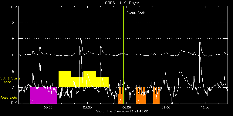 EIS Observation timeline overlay to GOES-Xray curve Code 1" 2" 40" 266" EIS Observations list for this event: STUDY ACRONYM ID DATE OBSERVED DESCRIPTION NOAA# TARGET 0 HPW021_VEL_240x512v1 | 37395 | 2013/11/14 22:35:27 | AR11890 at W-limb obs | 1890 | Active Region TIMELINE ID DATE OBSERVED FITS FILE XCEN (+W/-E) YCEN (+N/-S) DUR ----------------------------------------------------------------------------------------------------------------- 37395 | 2013/11/14 22:35:27.000 | eis_l0_20131114_223527.fits.gz | -9869.71 | -9963.20 | 2h3m48s 1 Flare266_Hunter01 | 37397 | 2013/11/15 00:48:20 | AR 11890 obs (EIS-FT) | | Flare TIMELINE ID DATE OBSERVED FITS FILE XCEN (+W/-E) YCEN (+N/-S) DUR ----------------------------------------------------------------------------------------------------------------- 37397 | 2013/11/15 00:48:20.000 | eis_l0_20131115_004820.fits.gz | 780.42 | -243.44 | 56m22s 37397 | 2013/11/15 01:45:34.000 | eis_l0_20131115_014534.fits.gz | 780.42 | -243.44 | 56m23s 37397 | 2013/11/15 02:42:49.000 | eis_l0_20131115_024249.fits.gz | 780.42 | -243.44 | 56m22s 37397 | 2013/11/15 03:40:03.000 | eis_l0_20131115_034003.fits.gz | 780.27 | -243.44 | 56m23s 2 HH_Flare+AR_180x152 | 37407 | 2013/11/15 05:21:20 | AR11890 at W-limb obs | 1890 | Flare TIMELINE ID DATE OBSERVED FITS FILE XCEN (+W/-E) YCEN (+N/-S) DUR ----------------------------------------------------------------------------------------------------------------- 37407 | 2013/11/15 05:21:20.000 | eis_l0_20131115_052120.fits.gz | 910.69 | -243.37 | 5m18s 37407 | 2013/11/15 05:26:41.000 | eis_l0_20131115_052641.fits.gz | 910.61 | -243.44 | 5m18s 37407 | 2013/11/15 05:32:02.000 | eis_l0_20131115_053202.fits.gz | 910.61 | -243.44 | 5m18s 37407 | 2013/11/15 05:37:23.000 | eis_l0_20131115_053723.fits.gz | 910.69 | -243.44 | 5m17s 37407 | 2013/11/15 05:42:43.000 | eis_l0_20131115_054243.fits.gz | 910.69 | -243.37 | 5m19s 3 HH_Flare+AR_180x152 | 37408 | 2013/11/15 06:44:11 | AR11890 at W-limb obs | 1890 | Flare TIMELINE ID DATE OBSERVED FITS FILE XCEN (+W/-E) YCEN (+N/-S) DUR ----------------------------------------------------------------------------------------------------------------- 37408 | 2013/11/15 06:44:11.000 | eis_l0_20131115_064411.fits.gz | 910.77 | -243.44 | 5m18s 37408 | 2013/11/15 06:49:32.000 | eis_l0_20131115_064932.fits.gz | 910.69 | -243.44 | 5m18s 37408 | 2013/11/15 06:54:53.000 | eis_l0_20131115_065453.fits.gz | 910.69 | -243.44 | 5m17s 37408 | 2013/11/15 07:00:13.000 | eis_l0_20131115_070013.fits.gz | 910.61 | -243.37 | 5m19s 37408 | 2013/11/15 07:05:35.000 | eis_l0_20131115_070535.fits.gz | 910.69 | -243.52 | 5m17s 37408 | 2013/11/15 07:10:55.000 | eis_l0_20131115_071055.fits.gz | 910.69 | -243.44 | 5m17s 37408 | 2013/11/15 07:16:15.000 | eis_l0_20131115_071615.fits.gz | 910.61 | -243.37 | 5m17s 37408 | 2013/11/15 07:21:35.000 | eis_l0_20131115_072135.fits.gz | 910.61 | -243.44 | 5m18s 4 HH_Flare+AR_180x152 | 37409 | 2013/11/15 08:02:43 | AR11890 at W-limb obs | 1890 | Flare TIMELINE ID DATE OBSERVED FITS FILE XCEN (+W/-E) YCEN (+N/-S) DUR ----------------------------------------------------------------------------------------------------------------- 37409 | 2013/11/15 08:02:43.000 | eis_l0_20131115_080243.fits.gz | 910.61 | -243.13 | 5m18s 37409 | 2013/11/15 08:08:04.000 | eis_l0_20131115_080804.fits.gz | 910.69 | -243.52 | 5m18s 37409 | 2013/11/15 08:13:24.000 | eis_l0_20131115_081324.fits.gz | 910.61 | -243.44 | 5m18s 37409 | 2013/11/15 08:18:45.000 | eis_l0_20131115_081845.fits.gz | 910.69 | -243.44 | 5m18s 37409 | 2013/11/15 08:24:06.000 | eis_l0_20131115_082406.fits.gz | 910.54 | -243.44 | 5m17s : Check study information : Download file : View thumbnails For this event, also check for: