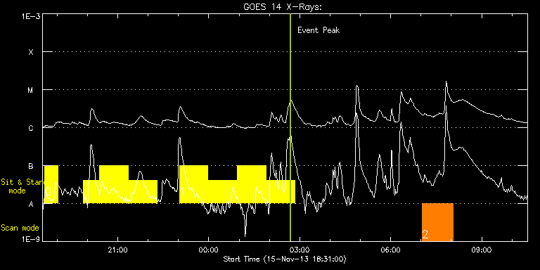 EIS Observation timeline overlay to GOES-Xray curve Code 1" 2" 40" 266" EIS Observations list for this event: STUDY ACRONYM ID DATE OBSERVED DESCRIPTION NOAA# TARGET 0 Flare266_Hunter01 | 37398 | 2013/11/15 18:35:28 | AR 11890 obs (EIS-FT) | 1897 | Flare TIMELINE ID DATE OBSERVED FITS FILE XCEN (+W/-E) YCEN (+N/-S) DUR ----------------------------------------------------------------------------------------------------------------- 37398 | 2013/11/15 18:35:28.000 | eis_l0_20131115_183528.fits.gz | -447.20 | -427.99 | 25m50s 37398 | 2013/11/15 19:51:47.000 | eis_l0_20131115_195147.fits.gz | -437.15 | -428.14 | 31m34s 37398 | 2013/11/15 20:24:13.000 | eis_l0_20131115_202413.fits.gz | -432.90 | -428.07 | 56m23s 37398 | 2013/11/15 21:21:28.000 | eis_l0_20131115_212128.fits.gz | -425.41 | -428.07 | 56m22s 1 Flare266_Hunter01 | 37401 | 2013/11/15 23:02:13 | AR 11890 obs (EIS-FT) | 1897 | Flare TIMELINE ID DATE OBSERVED FITS FILE XCEN (+W/-E) YCEN (+N/-S) DUR ----------------------------------------------------------------------------------------------------------------- 37401 | 2013/11/15 23:02:13.000 | eis_l0_20131115_230213.fits.gz | -411.97 | -428.30 | 56m23s 37401 | 2013/11/15 23:59:28.000 | eis_l0_20131115_235928.fits.gz | -404.24 | -428.53 | 56m22s 37401 | 2013/11/16 00:56:43.000 | eis_l0_20131116_005643.fits.gz | -396.67 | -428.61 | 56m22s 37401 | 2013/11/16 01:53:57.000 | eis_l0_20131116_015357.fits.gz | -388.95 | -428.61 | 56m22s 2 Atlas_60 | 37393 | 2013/11/16 07:01:50 | AR11897 obs - study for Warren and Uga | 1897 | Quiet Sun TIMELINE ID DATE OBSERVED FITS FILE XCEN (+W/-E) YCEN (+N/-S) DUR ----------------------------------------------------------------------------------------------------------------- 37393 | 2013/11/16 07:01:50.000 | eis_l0_20131116_070150.fits.gz | -157.39 | -414.61 | 1h1m39s : Check study information : Download file : View thumbnails For this event, also check for: