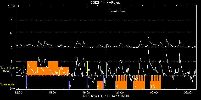 EIS Observation timeline overlay to GOES-Xray curve Code 1" 2" 40" 266" EIS Observations list for this event: STUDY ACRONYM ID DATE OBSERVED DESCRIPTION NOAA# TARGET 0 PRY_slot_context_v3 | 37413 | 2013/11/16 12:40:34 | Flare Observations. NOAA 11897. Contex | 1895 | Active Region TIMELINE ID DATE OBSERVED FITS FILE XCEN (+W/-E) YCEN (+N/-S) DUR ----------------------------------------------------------------------------------------------------------------- 37413 | 2013/11/16 12:40:34.000 | eis_l0_20131116_124034.fits.gz | -148.09 | -328.99 | 2m56s 1 FLAREDOP_EIS | 37414 | 2013/11/16 12:43:55 | Flare Observations. NOAA 11897. Sit-an | | Flare TIMELINE ID DATE OBSERVED FITS FILE XCEN (+W/-E) YCEN (+N/-S) DUR ----------------------------------------------------------------------------------------------------------------- 37414 | 2013/11/16 12:43:55.000 | eis_l0_20131116_124355.fits.gz | -102.69 | -402.84 | 55m52s 37414 | 2013/11/16 13:39:49.000 | eis_l0_20131116_133949.fits.gz | -95.04 | -402.84 | 55m52s 37414 | 2013/11/16 14:35:43.000 | eis_l0_20131116_143543.fits.gz | -87.24 | -402.99 | 55m51s 37414 | 2013/11/16 15:31:36.000 | eis_l0_20131116_153136.fits.gz | -79.51 | -402.92 | 55m53s 2 PRY_slot_context_v3 | 37415 | 2013/11/16 16:27:40 | Flare Observations. NOAA 11897. Contex | 1895 | Active Region TIMELINE ID DATE OBSERVED FITS FILE XCEN (+W/-E) YCEN (+N/-S) DUR ----------------------------------------------------------------------------------------------------------------- 37415 | 2013/11/16 16:27:40.000 | eis_l0_20131116_162740.fits.gz | -116.65 | -328.84 | 2m57s 3 PRY_slot_contextLITE | 37416 | 2013/11/16 18:02:41 | EIS-AIA alignment | 1896 | Active Region TIMELINE ID DATE OBSERVED FITS FILE XCEN (+W/-E) YCEN (+N/-S) DUR ----------------------------------------------------------------------------------------------------------------- 37416 | 2013/11/16 18:02:41.000 | eis_l0_20131116_180241.fits.gz | -15.14 | -0.42 | 2m56s 4 Alignment_266 | 37417 | 2013/11/16 18:05:55 | EIS-AIA alignment | 1896 | Quiet Sun TIMELINE ID DATE OBSERVED FITS FILE XCEN (+W/-E) YCEN (+N/-S) DUR ----------------------------------------------------------------------------------------------------------------- 37417 | 2013/11/16 18:05:55.000 | eis_l0_20131116_180555.fits.gz | -132.57 | -0.35 | 1m22s 5 XRT_synop_AIA | 37418 | 2013/11/16 18:08:30 | EIS-AIA alignment | 1896 | Quiet Sun TIMELINE ID DATE OBSERVED FITS FILE XCEN (+W/-E) YCEN (+N/-S) DUR ----------------------------------------------------------------------------------------------------------------- 37418 | 2013/11/16 18:08:30.000 | eis_l0_20131116_180830.fits.gz | -132.57 | -0.42 | 10s 6 Atlas_30 | 37428 | 2013/11/16 18:58:20 | Active region atlas. NOAA 11897. | | Quiet Sun TIMELINE ID DATE OBSERVED FITS FILE XCEN (+W/-E) YCEN (+N/-S) DUR ----------------------------------------------------------------------------------------------------------------- 37428 | 2013/11/16 18:58:20.000 | eis_l0_20131116_185820.fits.gz | -82.65 | -428.84 | 31m39s 7 PRY_slot_context_v3 | 37429 | 2013/11/16 19:30:10 | Active region context. NOAA 11897. | 1895 | Active Region TIMELINE ID DATE OBSERVED FITS FILE XCEN (+W/-E) YCEN (+N/-S) DUR ----------------------------------------------------------------------------------------------------------------- 37429 | 2013/11/16 19:30:10.000 | eis_l0_20131116_193010.fits.gz | -91.24 | -328.99 | 2m57s 8 HH_Flare_162x152 | 37430 | 2013/11/16 20:35:34 | Flare Observations. NOAA 11897. | | Flare TIMELINE ID DATE OBSERVED FITS FILE XCEN (+W/-E) YCEN (+N/-S) DUR ----------------------------------------------------------------------------------------------------------------- 37430 | 2013/11/16 20:35:34.000 | eis_l0_20131116_203534.fits.gz | -41.92 | -401.76 | 4m10s 37430 | 2013/11/16 20:39:47.000 | eis_l0_20131116_203947.fits.gz | -41.38 | -401.76 | 4m11s 37430 | 2013/11/16 20:44:01.000 | eis_l0_20131116_204401.fits.gz | -40.69 | -401.76 | 4m10s 37430 | 2013/11/16 20:48:14.000 | eis_l0_20131116_204814.fits.gz | -40.15 | -401.92 | 4m11s 37430 | 2013/11/16 20:52:27.000 | eis_l0_20131116_205227.fits.gz | -39.61 | -401.84 | 4m11s 37430 | 2013/11/16 20:56:41.000 | eis_l0_20131116_205641.fits.gz | -39.07 | -401.76 | 4m10s 37430 | 2013/11/16 21:00:54.000 | eis_l0_20131116_210054.fits.gz | -38.45 | -401.68 | 4m11s 37430 | 2013/11/16 21:05:08.000 | eis_l0_20131116_210508.fits.gz | -37.83 | -401.84 | 4m10s 37430 | 2013/11/16 21:09:21.000 | eis_l0_20131116_210921.fits.gz | -37.29 | -401.84 | 4m11s 37430 | 2013/11/16 21:13:35.000 | eis_l0_20131116_211335.fits.gz | -36.59 | -401.84 | 4m10s 37430 | 2013/11/16 21:17:48.000 | eis_l0_20131116_211748.fits.gz | -35.98 | -401.92 | 4m10s 37430 | 2013/11/16 21:22:01.000 | eis_l0_20131116_212201.fits.gz | -35.44 | -401.76 | 4m11s 37430 | 2013/11/16 21:26:15.000 | eis_l0_20131116_212615.fits.gz | -34.89 | -401.76 | 4m10s 37430 | 2013/11/16 21:30:28.000 | eis_l0_20131116_213028.fits.gz | -34.28 | -401.76 | 4m11s 9 HH_Flare_162x152 | 37431 | 2013/11/16 22:11:13 | Flare Observations. NOAA 11897. | | Flare TIMELINE ID DATE OBSERVED FITS FILE XCEN (+W/-E) YCEN (+N/-S) DUR ----------------------------------------------------------------------------------------------------------------- 37431 | 2013/11/16 22:11:13.000 | eis_l0_20131116_221113.fits.gz | -28.64 | -401.76 | 4m11s 37431 | 2013/11/16 22:15:27.000 | eis_l0_20131116_221527.fits.gz | -28.02 | -401.68 | 4m11s 37431 | 2013/11/16 22:19:40.000 | eis_l0_20131116_221940.fits.gz | -27.40 | -401.84 | 4m11s 37431 | 2013/11/16 22:23:54.000 | eis_l0_20131116_222354.fits.gz | -26.86 | -401.68 | 4m10s 37431 | 2013/11/16 22:28:07.000 | eis_l0_20131116_222807.fits.gz | -26.24 | -401.68 | 4m11s 37431 | 2013/11/16 22:32:21.000 | eis_l0_20131116_223221.fits.gz | -25.62 | -401.84 | 4m10s 37431 | 2013/11/16 22:36:34.000 | eis_l0_20131116_223634.fits.gz | -25.01 | -401.68 | 4m11s 37431 | 2013/11/16 22:40:48.000 | eis_l0_20131116_224048.fits.gz | -24.47 | -401.61 | 4m10s 37431 | 2013/1