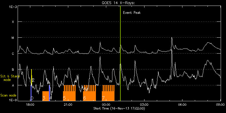 EIS Observation timeline overlay to GOES-Xray curve Code 1" 2" 40" 266" EIS Observations list for this event: STUDY ACRONYM ID DATE OBSERVED DESCRIPTION NOAA# TARGET 0 PRY_slot_contextLITE | 37416 | 2013/11/16 18:02:41 | EIS-AIA alignment | 1896 | Active Region TIMELINE ID DATE OBSERVED FITS FILE XCEN (+W/-E) YCEN (+N/-S) DUR ----------------------------------------------------------------------------------------------------------------- 37416 | 2013/11/16 18:02:41.000 | eis_l0_20131116_180241.fits.gz | -15.14 | -0.42 | 2m56s 1 Alignment_266 | 37417 | 2013/11/16 18:05:55 | EIS-AIA alignment | 1896 | Quiet Sun TIMELINE ID DATE OBSERVED FITS FILE XCEN (+W/-E) YCEN (+N/-S) DUR ----------------------------------------------------------------------------------------------------------------- 37417 | 2013/11/16 18:05:55.000 | eis_l0_20131116_180555.fits.gz | -132.57 | -0.35 | 1m22s 2 XRT_synop_AIA | 37418 | 2013/11/16 18:08:30 | EIS-AIA alignment | 1896 | Quiet Sun TIMELINE ID DATE OBSERVED FITS FILE XCEN (+W/-E) YCEN (+N/-S) DUR ----------------------------------------------------------------------------------------------------------------- 37418 | 2013/11/16 18:08:30.000 | eis_l0_20131116_180830.fits.gz | -132.57 | -0.42 | 10s 3 Atlas_30 | 37428 | 2013/11/16 18:58:20 | Active region atlas. NOAA 11897. | | Quiet Sun TIMELINE ID DATE OBSERVED FITS FILE XCEN (+W/-E) YCEN (+N/-S) DUR ----------------------------------------------------------------------------------------------------------------- 37428 | 2013/11/16 18:58:20.000 | eis_l0_20131116_185820.fits.gz | -82.65 | -428.84 | 31m39s 4 PRY_slot_context_v3 | 37429 | 2013/11/16 19:30:10 | Active region context. NOAA 11897. | 1895 | Active Region TIMELINE ID DATE OBSERVED FITS FILE XCEN (+W/-E) YCEN (+N/-S) DUR ----------------------------------------------------------------------------------------------------------------- 37429 | 2013/11/16 19:30:10.000 | eis_l0_20131116_193010.fits.gz | -91.24 | -328.99 | 2m57s 5 HH_Flare_162x152 | 37430 | 2013/11/16 20:35:34 | Flare Observations. NOAA 11897. | | Flare TIMELINE ID DATE OBSERVED FITS FILE XCEN (+W/-E) YCEN (+N/-S) DUR ----------------------------------------------------------------------------------------------------------------- 37430 | 2013/11/16 20:35:34.000 | eis_l0_20131116_203534.fits.gz | -41.92 | -401.76 | 4m10s 37430 | 2013/11/16 20:39:47.000 | eis_l0_20131116_203947.fits.gz | -41.38 | -401.76 | 4m11s 37430 | 2013/11/16 20:44:01.000 | eis_l0_20131116_204401.fits.gz | -40.69 | -401.76 | 4m10s 37430 | 2013/11/16 20:48:14.000 | eis_l0_20131116_204814.fits.gz | -40.15 | -401.92 | 4m11s 37430 | 2013/11/16 20:52:27.000 | eis_l0_20131116_205227.fits.gz | -39.61 | -401.84 | 4m11s 37430 | 2013/11/16 20:56:41.000 | eis_l0_20131116_205641.fits.gz | -39.07 | -401.76 | 4m10s 37430 | 2013/11/16 21:00:54.000 | eis_l0_20131116_210054.fits.gz | -38.45 | -401.68 | 4m11s 37430 | 2013/11/16 21:05:08.000 | eis_l0_20131116_210508.fits.gz | -37.83 | -401.84 | 4m10s 37430 | 2013/11/16 21:09:21.000 | eis_l0_20131116_210921.fits.gz | -37.29 | -401.84 | 4m11s 37430 | 2013/11/16 21:13:35.000 | eis_l0_20131116_211335.fits.gz | -36.59 | -401.84 | 4m10s 37430 | 2013/11/16 21:17:48.000 | eis_l0_20131116_211748.fits.gz | -35.98 | -401.92 | 4m10s 37430 | 2013/11/16 21:22:01.000 | eis_l0_20131116_212201.fits.gz | -35.44 | -401.76 | 4m11s 37430 | 2013/11/16 21:26:15.000 | eis_l0_20131116_212615.fits.gz | -34.89 | -401.76 | 4m10s 37430 | 2013/11/16 21:30:28.000 | eis_l0_20131116_213028.fits.gz | -34.28 | -401.76 | 4m11s 6 HH_Flare_162x152 | 37431 | 2013/11/16 22:11:13 | Flare Observations. NOAA 11897. | | Flare TIMELINE ID DATE OBSERVED FITS FILE XCEN (+W/-E) YCEN (+N/-S) DUR ----------------------------------------------------------------------------------------------------------------- 37431 | 2013/11/16 22:11:13.000 | eis_l0_20131116_221113.fits.gz | -28.64 | -401.76 | 4m11s 37431 | 2013/11/16 22:15:27.000 | eis_l0_20131116_221527.fits.gz | -28.02 | -401.68 | 4m11s 37431 | 2013/11/16 22:19:40.000 | eis_l0_20131116_221940.fits.gz | -27.40 | -401.84 | 4m11s 37431 | 2013/11/16 22:23:54.000 | eis_l0_20131116_222354.fits.gz | -26.86 | -401.68 | 4m10s 37431 | 2013/11/16 22:28:07.000 | eis_l0_20131116_222807.fits.gz | -26.24 | -401.68 | 4m11s 37431 | 2013/11/16 22:32:21.000 | eis_l0_20131116_223221.fits.gz | -25.62 | -401.84 | 4m10s 37431 | 2013/11/16 22:36:34.000 | eis_l0_20131116_223634.fits.gz | -25.01 | -401.68 | 4m11s 37431 | 2013/11/16 22:40:48.000 | eis_l0_20131116_224048.fits.gz | -24.47 | -401.61 | 4m10s 37431 | 2013/11/16 22:45:01.000 | eis_l0_20131116_224501.fits.gz | -23.85 | -401.84 | 4m11s 37431 | 2013/11/16 22:49:14.000 | eis_l0_20131116_224914.fits.gz | -23.23 | -401.68 | 4m11s 37431 | 2013/11/16 22:53:28.000 | eis_l0_20131116_225328.fits.gz | -22.69 | -401.68 | 4m10s 37431 | 2013/11/16 22:57:41.000 | eis_l0_20131116_225741.fits.gz | -21.99 | -401.92 | 4m11s 37431 | 2013/11/16 23:01:55.000 | eis_l0_20131116_230155.fits.gz | -21.45 | -401.84 | 4m10s 37431 | 2013/11/16 23:06:08.000 | eis_l0_20131116_230608.fits.gz | -20.91 | -401.68 | 4m11s 7 HH_Flare_162x152 | 37432 | 2013/11/16 23:39:13 | Flare Observations. NOAA 11897. | | Flare TIMELINE ID DATE OBSERVED FITS FILE XCEN (+W/-E) YCEN (+N/-S) DUR ----------------------------------------------------------------------------------------------------------------- 37432 | 2013/11/16 23:39:13.000 | eis_l0_20131116_233913.fits.gz | -16.20 | -401.76 | 4m11s 37432 | 2013/11/16 23:43:27.000 | eis_l0_20131116_234327.fits.gz | -15.74 | -401.68 | 4m10s 37432 | 2013/11/16 23:47:40.000 | eis_l0_20131116_234740.fits.gz | -15.04 | -401.76 | 4m11s 37432 | 2013/11/16 23:51:54.000 | eis_l0_20131116_235154.fits.gz | -14.50 | -401.76 | 4m10s 37432 | 2013/11/16 23:56:07.000 | eis_l0_20131116_235607.fits.gz | -13.96 | -401.68 | 4m11s 37432 | 2013/11/17 00:00:20.000 | eis_l0_20131117_000020.fits.gz | -13.34 | -401.61 | 4m11s 37432 | 2013/11/17 00:04:34.000 | eis_l0_20131117_000434.fits.gz