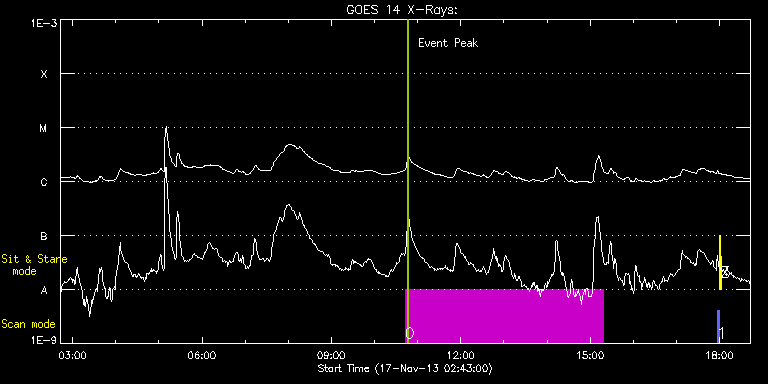 EIS Observation timeline overlay to GOES-Xray curve Code 1" 2" 40" 266" EIS Observations list for this event: STUDY ACRONYM ID DATE OBSERVED DESCRIPTION NOAA# TARGET 0 SK_CH_DIAG_320x384 | 37422 | 2013/11/17 10:42:27 | HOP 81 Polar monitoring. South pole. | | Coronal Hole TIMELINE ID DATE OBSERVED FITS FILE XCEN (+W/-E) YCEN (+N/-S) DUR ----------------------------------------------------------------------------------------------------------------- 37422 | 2013/11/17 10:42:27.000 | eis_l0_20131117_104227.fits.gz | -14.96 | -940.53 | 4h35m37s 1 PRY_slot_contextLITE | 37419 | 2013/11/17 17:56:34 | EIS-AIA alignment | 1896 | Active Region TIMELINE ID DATE OBSERVED FITS FILE XCEN (+W/-E) YCEN (+N/-S) DUR ----------------------------------------------------------------------------------------------------------------- 37419 | 2013/11/17 17:56:34.000 | eis_l0_20131117_175634.fits.gz | -15.21 | -0.27 | 2m56s 2 Alignment_266 | 37420 | 2013/11/17 17:59:48 | EIS-AIA alignment | | Quiet Sun TIMELINE ID DATE OBSERVED FITS FILE XCEN (+W/-E) YCEN (+N/-S) DUR ----------------------------------------------------------------------------------------------------------------- 37420 | 2013/11/17 17:59:48.000 | eis_l0_20131117_175948.fits.gz | -132.57 | -0.42 | 1m22s 3 XRT_synop_AIA | 37421 | 2013/11/17 18:01:56 | EIS-AIA alignment | | Quiet Sun TIMELINE ID DATE OBSERVED FITS FILE XCEN (+W/-E) YCEN (+N/-S) DUR ----------------------------------------------------------------------------------------------------------------- 37421 | 2013/11/17 18:01:56.000 | eis_l0_20131117_180156.fits.gz | -132.64 | -0.50 | 10s : Check study information : Download file : View thumbnails For this event, also check for: