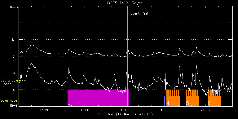 EIS Observation timeline overlay to GOES-Xray curve Code 1" 2" 40" 266" EIS Observations list for this event: STUDY ACRONYM ID DATE OBSERVED DESCRIPTION NOAA# TARGET 0 SK_CH_DIAG_320x384 | 37422 | 2013/11/17 10:42:27 | HOP 81 Polar monitoring. South pole. | | Coronal Hole TIMELINE ID DATE OBSERVED FITS FILE XCEN (+W/-E) YCEN (+N/-S) DUR ----------------------------------------------------------------------------------------------------------------- 37422 | 2013/11/17 10:42:27.000 | eis_l0_20131117_104227.fits.gz | -14.96 | -940.53 | 4h35m37s 1 PRY_slot_contextLITE | 37419 | 2013/11/17 17:56:34 | EIS-AIA alignment | 1896 | Active Region TIMELINE ID DATE OBSERVED FITS FILE XCEN (+W/-E) YCEN (+N/-S) DUR ----------------------------------------------------------------------------------------------------------------- 37419 | 2013/11/17 17:56:34.000 | eis_l0_20131117_175634.fits.gz | -15.21 | -0.27 | 2m56s 2 Alignment_266 | 37420 | 2013/11/17 17:59:48 | EIS-AIA alignment | | Quiet Sun TIMELINE ID DATE OBSERVED FITS FILE XCEN (+W/-E) YCEN (+N/-S) DUR ----------------------------------------------------------------------------------------------------------------- 37420 | 2013/11/17 17:59:48.000 | eis_l0_20131117_175948.fits.gz | -132.57 | -0.42 | 1m22s 3 XRT_synop_AIA | 37421 | 2013/11/17 18:01:56 | EIS-AIA alignment | | Quiet Sun TIMELINE ID DATE OBSERVED FITS FILE XCEN (+W/-E) YCEN (+N/-S) DUR ----------------------------------------------------------------------------------------------------------------- 37421 | 2013/11/17 18:01:56.000 | eis_l0_20131117_180156.fits.gz | -132.64 | -0.50 | 10s 4 HH_Flare_162x152 | 37433 | 2013/11/17 18:06:19 | Flare Observations. NOAA 11897. | 1897 | Flare TIMELINE ID DATE OBSERVED FITS FILE XCEN (+W/-E) YCEN (+N/-S) DUR ----------------------------------------------------------------------------------------------------------------- 37433 | 2013/11/17 18:06:19.000 | eis_l0_20131117_180619.fits.gz | 139.14 | -400.52 | 4m11s 37433 | 2013/11/17 18:10:33.000 | eis_l0_20131117_181033.fits.gz | 139.76 | -400.22 | 4m10s 37433 | 2013/11/17 18:14:46.000 | eis_l0_20131117_181446.fits.gz | 140.30 | -400.29 | 4m11s 37433 | 2013/11/17 18:19:00.000 | eis_l0_20131117_181900.fits.gz | 140.84 | -400.37 | 4m10s 37433 | 2013/11/17 18:23:13.000 | eis_l0_20131117_182313.fits.gz | 141.46 | -400.45 | 4m10s 37433 | 2013/11/17 18:27:26.000 | eis_l0_20131117_182726.fits.gz | 142.08 | -400.29 | 4m11s 37433 | 2013/11/17 18:31:40.000 | eis_l0_20131117_183140.fits.gz | 142.62 | -400.29 | 4m11s 37433 | 2013/11/17 18:35:53.000 | eis_l0_20131117_183553.fits.gz | 143.32 | -400.29 | 4m11s 37433 | 2013/11/17 18:40:07.000 | eis_l0_20131117_184007.fits.gz | 143.86 | -400.29 | 4m10s 37433 | 2013/11/17 18:44:20.000 | eis_l0_20131117_184420.fits.gz | 144.40 | -400.29 | 4m11s 37433 | 2013/11/17 18:48:33.000 | eis_l0_20131117_184833.fits.gz | 145.01 | -400.29 | 4m11s 37433 | 2013/11/17 18:52:47.000 | eis_l0_20131117_185247.fits.gz | 145.63 | -400.14 | 4m11s 37433 | 2013/11/17 18:57:00.000 | eis_l0_20131117_185700.fits.gz | 146.25 | -400.29 | 4m11s 37433 | 2013/11/17 19:01:14.000 | eis_l0_20131117_190114.fits.gz | 146.87 | -400.22 | 4m10s 5 HH_Flare_162x152 | 37435 | 2013/11/17 19:34:13 | Flare Observations. NOAA 11897. | | Flare TIMELINE ID DATE OBSERVED FITS FILE XCEN (+W/-E) YCEN (+N/-S) DUR ----------------------------------------------------------------------------------------------------------------- 37435 | 2013/11/17 19:34:13.000 | eis_l0_20131117_193413.fits.gz | 151.43 | -400.22 | 4m10s 37435 | 2013/11/17 19:38:26.000 | eis_l0_20131117_193826.fits.gz | 151.97 | -400.29 | 4m11s 37435 | 2013/11/17 19:42:40.000 | eis_l0_20131117_194240.fits.gz | 152.59 | -400.29 | 4m10s 37435 | 2013/11/17 19:46:53.000 | eis_l0_20131117_194653.fits.gz | 153.20 | -400.14 | 4m11s 37435 | 2013/11/17 19:51:07.000 | eis_l0_20131117_195107.fits.gz | 153.74 | -400.14 | 4m10s 37435 | 2013/11/17 19:55:20.000 | eis_l0_20131117_195520.fits.gz | 154.36 | -400.29 | 4m11s 37435 | 2013/11/17 19:59:33.000 | eis_l0_20131117_195933.fits.gz | 154.90 | -400.29 | 4m11s 37435 | 2013/11/17 20:03:47.000 | eis_l0_20131117_200347.fits.gz | 155.52 | -400.29 | 4m11s 37435 | 2013/11/17 20:08:00.000 | eis_l0_20131117_200800.fits.gz | 156.06 | -400.22 | 4m11s 37435 | 2013/11/17 20:12:14.000 | eis_l0_20131117_201214.fits.gz | 156.76 | -400.14 | 4m10s 37435 | 2013/11/17 20:16:27.000 | eis_l0_20131117_201627.fits.gz | 157.30 | -400.14 | 4m11s 37435 | 2013/11/17 20:20:41.000 | eis_l0_20131117_202041.fits.gz | 157.91 | -400.22 | 4m10s 37435 | 2013/11/17 20:24:54.000 | eis_l0_20131117_202454.fits.gz | 158.46 | -399.91 | 4m11s 37435 | 2013/11/17 20:29:08.000 | eis_l0_20131117_202908.fits.gz | 158.92 | -399.98 | 4m10s 6 HH_Flare_162x152 | 37436 | 2013/11/17 21:11:13 | Flare Observations. NOAA 11897. | | Flare TIMELINE ID DATE OBSERVED FITS FILE XCEN (+W/-E) YCEN (+N/-S) DUR ----------------------------------------------------------------------------------------------------------------- 37436 | 2013/11/17 21:11:13.000 | eis_l0_20131117_211113.fits.gz | 164.95 | -400.14 | 4m10s 37436 | 2013/11/17 21:15:26.000 | eis_l0_20131117_211526.fits.gz | 165.56 | -400.06 | 4m10s 37436 | 2013/11/17 21:19:39.000 | eis_l0_20131117_211939.fits.gz | 166.10 | -400.14 | 4m11s 37436 | 2013/11/17 21:23:53.000 | eis_l0_20131117_212353.fits.gz | 166.72 | -400.06 | 4m10s 37436 | 2013/11/17 21:28:06.000 | eis_l0_20131117_212806.fits.gz | 167.34 | -400.06 | 4m10s 37436 | 2013/11/17 21:32:19.000 | eis_l0_20131117_213219.fits.gz | 167.88 | -399.91 | 4m11s 37436 | 2013/11/17 21:36:32.000 | eis_l0_20131117_213632.fits.gz | 168.58 | -400.22 | 4m11s 37436 | 2013/11/17 21:40:45.000 | eis_l0_20131117_214045.fits.gz | 169.12 | -399.91 | 4m11s 37436 | 2013/11/17 21:44:59.000 | eis_l0_20131117_214459.fits.gz | 169.58 | -399.91 | 4m11s 37436 | 2013/11/17 21:49:13.000 | eis_l0_20131117_214913.fits.gz | 170.27 | -399.91 | 4m10s 37436 | 2013/11/17 21:53:26.000 | eis_l0_20131117_215326.fits.gz |