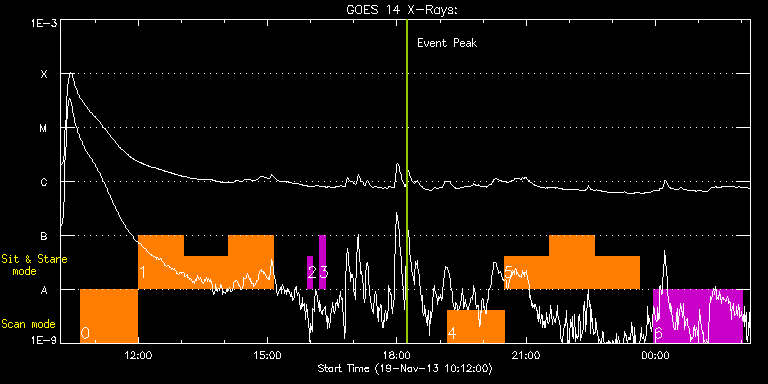 EIS Observation timeline overlay to GOES-Xray curve Code 1" 2" 40" 266" EIS Observations list for this event: STUDY ACRONYM ID DATE OBSERVED DESCRIPTION NOAA# TARGET 0 VHH_SlowARbig_1h23 | 37437 | 2013/11/19 10:40:20 | Observations of propagating disturbanc | 1899 | Active Region TIMELINE ID DATE OBSERVED FITS FILE XCEN (+W/-E) YCEN (+N/-S) DUR ----------------------------------------------------------------------------------------------------------------- 37437 | 2013/11/19 10:40:20.000 | eis_l0_20131119_104020.fits.gz | 160.98 | 54.34 | 1h19m10s 1 vhh_slowar_sas_1h6m | 37438 | 2013/11/19 12:00:02 | Observations of propagating disturbanc | | Active Region TIMELINE ID DATE OBSERVED FITS FILE XCEN (+W/-E) YCEN (+N/-S) DUR ----------------------------------------------------------------------------------------------------------------- 37438 | 2013/11/19 12:00:02.000 | eis_l0_20131119_120002.fits.gz | 170.91 | 111.27 | 1h2m50s 37438 | 2013/11/19 13:02:55.000 | eis_l0_20131119_130255.fits.gz | 180.65 | 111.50 | 1h2m50s 37438 | 2013/11/19 14:05:48.000 | eis_l0_20131119_140548.fits.gz | 190.30 | 111.73 | 1h2m50s 2 regcal017 | 37447 | 2013/11/19 15:56:12 | Flat fields, short exposures | | Engineering TIMELINE ID DATE OBSERVED FITS FILE XCEN (+W/-E) YCEN (+N/-S) DUR ----------------------------------------------------------------------------------------------------------------- 37447 | 2013/11/19 15:56:12.000 | eis_l0_20131119_155612.fits.gz | 221.54 | -13.96 | 6m47s 3 regcal018 | 37448 | 2013/11/19 16:12:12 | Flat fields, long exposures | | Engineering TIMELINE ID DATE OBSERVED FITS FILE XCEN (+W/-E) YCEN (+N/-S) DUR ----------------------------------------------------------------------------------------------------------------- 37448 | 2013/11/19 16:12:12.000 | eis_l0_20131119_161212.fits.gz | 224.08 | -14.12 | 8m8s 4 VHH_SlowARbig_1h23 | 37439 | 2013/11/19 19:10:11 | Observations of propagating disturbanc | | Active Region TIMELINE ID DATE OBSERVED FITS FILE XCEN (+W/-E) YCEN (+N/-S) DUR ----------------------------------------------------------------------------------------------------------------- 37439 | 2013/11/19 19:10:11.000 | eis_l0_20131119_191011.fits.gz | 239.46 | 55.42 | 1h19m10s 5 vhh_slowar_sas_1h6m | 37440 | 2013/11/19 20:29:26 | Observations of propagating disturbanc | | Active Region TIMELINE ID DATE OBSERVED FITS FILE XCEN (+W/-E) YCEN (+N/-S) DUR ----------------------------------------------------------------------------------------------------------------- 37440 | 2013/11/19 20:29:26.000 | eis_l0_20131119_202926.fits.gz | 105.82 | -118.19 | 1h2m46s 37440 | 2013/11/19 21:32:15.000 | eis_l0_20131119_213215.fits.gz | 115.32 | -118.11 | 1h2m46s 37440 | 2013/11/19 22:35:04.000 | eis_l0_20131119_223504.fits.gz | 124.67 | -117.88 | 1h2m46s 6 HPW021_VEL_240x512v1 | 37449 | 2013/11/19 23:57:27 | Observations of returning AR 11875 | | Active Region TIMELINE ID DATE OBSERVED FITS FILE XCEN (+W/-E) YCEN (+N/-S) DUR ----------------------------------------------------------------------------------------------------------------- 37449 | 2013/11/19 23:57:27.000 | eis_l0_20131119_235727.fits.gz | 282.76 | 56.35 | 2h3m47s : Check study information : Download file : View thumbnails For this event, also check for: