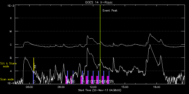 EIS Observation timeline overlay to GOES-Xray curve Code 1" 2" 40" 266" EIS Observations list for this event: STUDY ACRONYM ID DATE OBSERVED DESCRIPTION NOAA# TARGET 0 PRY_slot_contextLITE | 37441 | 2013/11/20 06:20:20 | Daily pointing monitoring | | Active Region TIMELINE ID DATE OBSERVED FITS FILE XCEN (+W/-E) YCEN (+N/-S) DUR ----------------------------------------------------------------------------------------------------------------- 37441 | 2013/11/20 06:20:20.000 | eis_l0_20131120_062020.fits.gz | -15.21 | -0.58 | 2m56s 1 Alignment_266 | 37442 | 2013/11/20 06:23:35 | Daily pointing monitoring | | Quiet Sun TIMELINE ID DATE OBSERVED FITS FILE XCEN (+W/-E) YCEN (+N/-S) DUR ----------------------------------------------------------------------------------------------------------------- 37442 | 2013/11/20 06:23:35.000 | eis_l0_20131120_062335.fits.gz | -132.49 | -0.65 | 1m22s 2 XRT_synop_AIA | 37443 | 2013/11/20 06:26:09 | Daily pointing monitoring | | Quiet Sun TIMELINE ID DATE OBSERVED FITS FILE XCEN (+W/-E) YCEN (+N/-S) DUR ----------------------------------------------------------------------------------------------------------------- 37443 | 2013/11/20 06:26:09.000 | eis_l0_20131120_062609.fits.gz | -132.57 | -0.35 | 10s 3 SK_DEEP_5x512_SLIT1 | 37451 | 2013/11/20 09:24:04 | Synoptic SOT Irradiance Scans | | Quiet Sun TIMELINE ID DATE OBSERVED FITS FILE XCEN (+W/-E) YCEN (+N/-S) DUR ----------------------------------------------------------------------------------------------------------------- 37451 | 2013/11/20 09:24:04.000 | eis_l0_20131120_092404.fits.gz | -13.29 | -926.55 | 10m8s 4 PRY_slot_contextLITE | 37452 | 2013/11/20 09:34:37 | Synoptic SOT Irradiance scans | | Active Region TIMELINE ID DATE OBSERVED FITS FILE XCEN (+W/-E) YCEN (+N/-S) DUR ----------------------------------------------------------------------------------------------------------------- 37452 | 2013/11/20 09:34:37.000 | eis_l0_20131120_093437.fits.gz | -28.43 | -926.47 | 2m57s 5 SK_DEEP_5x512_SLIT1 | 37453 | 2013/11/20 09:53:49 | Synoptic SOT Irradiance Scans | | Quiet Sun TIMELINE ID DATE OBSERVED FITS FILE XCEN (+W/-E) YCEN (+N/-S) DUR ----------------------------------------------------------------------------------------------------------------- 37453 | 2013/11/20 09:53:49.000 | eis_l0_20131120_095349.fits.gz | -13.13 | -846.36 | 4m2s 6 PRY_slot_contextLITE | 37454 | 2013/11/20 10:06:10 | Synoptic SOT Irradiance Scans | | Active Region TIMELINE ID DATE OBSERVED FITS FILE XCEN (+W/-E) YCEN (+N/-S) DUR ----------------------------------------------------------------------------------------------------------------- 37454 | 2013/11/20 10:06:10.000 | eis_l0_20131120_100610.fits.gz | -28.28 | -846.52 | 1m9s 7 SK_DEEP_5x512_SLIT1 | 37455 | 2013/11/20 10:48:50 | Synoptic SOT Irradiance Scans | | Quiet Sun TIMELINE ID DATE OBSERVED FITS FILE XCEN (+W/-E) YCEN (+N/-S) DUR ----------------------------------------------------------------------------------------------------------------- 37455 | 2013/11/20 10:48:50.000 | eis_l0_20131120_104850.fits.gz | -13.13 | -746.48 | 10m7s 8 PRY_slot_contextLITE | 37456 | 2013/11/20 10:59:23 | Synoptic SOT Irradiance Scans | | Active Region TIMELINE ID DATE OBSERVED FITS FILE XCEN (+W/-E) YCEN (+N/-S) DUR ----------------------------------------------------------------------------------------------------------------- 37456 | 2013/11/20 10:59:23.000 | eis_l0_20131120_105923.fits.gz | -28.43 | -746.41 | 2m56s 9 SK_DEEP_5x512_SLIT1 | 37457 | 2013/11/20 11:18:49 | Synoptic SOT Irradiance Scans | | Quiet Sun TIMELINE ID DATE OBSERVED FITS FILE XCEN (+W/-E) YCEN (+N/-S) DUR ----------------------------------------------------------------------------------------------------------------- 37457 | 2013/11/20 11:18:49.000 | eis_l0_20131120_111849.fits.gz | -13.13 | -646.29 | 10m8s 10 PRY_slot_contextLITE | 37458 | 2013/11/20 11:29:23 | Synoptic SOT Irradiance Scans | | Active Region TIMELINE ID DATE OBSERVED FITS FILE XCEN (+W/-E) YCEN (+N/-S) DUR ----------------------------------------------------------------------------------------------------------------- 37458 | 2013/11/20 11:29:23.000 | eis_l0_20131120_112923.fits.gz | -28.36 | -646.37 | 2m56s 11 SK_DEEP_5x512_SLIT1 | 37459 | 2013/11/20 11:48:50 | Synoptic SOT Irradiance Scans | | Quiet Sun TIMELINE ID DATE OBSERVED FITS FILE XCEN (+W/-E) YCEN (+N/-S) DUR ----------------------------------------------------------------------------------------------------------------- 37459 | 2013/11/20 11:48:50.000 | eis_l0_20131120_114850.fits.gz | -13.13 | -546.26 | 10m8s 12 PRY_slot_contextLITE | 37460 | 2013/11/20 11:59:23 | Synoptic SOT Irradiance Scans | | Active Region TIMELINE ID DATE OBSERVED FITS FILE XCEN (+W/-E) YCEN (+N/-S) DUR ----------------------------------------------------------------------------------------------------------------- 37460 | 2013/11/20 11:59:23.000 | eis_l0_20131120_115923.fits.gz | -28.28 | -546.18 | 2m57s 13 SK_DEEP_5x512_SLIT1 | 37461 | 2013/11/20 12:18:50 | Synoptic SOT Irradiance Scans | | Quiet Sun TIMELINE ID DATE OBSERVED FITS FILE XCEN (+W/-E) YCEN (+N/-S) DUR ----------------------------------------------------------------------------------------------------------------- 37461 | 2013/11/20 12:18:50.000 | eis_l0_20131120_121850.fits.gz | -13.13 | -445.45 | 10m7s 14 PRY_slot_contextLITE | 37462 | 2013/11/20 12:29:23 | Synoptic SOT Irradiance Scans | | Active Region TIMELINE ID DATE OBSERVED FITS FILE XCEN (+W/-E) YCEN (+N/-S) DUR ----------------------------------------------------------------------------------------------------------------- 37462 | 2013/11/20 12:29:23.000 | eis_l0_20131120_122923.fits.gz | -28.36 | -445.53 | 2m56s 15 SK_DEEP_5x512_SLIT1 | 37463 | 2013/11/20 12:48:49 | Synoptic SOT Irradiance Scans | | Quiet Sun TIMELINE ID DATE OBSERVED FITS FILE XCEN (+W/-E) YCEN (+N/-S) DUR ---------------------------------------------------------------------------------------------------------------