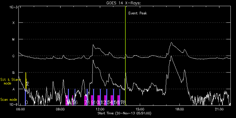 EIS Observation timeline overlay to GOES-Xray curve Code 1" 2" 40" 266" EIS Observations list for this event: STUDY ACRONYM ID DATE OBSERVED DESCRIPTION NOAA# TARGET 0 PRY_slot_contextLITE | 37441 | 2013/11/20 06:20:20 | Daily pointing monitoring | | Active Region TIMELINE ID DATE OBSERVED FITS FILE XCEN (+W/-E) YCEN (+N/-S) DUR ----------------------------------------------------------------------------------------------------------------- 37441 | 2013/11/20 06:20:20.000 | eis_l0_20131120_062020.fits.gz | -15.21 | -0.58 | 2m56s 1 Alignment_266 | 37442 | 2013/11/20 06:23:35 | Daily pointing monitoring | | Quiet Sun TIMELINE ID DATE OBSERVED FITS FILE XCEN (+W/-E) YCEN (+N/-S) DUR ----------------------------------------------------------------------------------------------------------------- 37442 | 2013/11/20 06:23:35.000 | eis_l0_20131120_062335.fits.gz | -132.49 | -0.65 | 1m22s 2 XRT_synop_AIA | 37443 | 2013/11/20 06:26:09 | Daily pointing monitoring | | Quiet Sun TIMELINE ID DATE OBSERVED FITS FILE XCEN (+W/-E) YCEN (+N/-S) DUR ----------------------------------------------------------------------------------------------------------------- 37443 | 2013/11/20 06:26:09.000 | eis_l0_20131120_062609.fits.gz | -132.57 | -0.35 | 10s 3 SK_DEEP_5x512_SLIT1 | 37451 | 2013/11/20 09:24:04 | Synoptic SOT Irradiance Scans | | Quiet Sun TIMELINE ID DATE OBSERVED FITS FILE XCEN (+W/-E) YCEN (+N/-S) DUR ----------------------------------------------------------------------------------------------------------------- 37451 | 2013/11/20 09:24:04.000 | eis_l0_20131120_092404.fits.gz | -13.29 | -926.55 | 10m8s 4 PRY_slot_contextLITE | 37452 | 2013/11/20 09:34:37 | Synoptic SOT Irradiance scans | | Active Region TIMELINE ID DATE OBSERVED FITS FILE XCEN (+W/-E) YCEN (+N/-S) DUR ----------------------------------------------------------------------------------------------------------------- 37452 | 2013/11/20 09:34:37.000 | eis_l0_20131120_093437.fits.gz | -28.43 | -926.47 | 2m57s 5 SK_DEEP_5x512_SLIT1 | 37453 | 2013/11/20 09:53:49 | Synoptic SOT Irradiance Scans | | Quiet Sun TIMELINE ID DATE OBSERVED FITS FILE XCEN (+W/-E) YCEN (+N/-S) DUR ----------------------------------------------------------------------------------------------------------------- 37453 | 2013/11/20 09:53:49.000 | eis_l0_20131120_095349.fits.gz | -13.13 | -846.36 | 4m2s 6 PRY_slot_contextLITE | 37454 | 2013/11/20 10:06:10 | Synoptic SOT Irradiance Scans | | Active Region TIMELINE ID DATE OBSERVED FITS FILE XCEN (+W/-E) YCEN (+N/-S) DUR ----------------------------------------------------------------------------------------------------------------- 37454 | 2013/11/20 10:06:10.000 | eis_l0_20131120_100610.fits.gz | -28.28 | -846.52 | 1m9s 7 SK_DEEP_5x512_SLIT1 | 37455 | 2013/11/20 10:48:50 | Synoptic SOT Irradiance Scans | | Quiet Sun TIMELINE ID DATE OBSERVED FITS FILE XCEN (+W/-E) YCEN (+N/-S) DUR ----------------------------------------------------------------------------------------------------------------- 37455 | 2013/11/20 10:48:50.000 | eis_l0_20131120_104850.fits.gz | -13.13 | -746.48 | 10m7s 8 PRY_slot_contextLITE | 37456 | 2013/11/20 10:59:23 | Synoptic SOT Irradiance Scans | | Active Region TIMELINE ID DATE OBSERVED FITS FILE XCEN (+W/-E) YCEN (+N/-S) DUR ----------------------------------------------------------------------------------------------------------------- 37456 | 2013/11/20 10:59:23.000 | eis_l0_20131120_105923.fits.gz | -28.43 | -746.41 | 2m56s 9 SK_DEEP_5x512_SLIT1 | 37457 | 2013/11/20 11:18:49 | Synoptic SOT Irradiance Scans | | Quiet Sun TIMELINE ID DATE OBSERVED FITS FILE XCEN (+W/-E) YCEN (+N/-S) DUR ----------------------------------------------------------------------------------------------------------------- 37457 | 2013/11/20 11:18:49.000 | eis_l0_20131120_111849.fits.gz | -13.13 | -646.29 | 10m8s 10 PRY_slot_contextLITE | 37458 | 2013/11/20 11:29:23 | Synoptic SOT Irradiance Scans | | Active Region TIMELINE ID DATE OBSERVED FITS FILE XCEN (+W/-E) YCEN (+N/-S) DUR ----------------------------------------------------------------------------------------------------------------- 37458 | 2013/11/20 11:29:23.000 | eis_l0_20131120_112923.fits.gz | -28.36 | -646.37 | 2m56s 11 SK_DEEP_5x512_SLIT1 | 37459 | 2013/11/20 11:48:50 | Synoptic SOT Irradiance Scans | | Quiet Sun TIMELINE ID DATE OBSERVED FITS FILE XCEN (+W/-E) YCEN (+N/-S) DUR ----------------------------------------------------------------------------------------------------------------- 37459 | 2013/11/20 11:48:50.000 | eis_l0_20131120_114850.fits.gz | -13.13 | -546.26 | 10m8s 12 PRY_slot_contextLITE | 37460 | 2013/11/20 11:59:23 | Synoptic SOT Irradiance Scans | | Active Region TIMELINE ID DATE OBSERVED FITS FILE XCEN (+W/-E) YCEN (+N/-S) DUR ----------------------------------------------------------------------------------------------------------------- 37460 | 2013/11/20 11:59:23.000 | eis_l0_20131120_115923.fits.gz | -28.28 | -546.18 | 2m57s 13 SK_DEEP_5x512_SLIT1 | 37461 | 2013/11/20 12:18:50 | Synoptic SOT Irradiance Scans | | Quiet Sun TIMELINE ID DATE OBSERVED FITS FILE XCEN (+W/-E) YCEN (+N/-S) DUR ----------------------------------------------------------------------------------------------------------------- 37461 | 2013/11/20 12:18:50.000 | eis_l0_20131120_121850.fits.gz | -13.13 | -445.45 | 10m7s 14 PRY_slot_contextLITE | 37462 | 2013/11/20 12:29:23 | Synoptic SOT Irradiance Scans | | Active Region TIMELINE ID DATE OBSERVED FITS FILE XCEN (+W/-E) YCEN (+N/-S) DUR ----------------------------------------------------------------------------------------------------------------- 37462 | 2013/11/20 12:29:23.000 | eis_l0_20131120_122923.fits.gz | -28.36 | -445.53 | 2m56s 15 SK_DEEP_5x512_SLIT1 | 37463 | 2013/11/20 12:48:49 | Synoptic SOT Irradiance Scans | | Quiet Sun TIMELINE ID DATE OBSERVED FITS FILE XCEN (+W/-E) YCEN (+N/-S) DUR ---------------------------------------------------------------------------------------------------------------